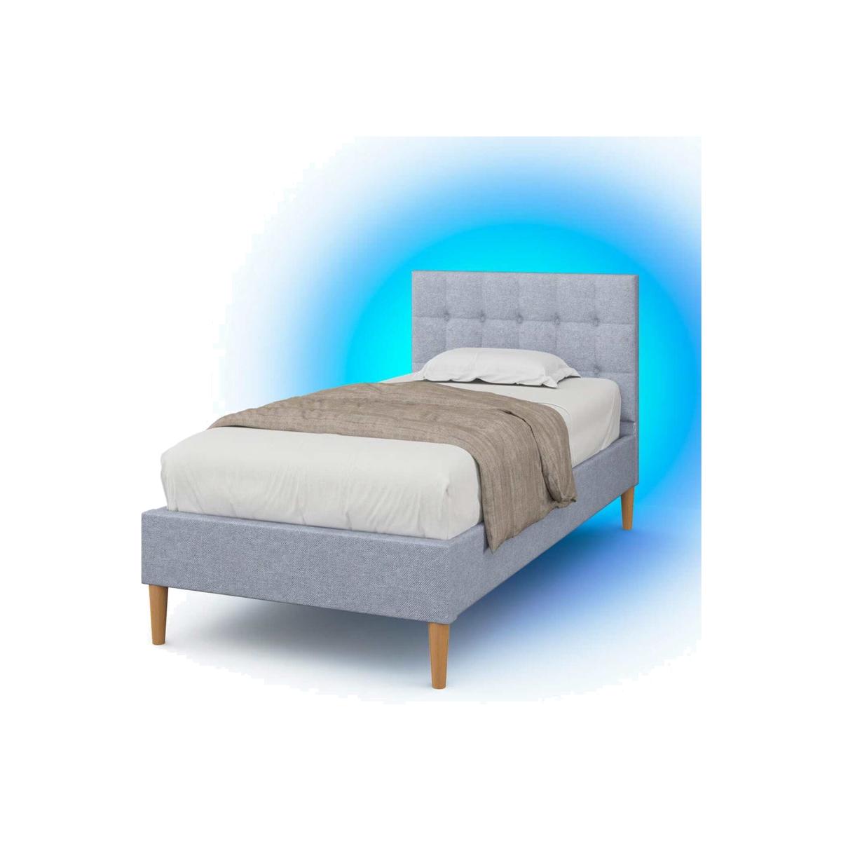 At first glance our Torton fabric bed is a pretty normal classic looking bed frame... but it has a secret weapon - a backlit multi-colour LED headboard! Bringing fun and ambience to your bedroom, whilst retaining style with a classic design. The LED headboard is controlled via a wireless remote control with 15 different colours and multiple functions to choose from depending on your mood. The low footboard design helps make the room look and feel bigger, whilst the lovely padded and tufted headboard gives you a place to rest your head and gives the room a visual focal point. Upholstered in grey linen style fabric for versatility, and will compliment any home decor. The frame is fitted with solid slats for durability.