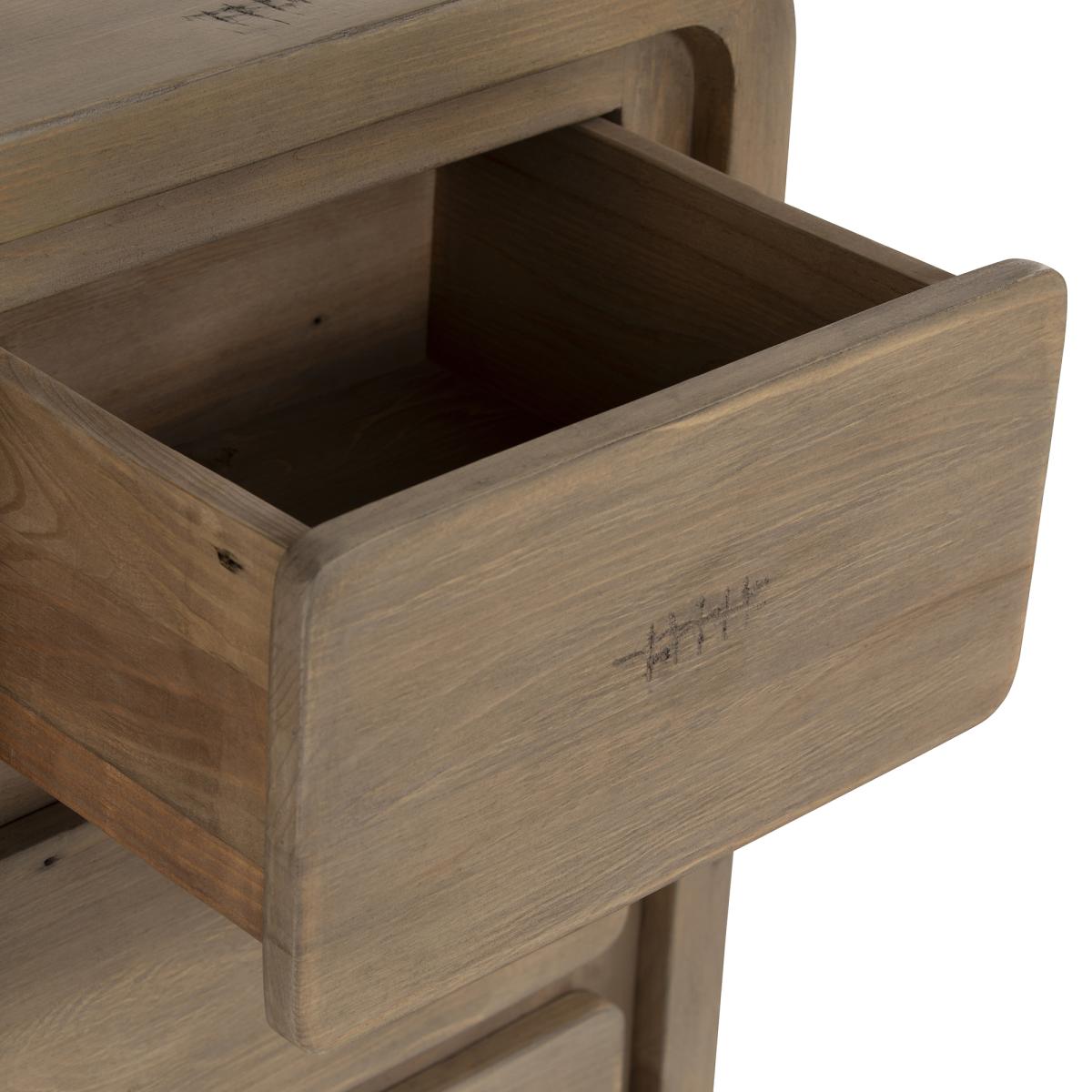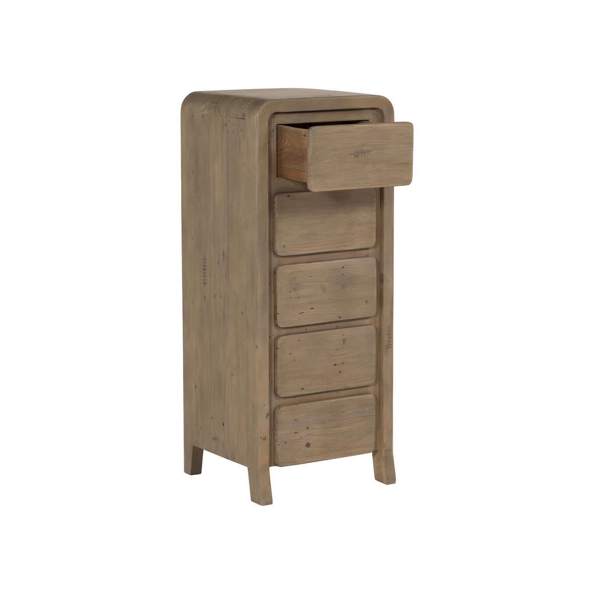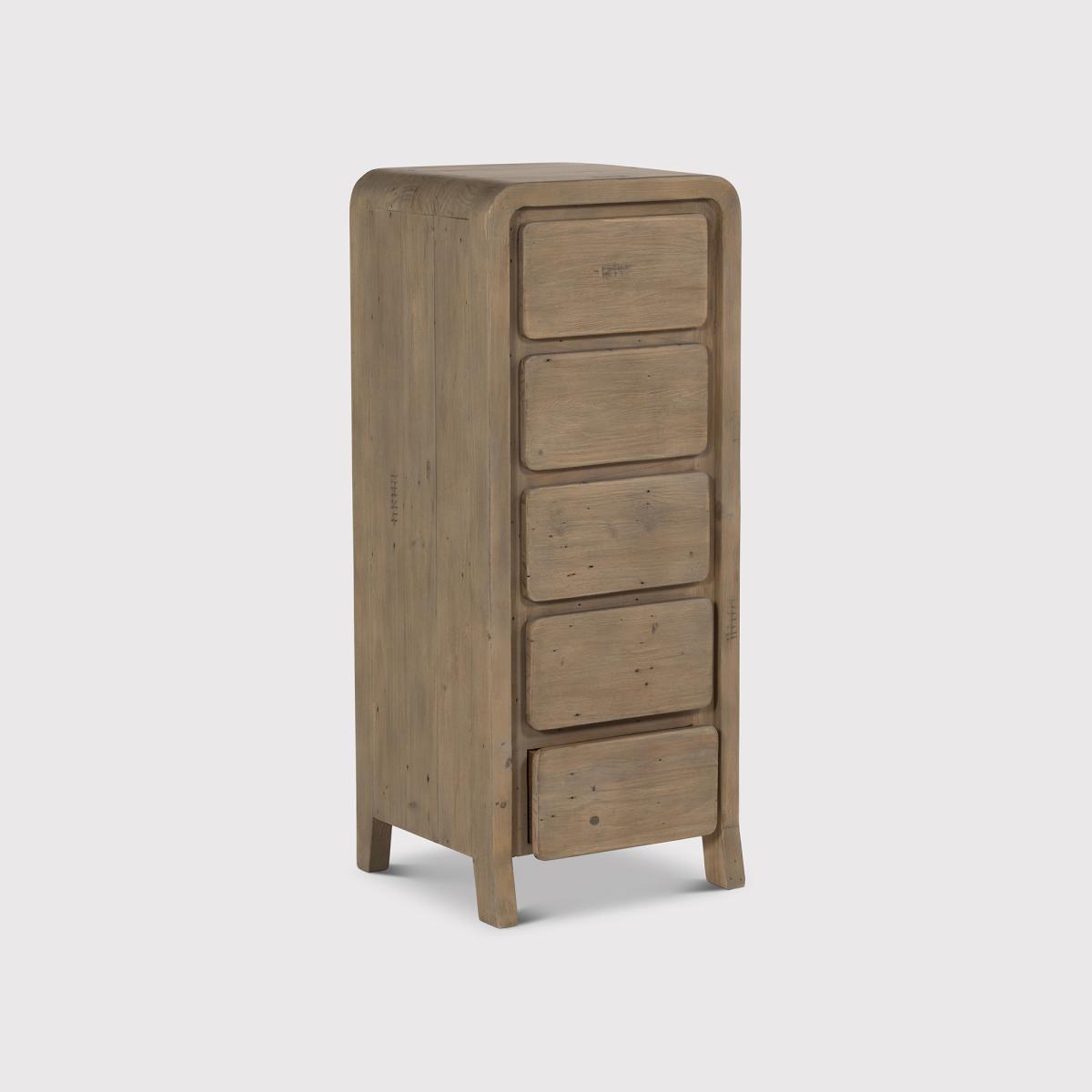 Constructed from reclaimed wood, the Tosca 5 Drawer Tall Cabinet stands as a testament to sustainable elegance. Boasting a scrubbed teak finish, each piece radiates a unique, weathered allure that enhances the intrinsic beauty of the wood. Housing five deep drawers, this tall cabinet seamlessly combines practicality with style, offering generous storage for your essentials