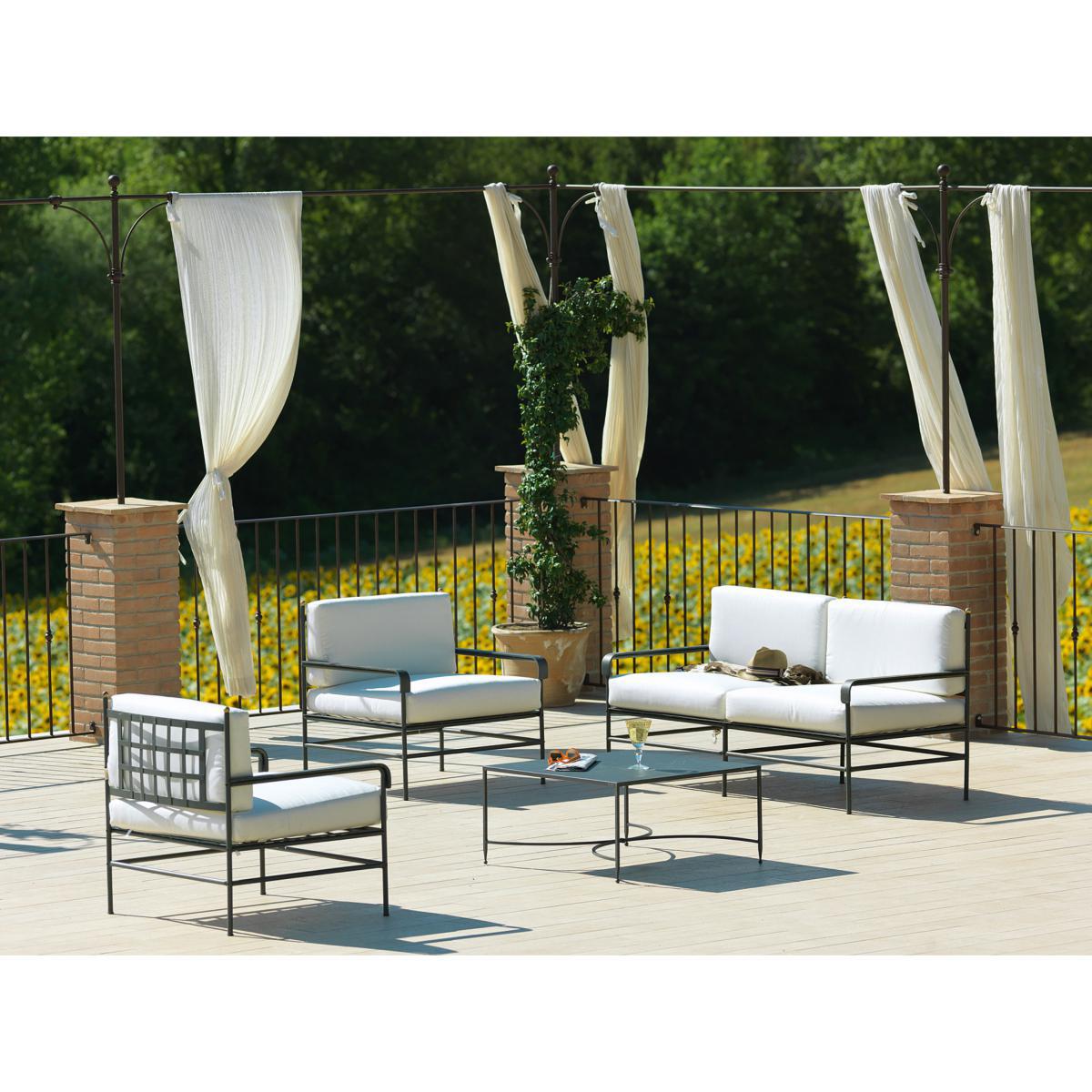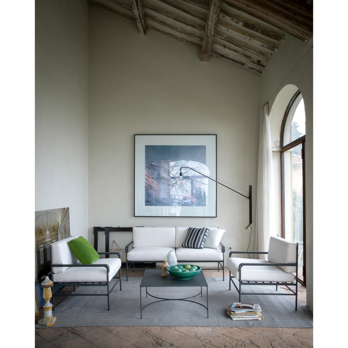 A timeless and elegant classic… The discipline of the geometric shapes of the Toscana collection is softened by stunning, soft cushions made with acrylic fabric. The structure is made in graphite grey galvanised iron. The elegant grid pattern of the seats and backrests is made using stainless steel: this geometric pattern adds a graphical dimension to seating.