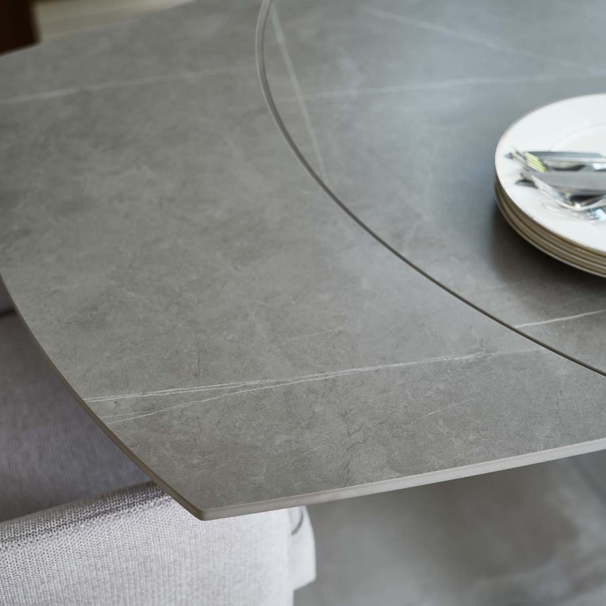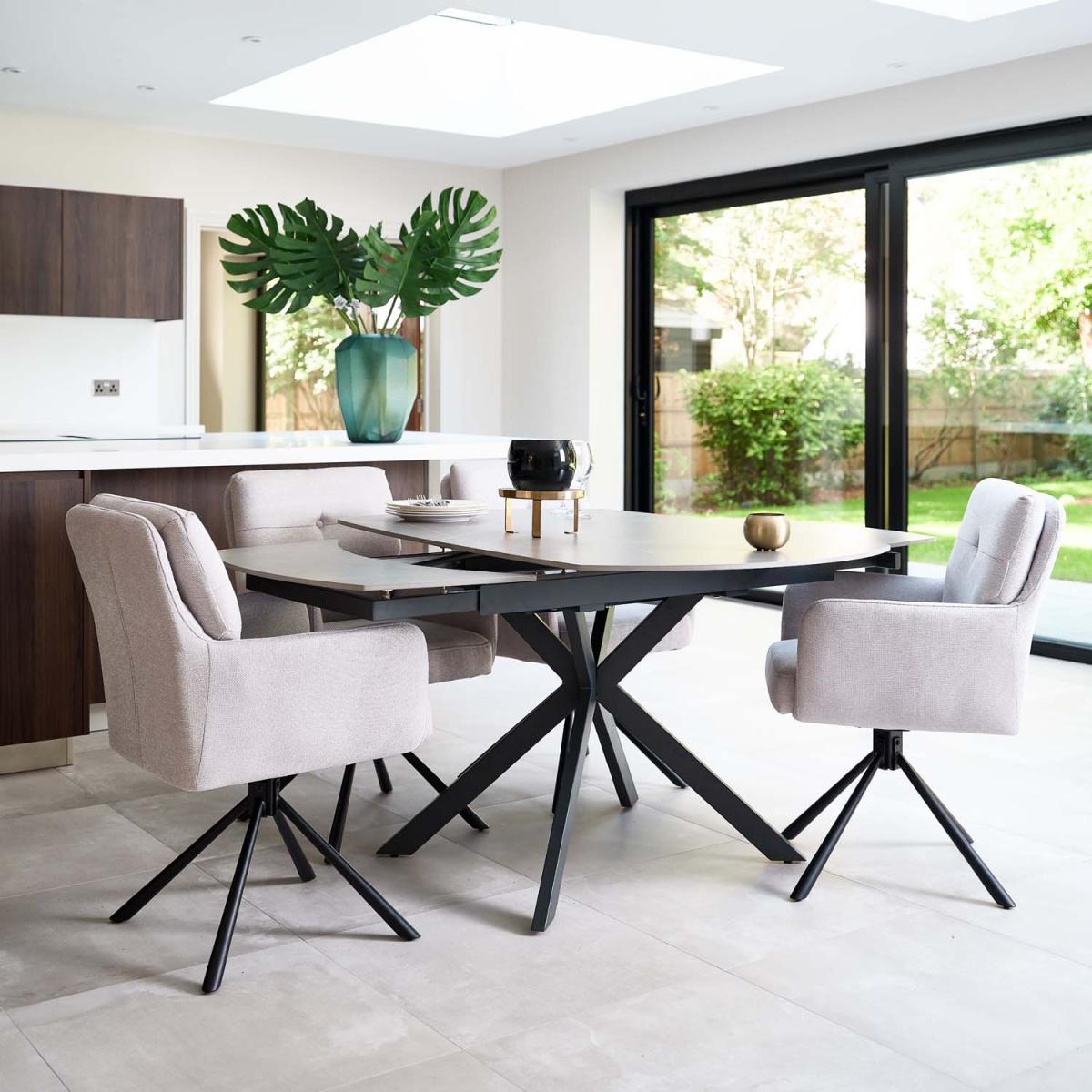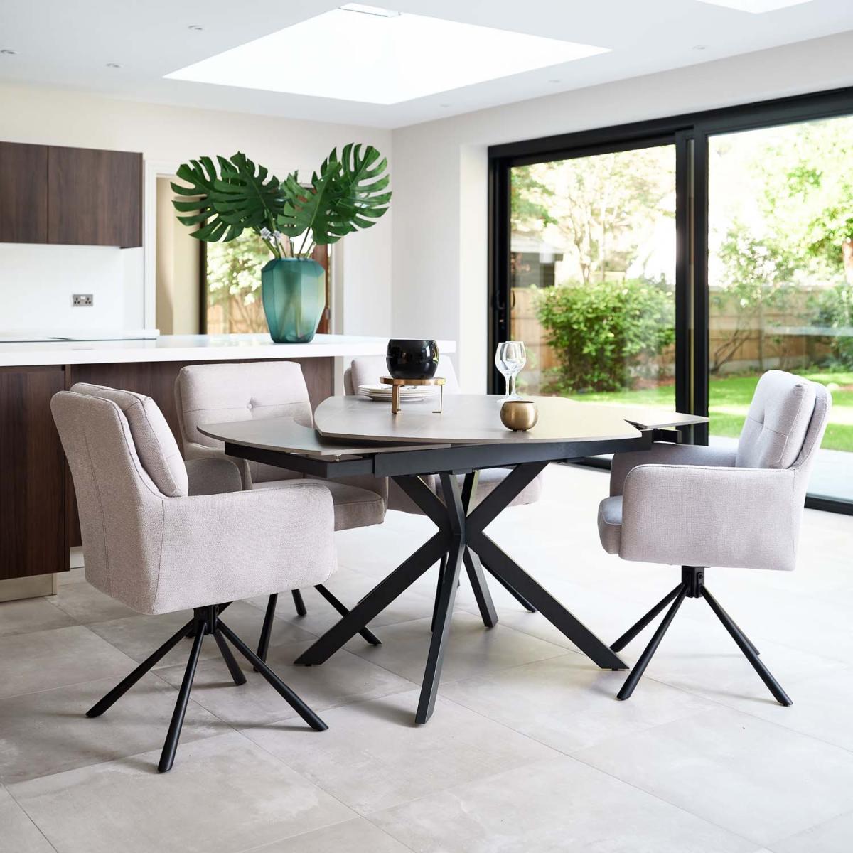 The Toscana Motion Table is the quintessential family extending dining table. Its grey sintered stone top and matching dark grey starburst metal legs give it a modern edge that is only accentuated by the rotating function required for extension, allowing you to seat more people. This level of practicality is further elevated by the ability to easily wipe the table clean, as well as masking signs of damage that may occur over time, making it the perfect addition to a family dining room.