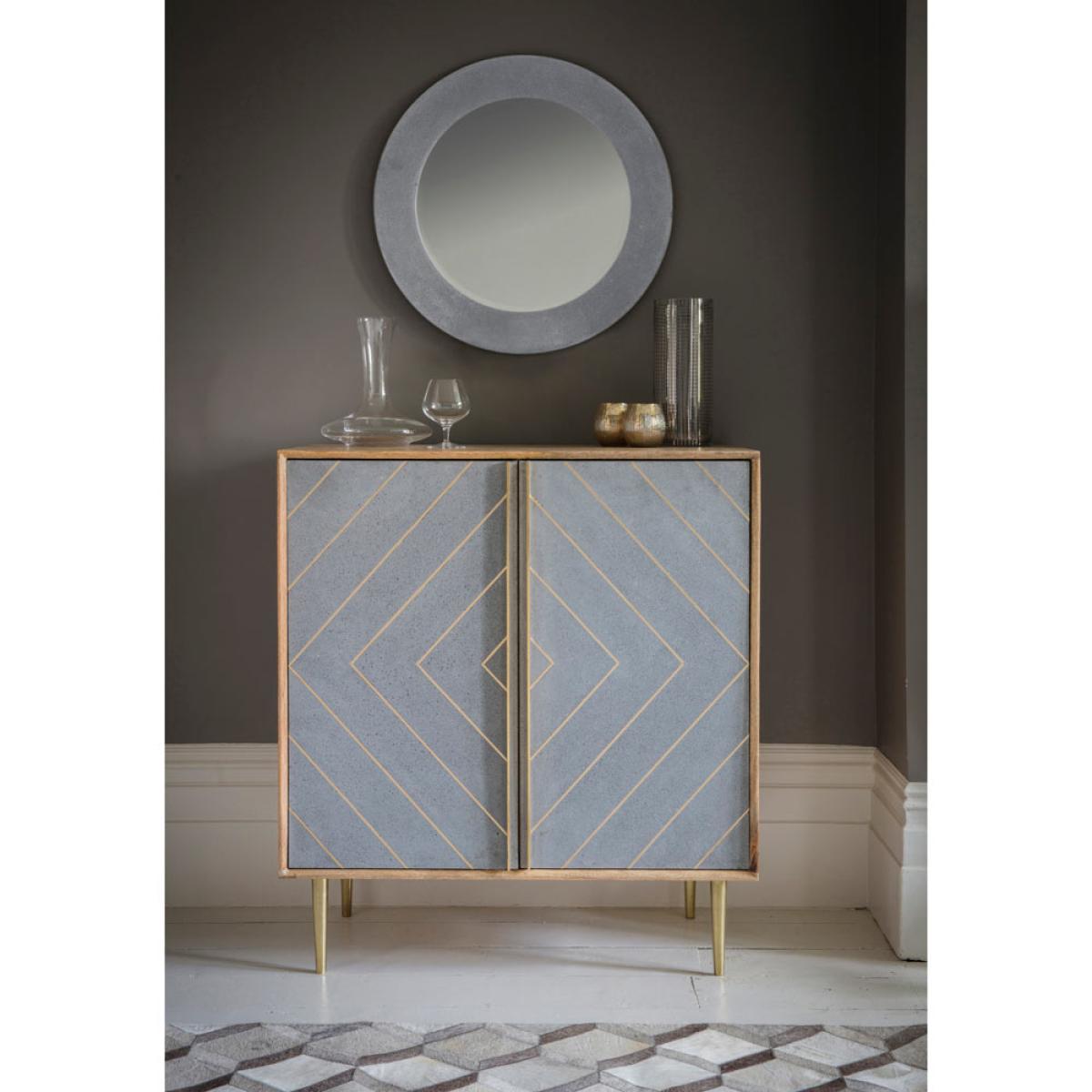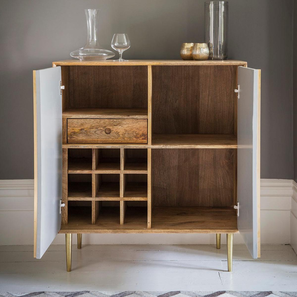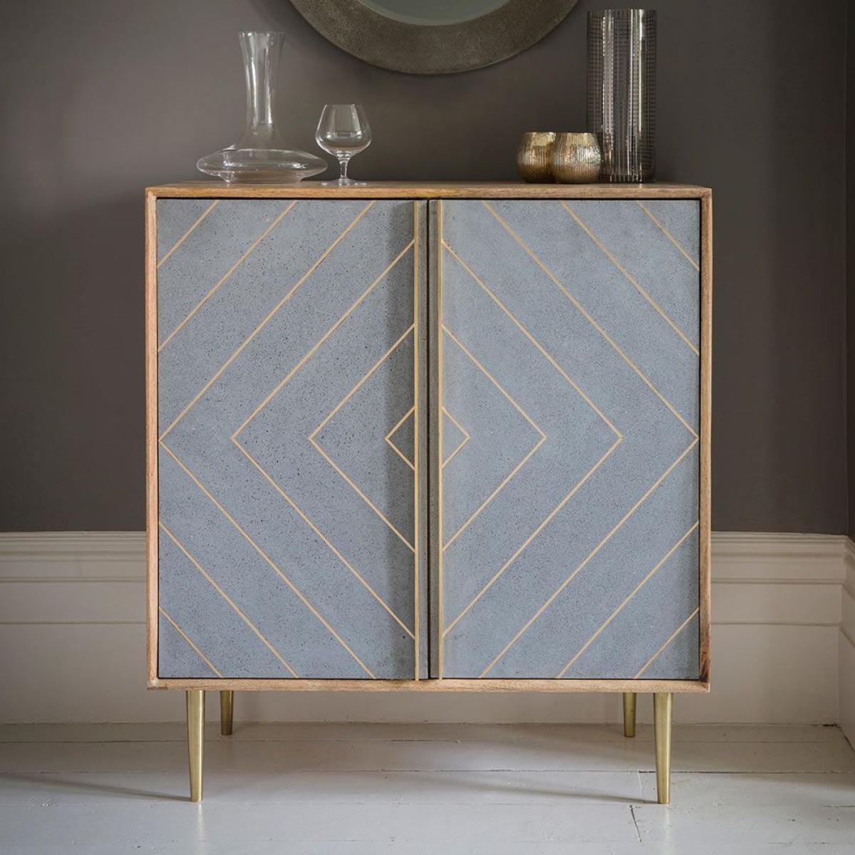 Perfect for entertaining at home, the Toshi Bar Cabinet has everything you need for pre and post-dinner drinks. A mango wood drinks cabinet with a beautiful cement finish to the front and stunning brass inlay. Combining the raw industrial trend with a luxe look, this bar cabinet will complement any interior and comes with brass handles for a co-ordinated finish. With plenty of storage space inside, it offers two generously sized shelf areas along with a handy drawer and bottle rack. Whether you prefer to have your own relaxing time with a glass of your favourite drink or have a designated party zone in your home, our mango wood drinks cabinet is an ideal option.