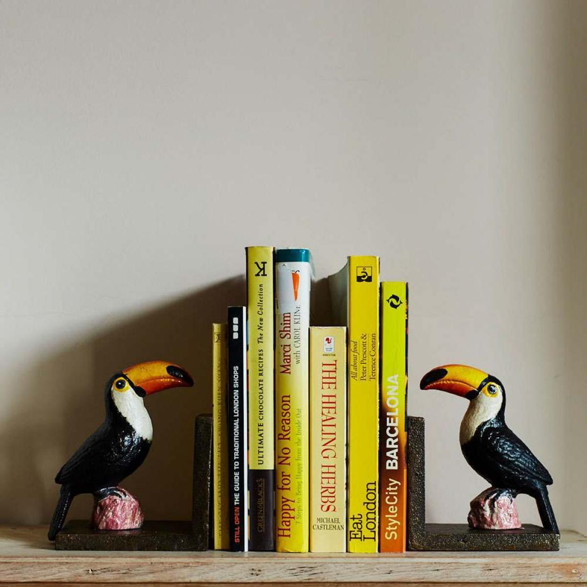 These beautifully painted cast iron toucan bookends will keep your book shelf style in order.