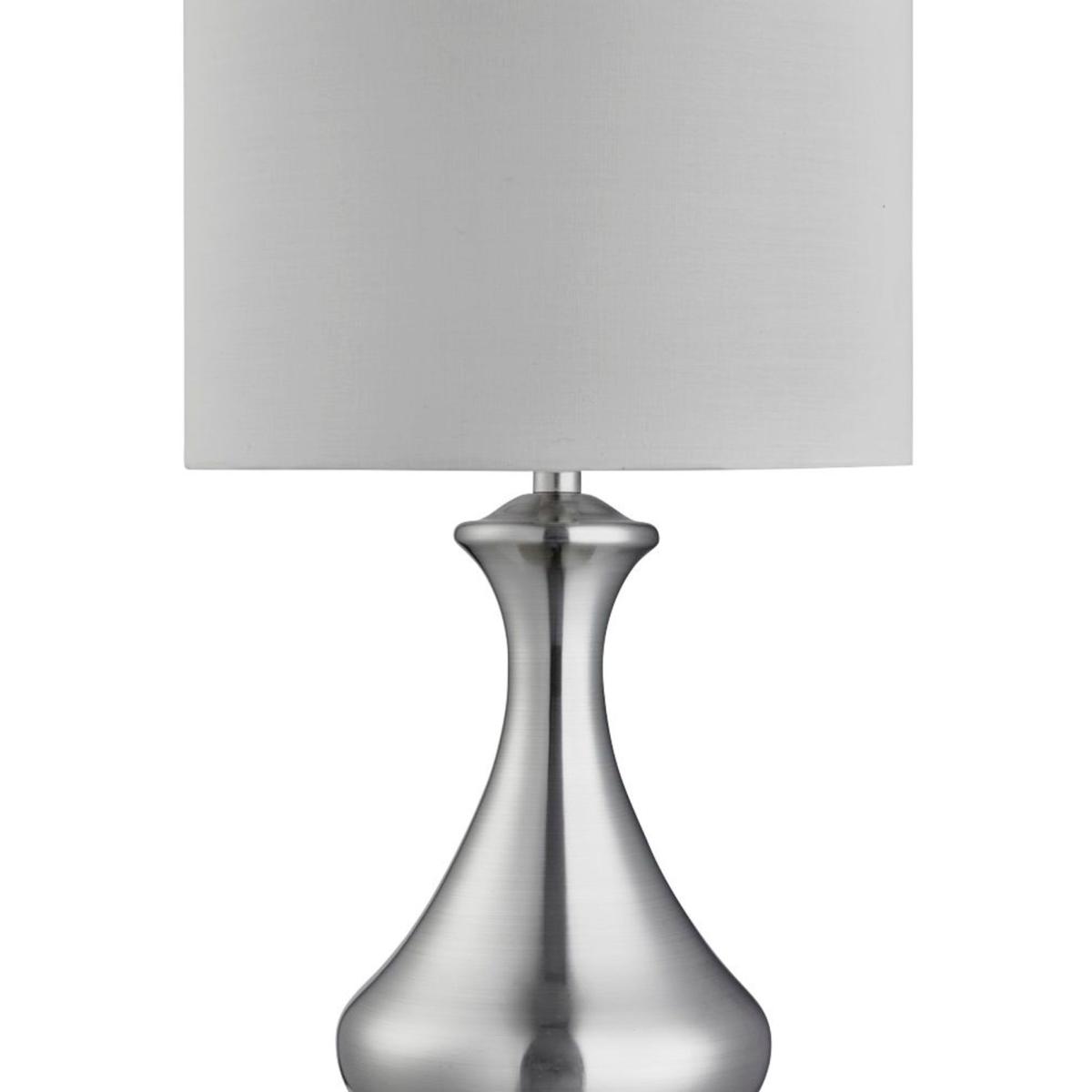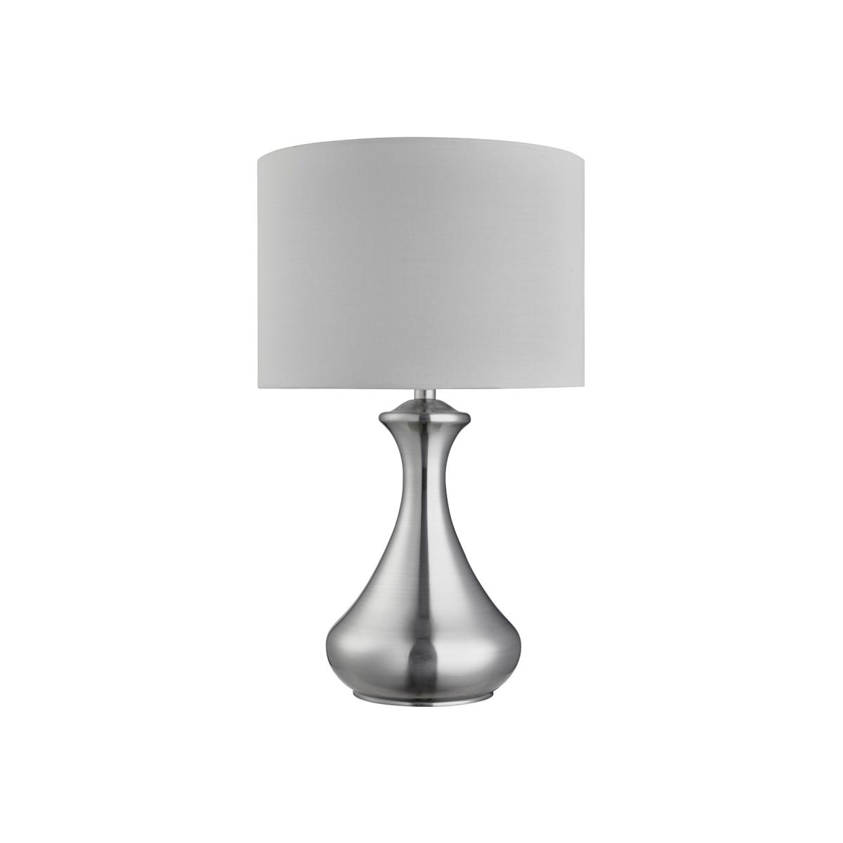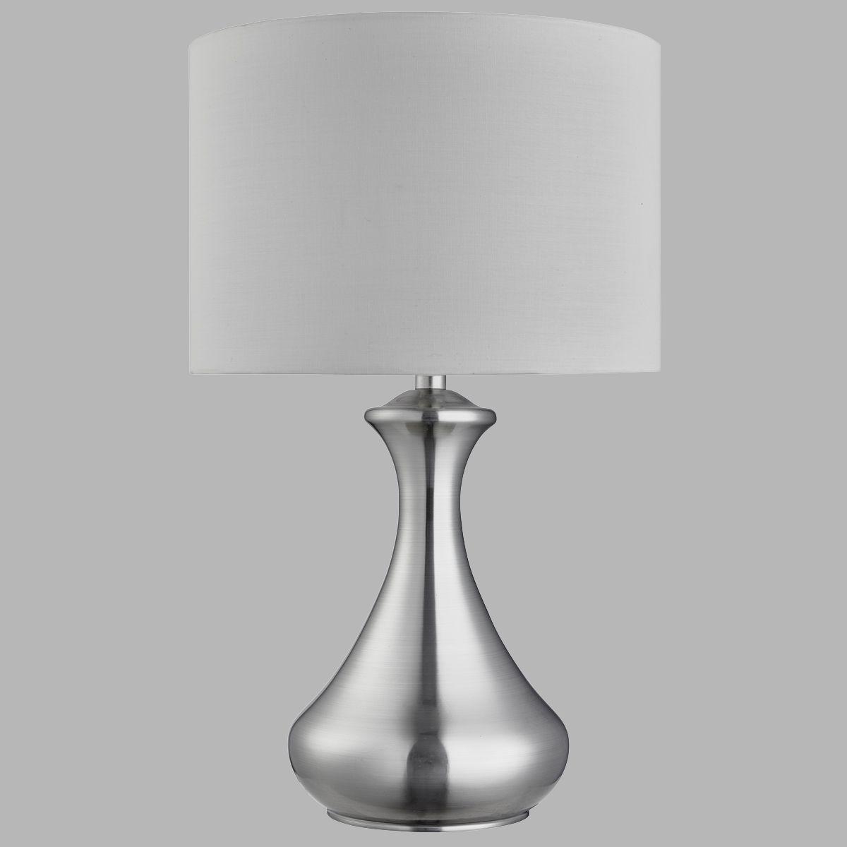 This Satin Silver Touch Table Lamp Complete with White Fabric Shade looks modern and stylish in any corner of your home. The sleek satin silver finish, curved base complements the understated white fabric shade making this table lamp a real statement lighting piece. It's also touch sensitive, with low, medium and high light settings, which is perfect for a bedside table in any bedroom. This Satin Silver Touch Table Lamp Complete with White Fabric Shade looks modern and stylish in any corner of your home. The sleek satin silver finish, curved base complements the understated white fabric shade making this table lamp a real statement lighting piece. It's also touch sensitive, with low, medium and high light settings, which is perfect for a bedside table in any bedroom.