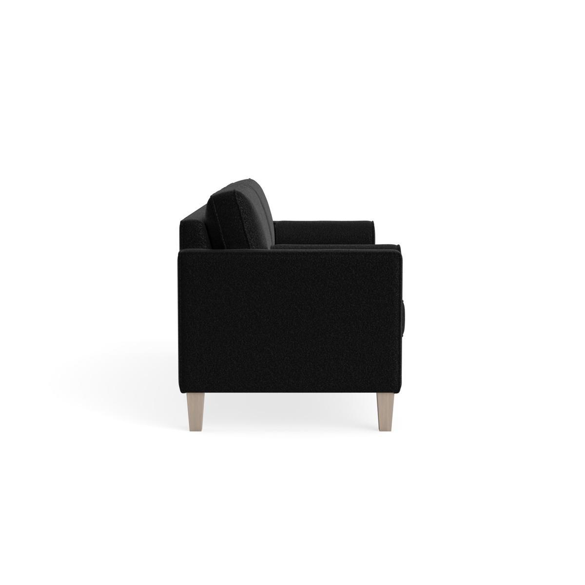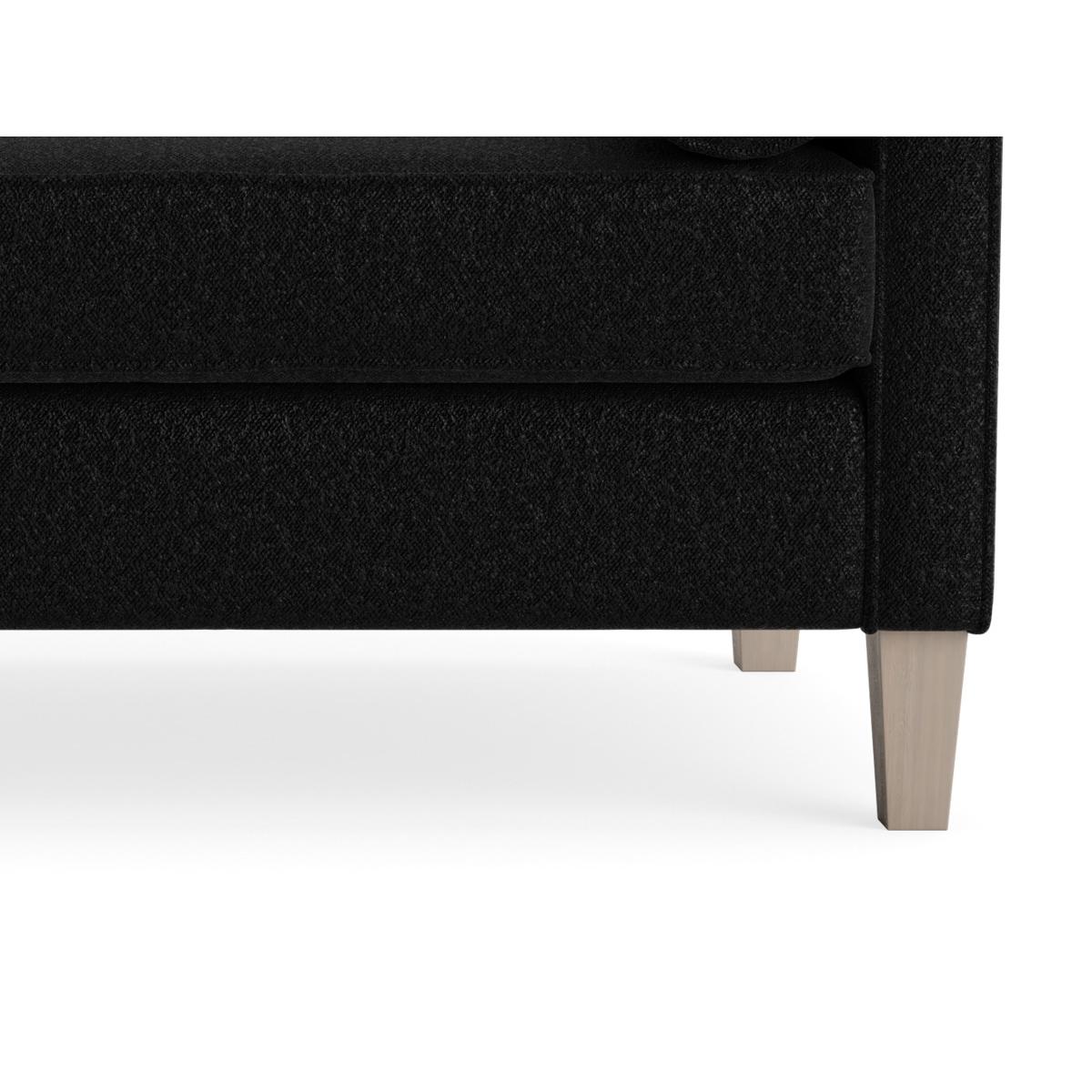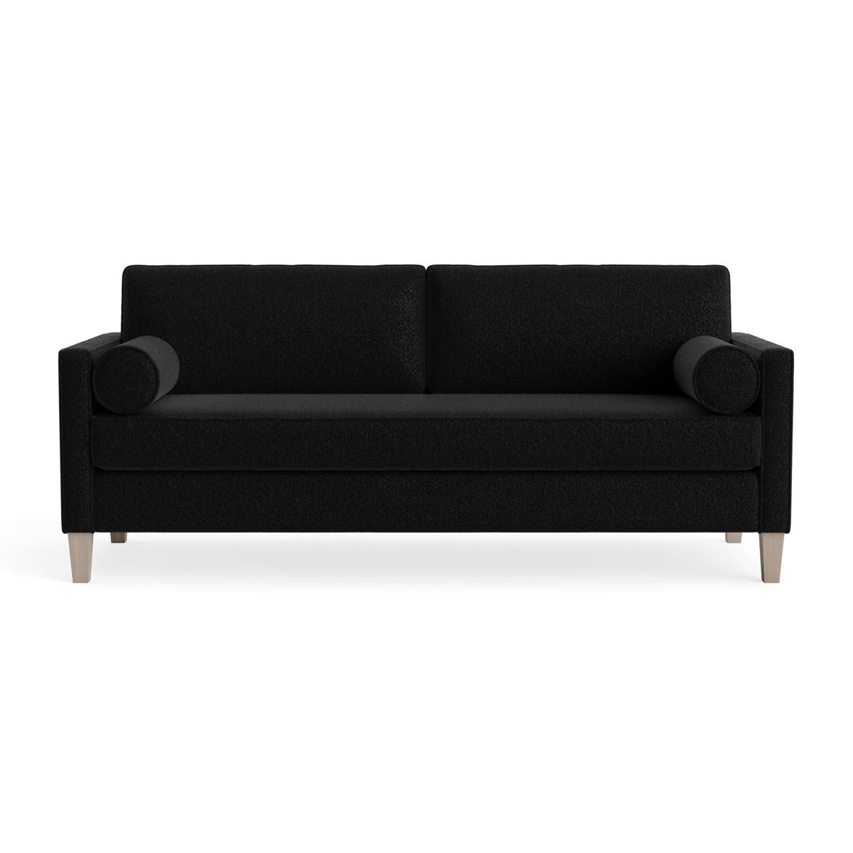 Bolster style cushions add a classical elegance to the architectural lines of our Toulon range of bespoke living room furniture. The sofa has a sculptural profile led by a mid-century aesthetic which is revealed in the slender square lines and tapered wooden legs. Round bolster cushions set inside each arm are a stylish refinement. Elegant piping provides a sophisticated finish. Promising the same handcrafted premium quality of all our made to order ranges, the Toulon sofa is a statement piece that can hold its own in formal settings or add a touch of gravity to laid back interiors. The Toulon range includes two seater and three seater sofas, a loveseat and an ottoman. Our Toulon collection can be upholstered in a choice of 34 distinctive shades and six fabrics to suit your style. Read our Upholstery FAQs View our full Upholstery Terms and Conditions