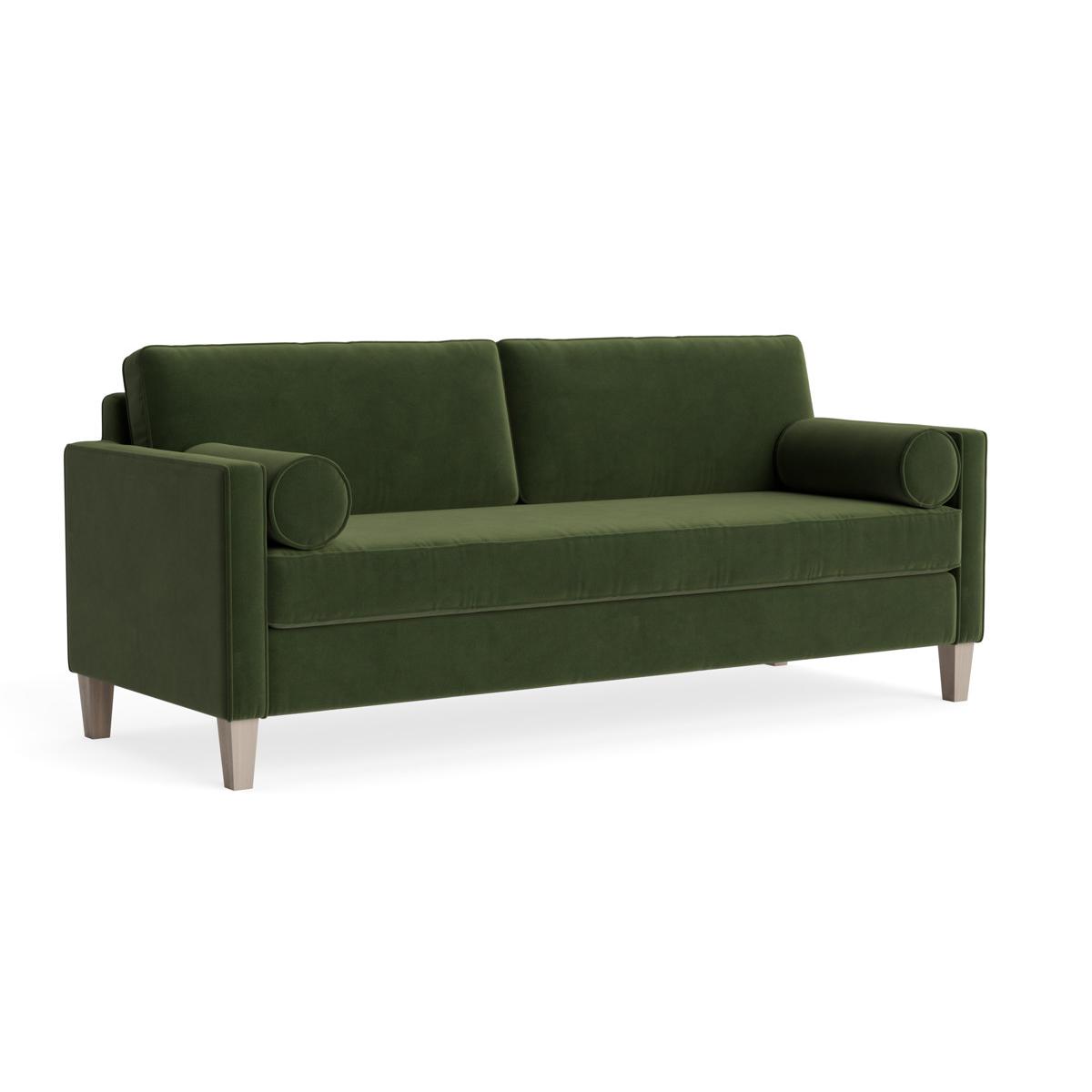 Bolster style cushions add a classical elegance to the architectural lines of our Toulon range of bespoke living room furniture. The sofa has a sculptural profile led by a mid-century aesthetic which is revealed in the slender square lines and tapered wooden legs. Round bolster cushions set inside each arm are a stylish refinement. Elegant piping provides a sophisticated finish. Promising the same handcrafted premium quality of all our made to order ranges, the Toulon sofa is a statement piece that can hold its own in formal settings or add a touch of gravity to laid back interiors. The Toulon range includes two seater and three seater sofas, a loveseat and an ottoman. Our Toulon collection can be upholstered in a choice of 34 distinctive shades and six fabrics to suit your style. Read our Upholstery FAQs View our full Upholstery Terms and Conditions
