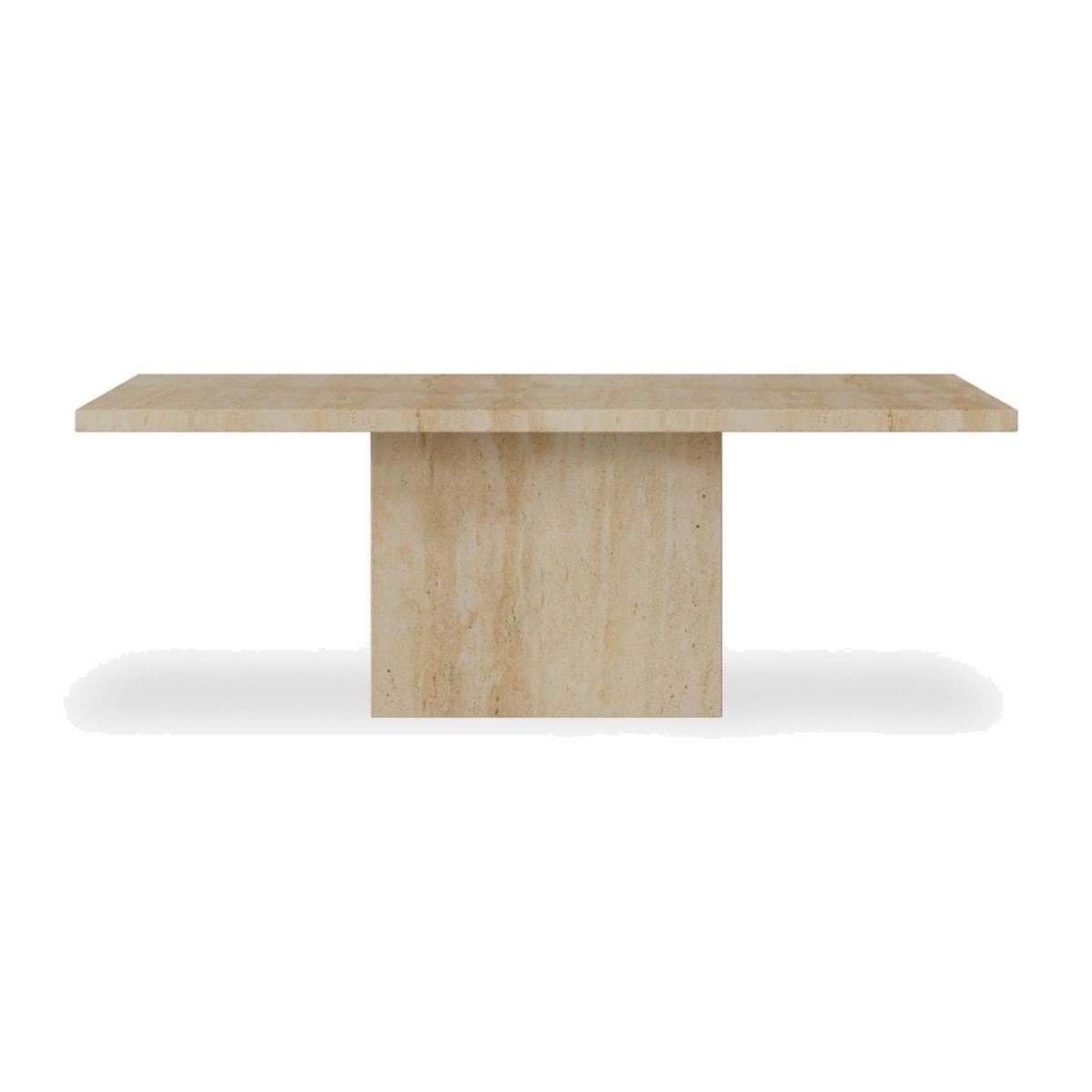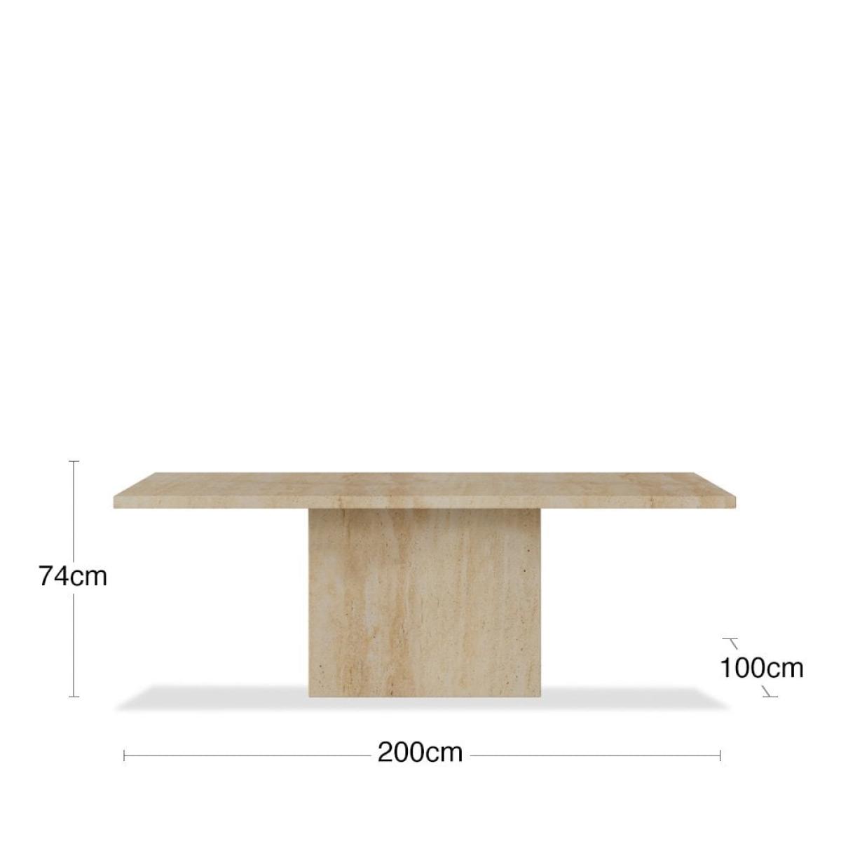 The Toulouse Travertine Dining Table is the showstopping centrepiece every dining space desires. Crafted from natural travertine stone for refined Italian design, the Toulouse is guaranteed to be the talk of the table. The central pillared base and larger than average rectangular top gives that extra spacious dining experience and allows you to fit in any extra unexpected guests. This sculptural timeless design is suitable for up to 8-10 people. The Toulouse is handcrafted from natural European stone, making each piece unique with naturally occurring texture, pattern, and colour. These variations include small concaves within the travertine surface, and should be seen as part of the beauty of the design that makes this a truly one-of-a-kind piece.