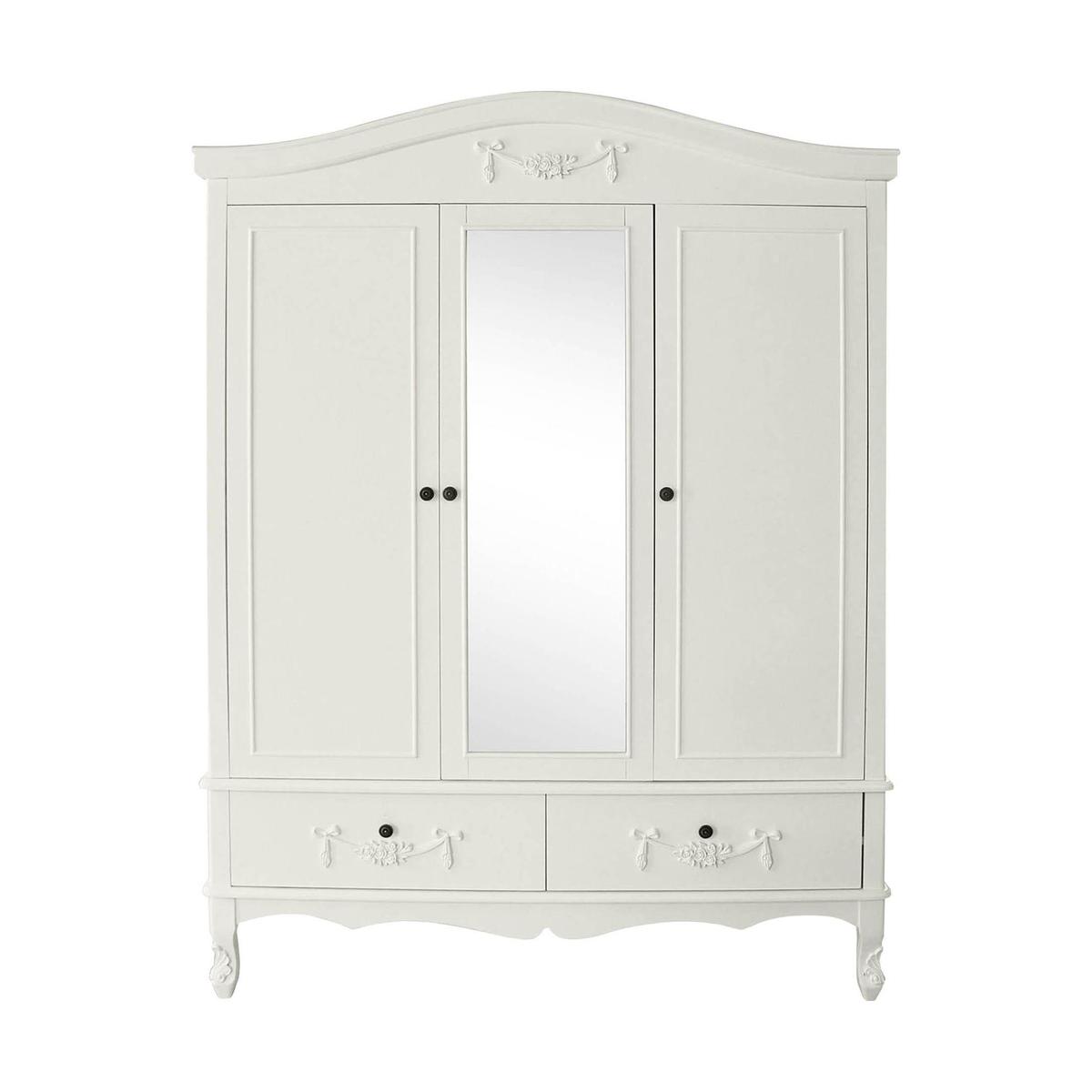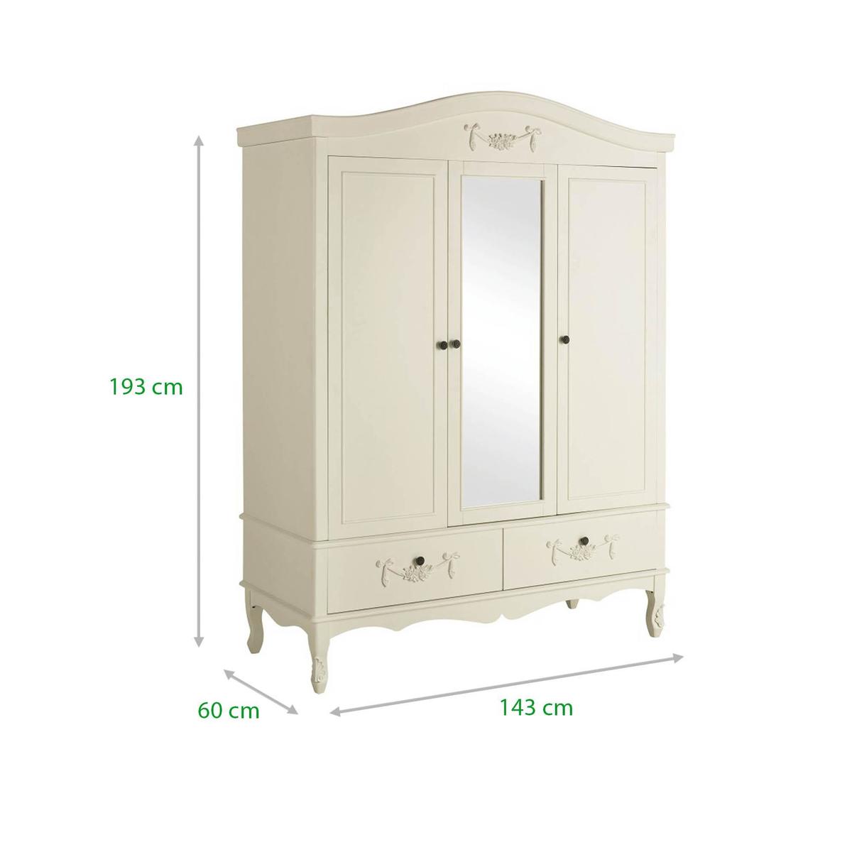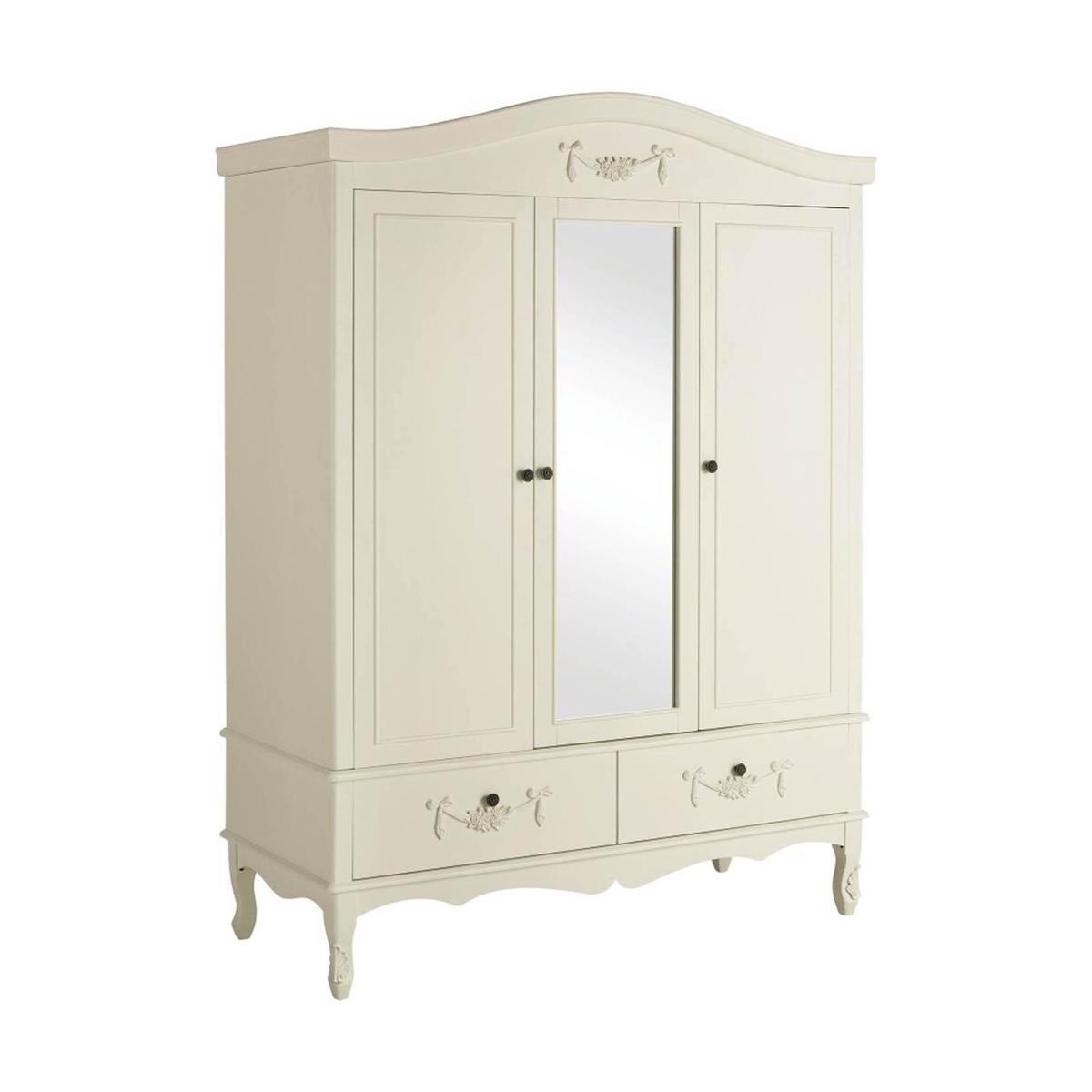 Dunelm Exclusive - Designed and Developed by Dunelm Featuring a French-inspired design with ornate floral detailing, the Toulouse range boasts a vintage look, with a distressed off-white finish. Featuring curved legs, this self-assembly triple wardrobe will add an elegant touch to any room. Complete with two spacious drawers with complementing bronze, ornate handles, this triple wardrobe is designed with three doors and one handy mirror. The three doors open to reveal a generous amount of storage, with two hanging spaces inside. The Toulouse Triple Wardrobe has been crafted with a solid pine frame and legs for durability. This Range is also available in [Silver](https://www.dunelm.com/category/home-and-furniture/furniture/shop-by-collection/toulouse-furniture-collection?f_attributes.objDunelmsku.colourGroup=Silver)