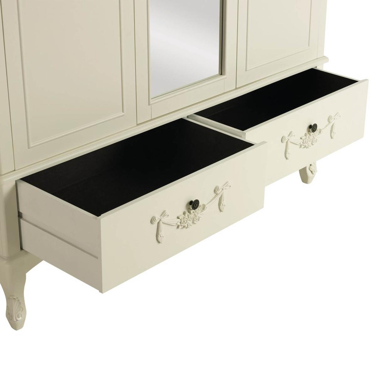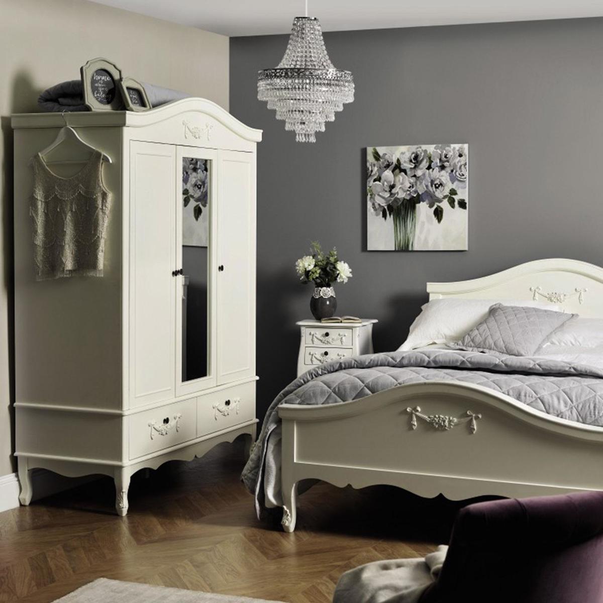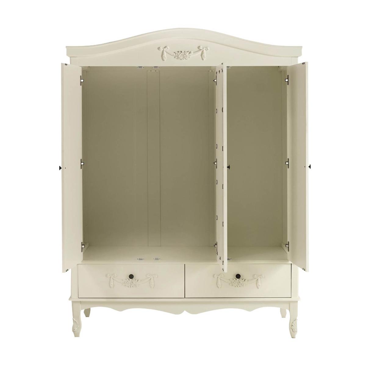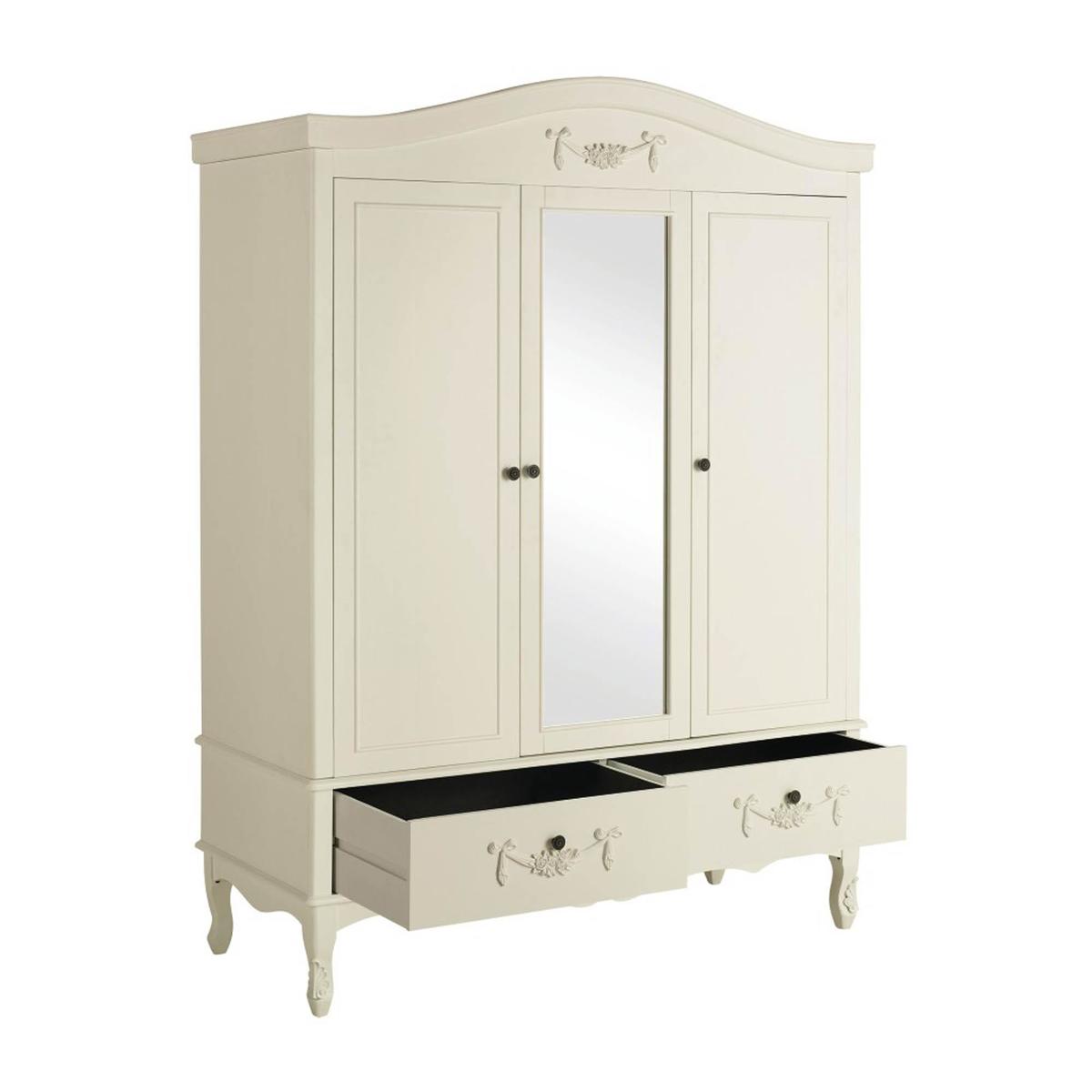 Dunelm Exclusive - Designed and Developed by Dunelm Featuring a French-inspired design with ornate floral detailing, the Toulouse range boasts a vintage look, with a distressed off-white finish. Featuring curved legs, this self-assembly triple wardrobe will add an elegant touch to any room. Complete with two spacious drawers with complementing bronze, ornate handles, this triple wardrobe is designed with three doors and one handy mirror. The three doors open to reveal a generous amount of storage, with two hanging spaces inside. The Toulouse Triple Wardrobe has been crafted with a solid pine frame and legs for durability. This Range is also available in [Silver](https://www.dunelm.com/category/home-and-furniture/furniture/shop-by-collection/toulouse-furniture-collection?f_attributes.objDunelmsku.colourGroup=Silver)