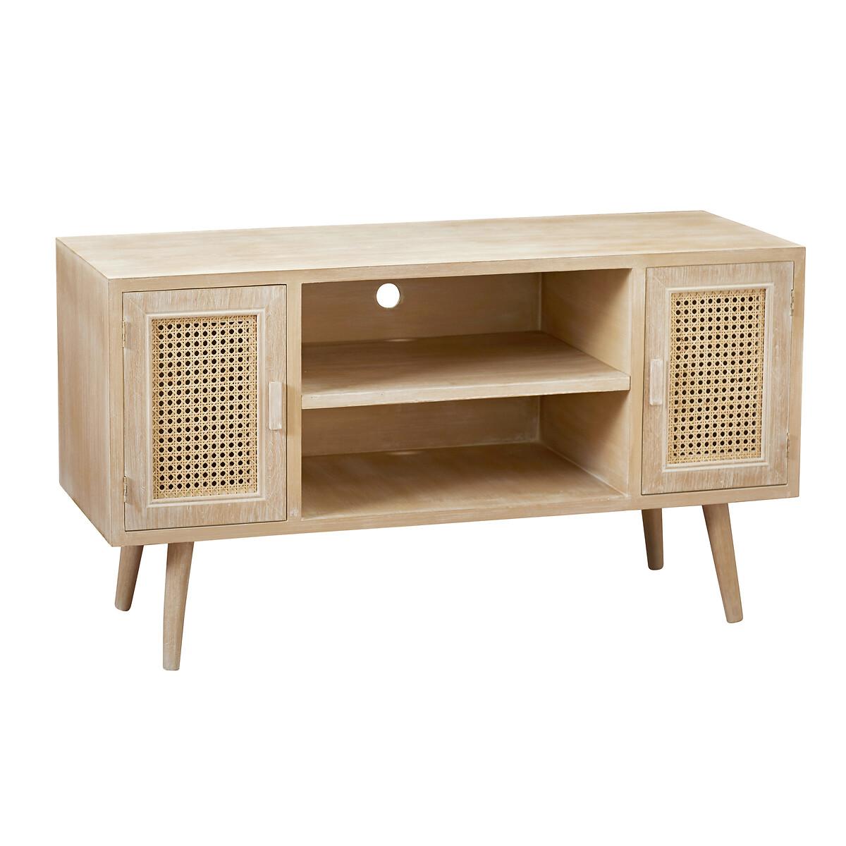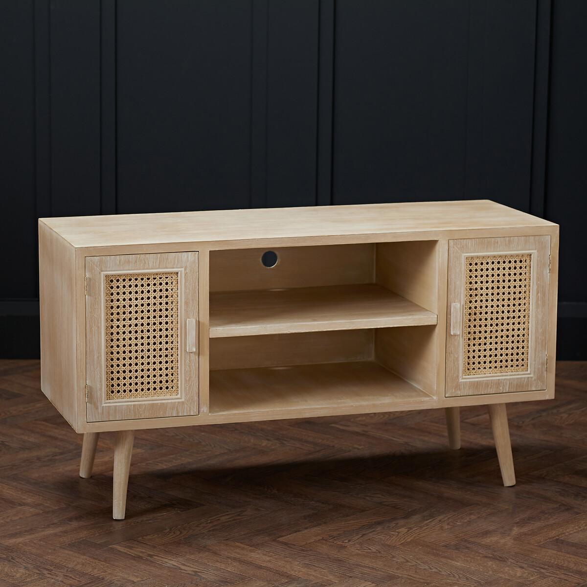 Very much on trend, this features a light washed oak effect surface and rattan style panels. The versatile shade of the oak makes this the perfect asset to any room of your home. With plenty of features for storage, the opportunities are endless!Product details- 2 cupboards with shelves- Central shelf- Rattan style panels - Cable tidy- Assembly required Product Dimensions- L41 x W110 x H61cm. Please note: this product cannot be be delivered to all Offshore Islands Northern Ireland or Republic of Ireland. This product will be dispatched by one of our trusted suppliers. You’ll be contacted by their selected courier about your delivery.