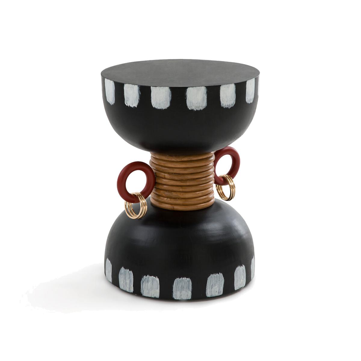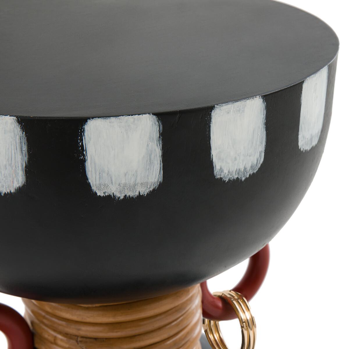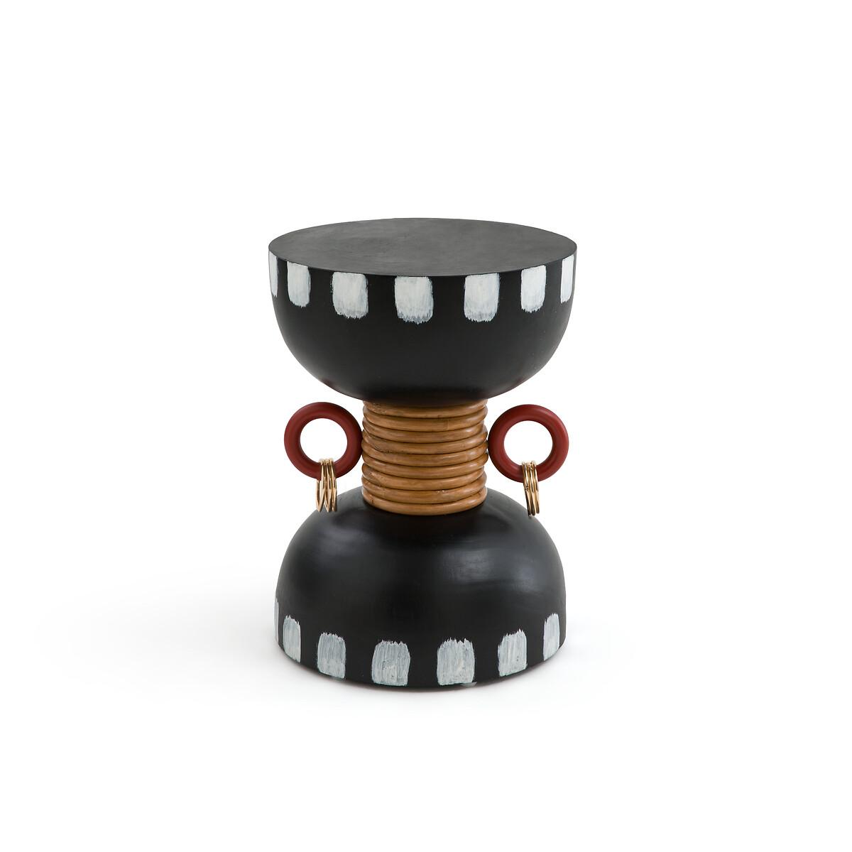 Eclectic and sophisticated, Mama Shelter X La Redoute Interiors is the result of the collaboration between the 2 brands' designers. A limited edition with limitless inspiration. A sculptural and original line, a neck sheathed with rings, two round handles in perfect symmetry: this is the Toumtamtoum-Toum side table. Let yourself be surprised by a tribe of design objects, inspiring and with a unique personality. Product Details • Structure in solid black-stained suar wood, white paint and nitrocellulose varnish finish • Natural-coloured tinted rattan core, nitrocellulose varnish finish • Steel rings, red tinted, nitrocellulose varnish finish • Decorative pendant rings in steel, gold tinted, nitrocellulose varnish finish • Polyamide gliders. Dimensions • Diameter: 35cm • Height: 45cmDelivery:. Sold pre-assembled. Available for home delivery. Dimensions and weight of parcel1 parcel • L37 x H48.5 x D37cm. 15kg