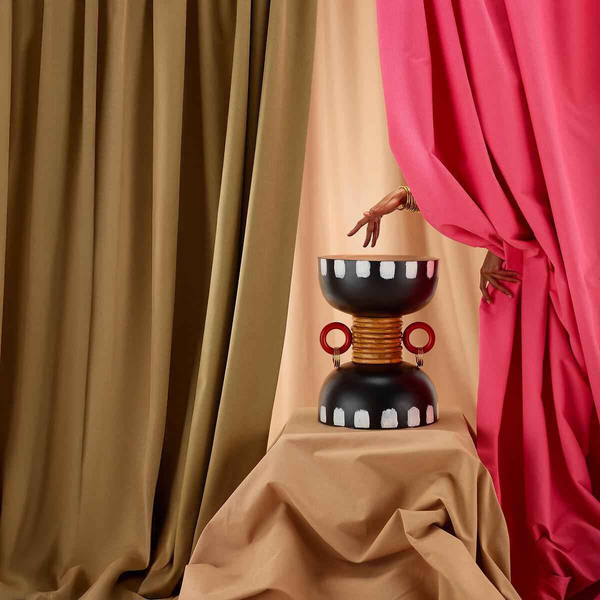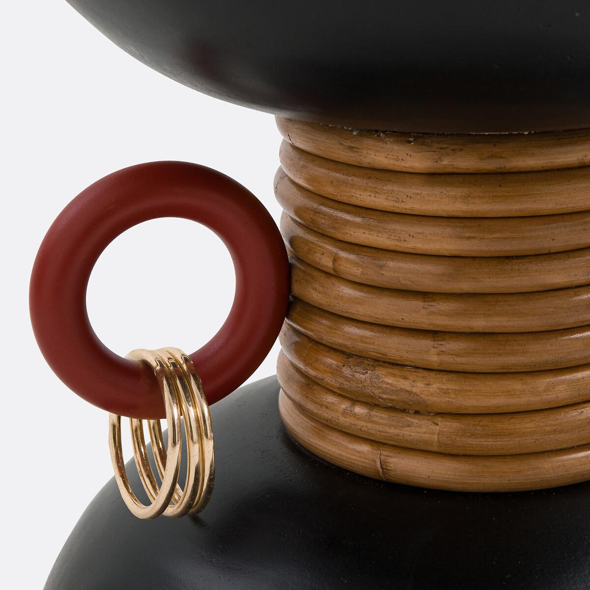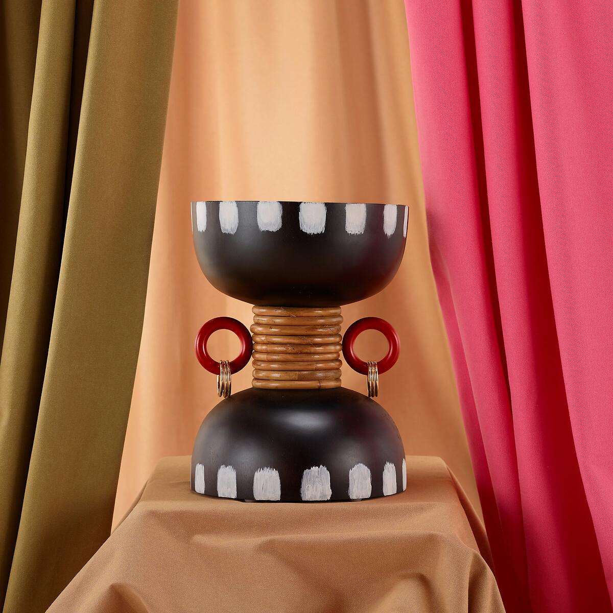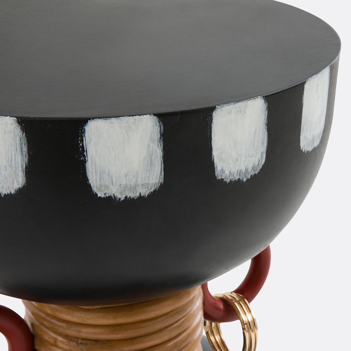 Eclectic and sophisticated, Mama Shelter X La Redoute Interiors is the result of the collaboration between the 2 brands' designers. A limited edition with limitless inspiration. A sculptural and original line, a neck sheathed with rings, two round handles in perfect symmetry: this is the Toumtamtoum-Toum side table. Let yourself be surprised by a tribe of design objects, inspiring and with a unique personality. Product Details • Structure in solid black-stained suar wood, white paint and nitrocellulose varnish finish • Natural-coloured tinted rattan core, nitrocellulose varnish finish • Steel rings, red tinted, nitrocellulose varnish finish • Decorative pendant rings in steel, gold tinted, nitrocellulose varnish finish • Polyamide gliders. Dimensions • Diameter: 35cm • Height: 45cmDelivery:. Sold pre-assembled. Available for home delivery. Dimensions and weight of parcel1 parcel • L37 x H48.5 x D37cm. 15kg