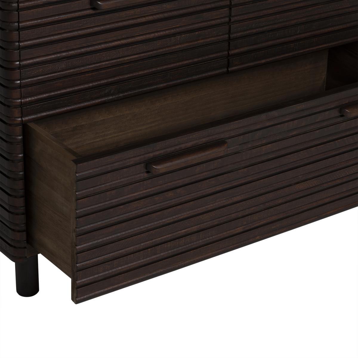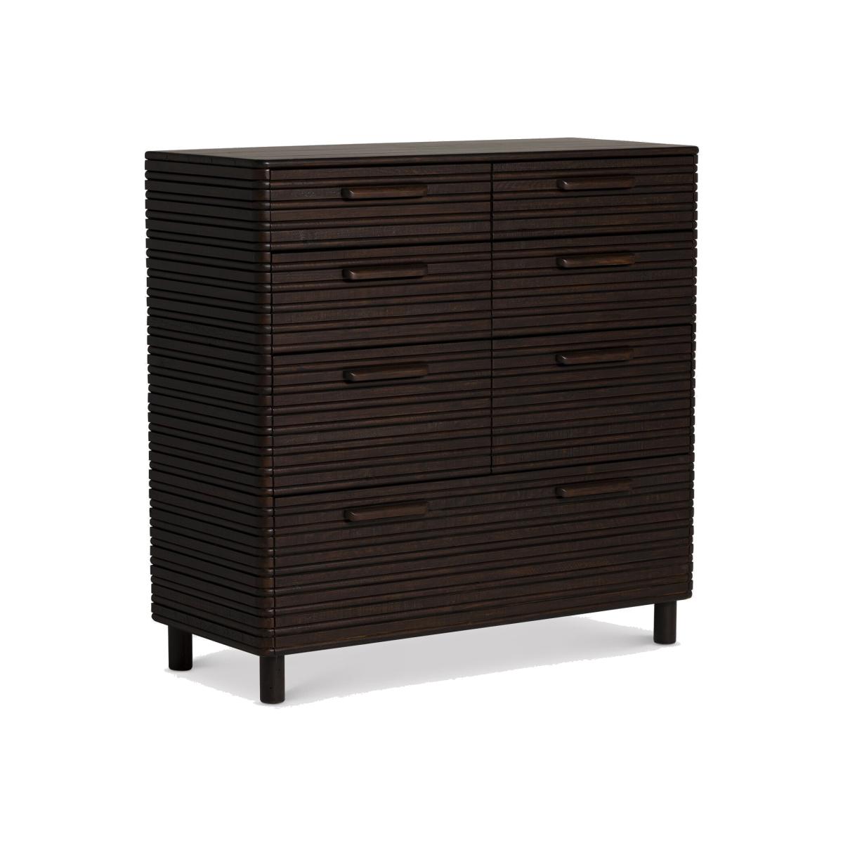 I love this unit for its clean, modern lines and versatile dark wood finish, making it a great addition to contemporary and minimalist interiors. It works well in bedrooms for added storage, but can also be styled in living rooms or hallways to create a sleek, organised look. For styling tips, try pairing it with brushed brass or matte black hardware to add subtle contrast, and utilise its top surface for decorative vases, lamps, or artwork to soften its practical feel. Practicality-wise, its spacious drawers make it perfect for decluttering, and the textured finish adds a tactile element that enhances its visual appeal without overwhelming the space.