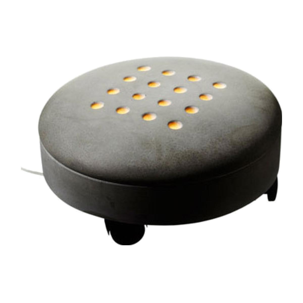 Tove Admans footstool in concrete is not only a lamp but also designed to have as a footstool. The concrete is heated up by 16 lights that allows one to warm his feetwhile it lits up from the floor and create a harmonious light.