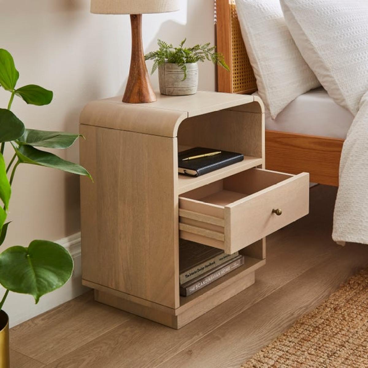 The Tovi bedside table offers a clean, contemporary look that complements a range of interior styles, from Scandi to modern boho. I love its understated design and natural wood finish, which adds warmth and texture without overpowering a space. It’s practical for small bedrooms thanks to its compact size, with handy open shelves for books or bedtime essentials. To style it, consider layering a small lamp, a few personal touches like a plant or a decorative tray, and some favourite books or accessories to create a cosy, inviting bedside setup. It’s versatile enough to work as a standalone piece or paired with other furniture for a cohesive look.