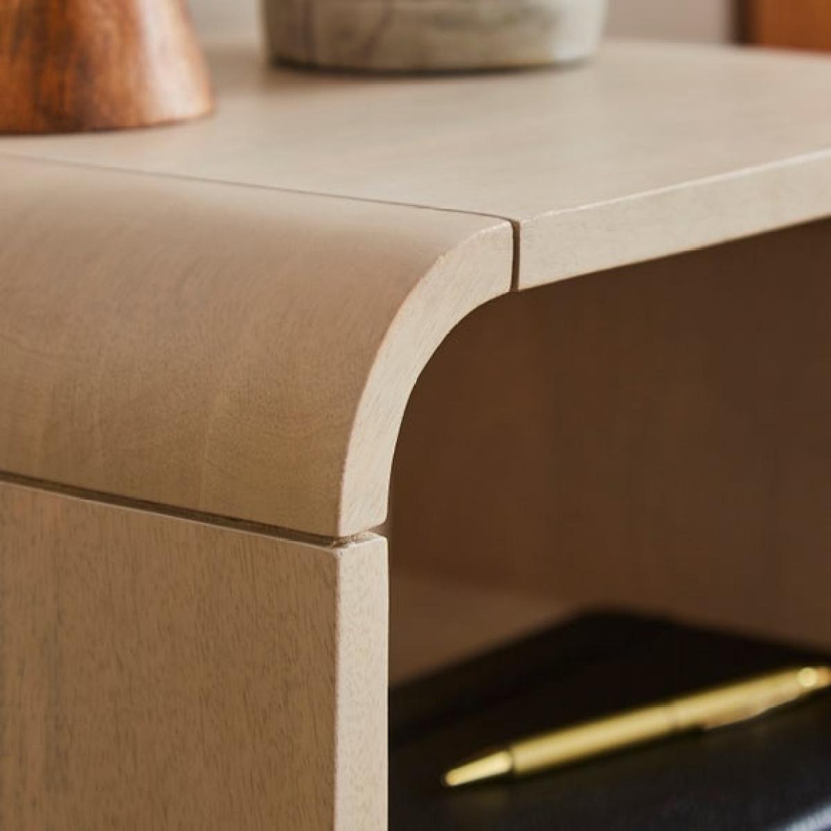 * Solid Mango Wood * Soft curved design * Large drawer The Tovi bedside table is a perfect blend of style and functionality, crafted from solid mango wood for exceptional durability and a natural finish that adds warmth to any bedroom. Its soft curves create a sleek, contemporary silhouette, while the smart storage design ensures practicality without compromising on aesthetics.