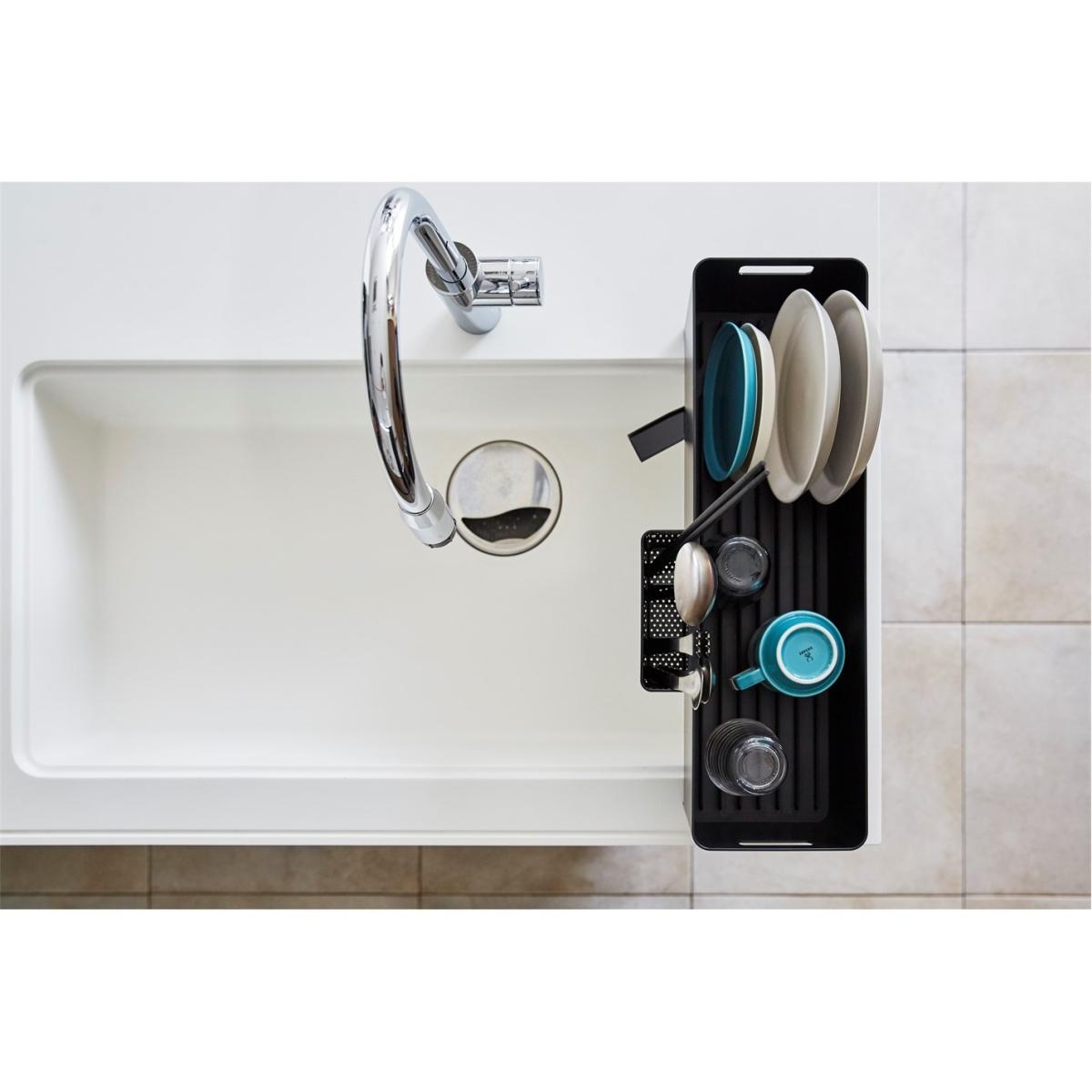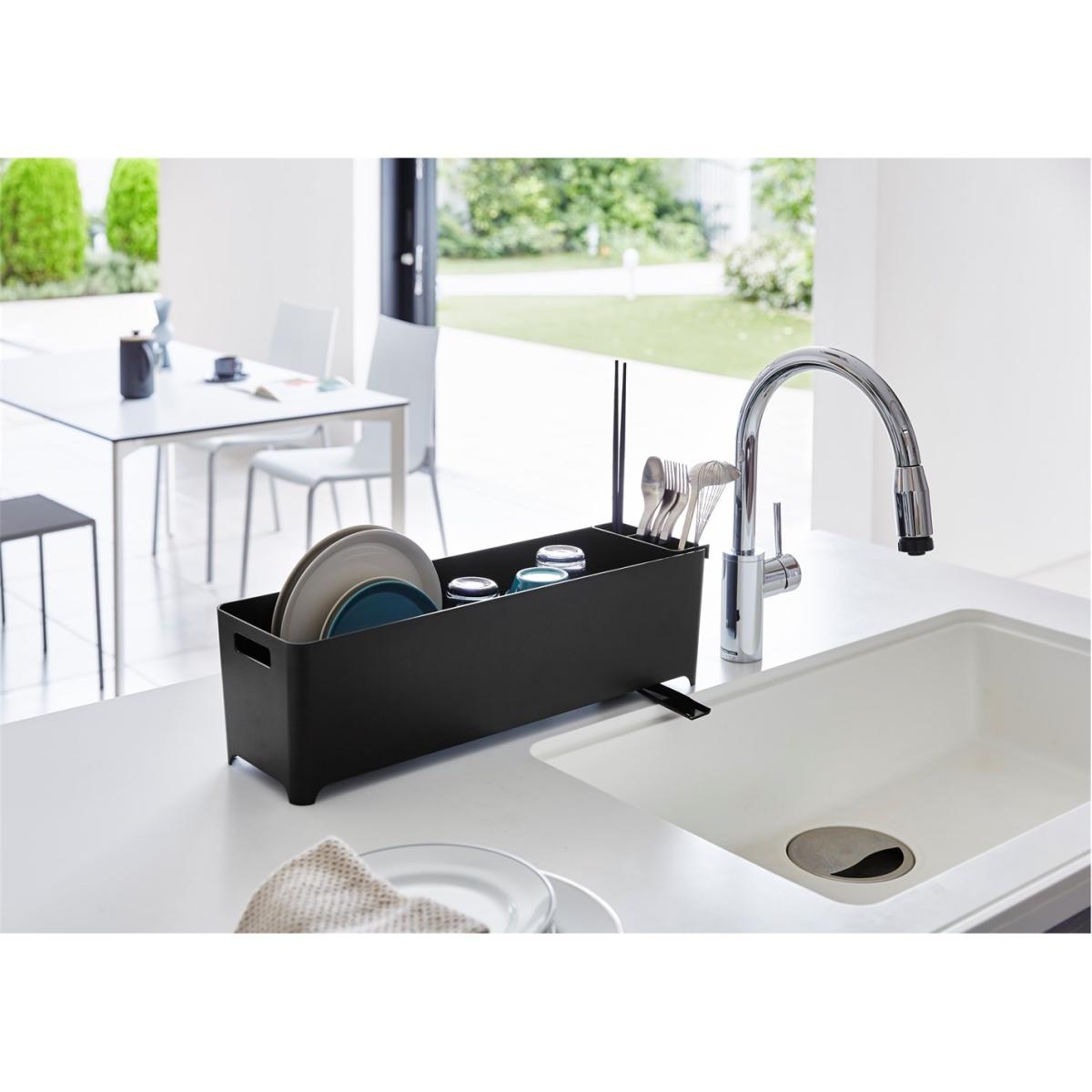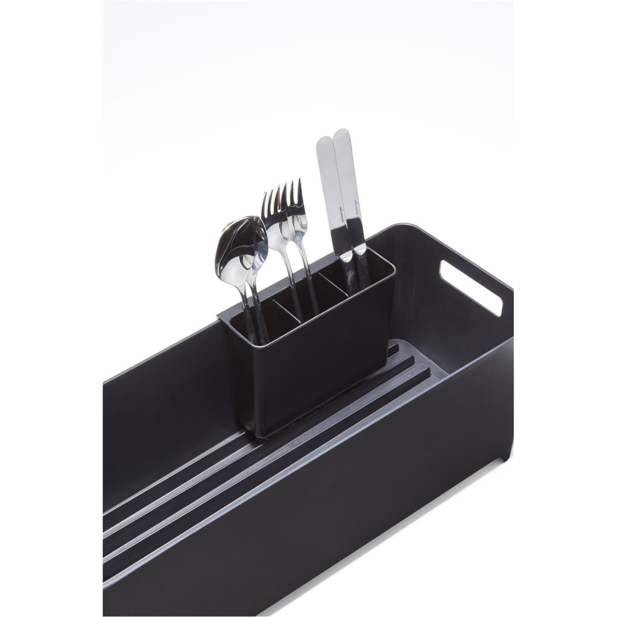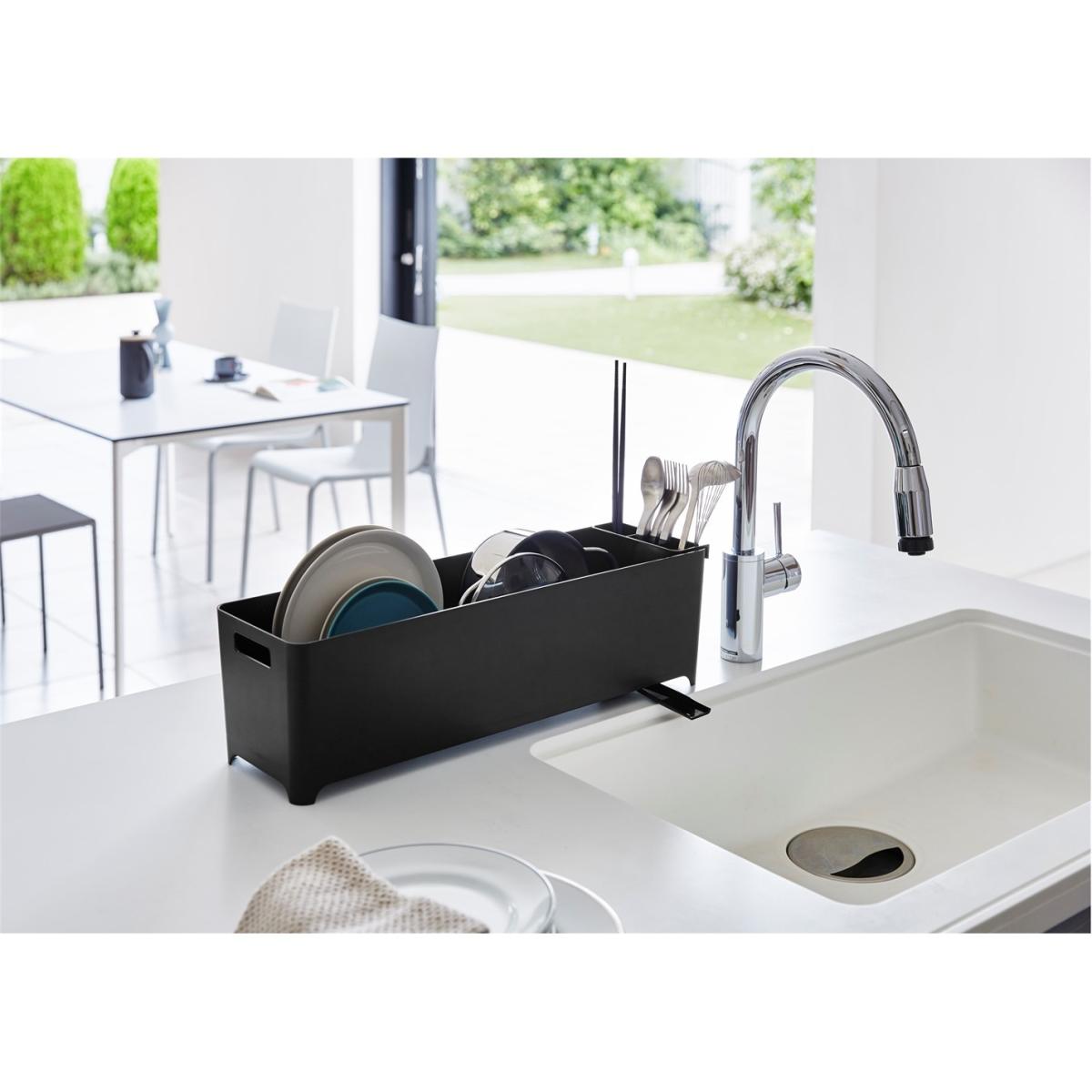 Save your kitchen work surface space thanks to this compact slim dish drainer from Yamazaki in black. It features a self-draining adjustable water spout, ensuring all the water drips to bottom and back into the sink. With space for cutlery, plates and glasses, its sleek design makes sure it fits effortlessly into your kitchen style too.