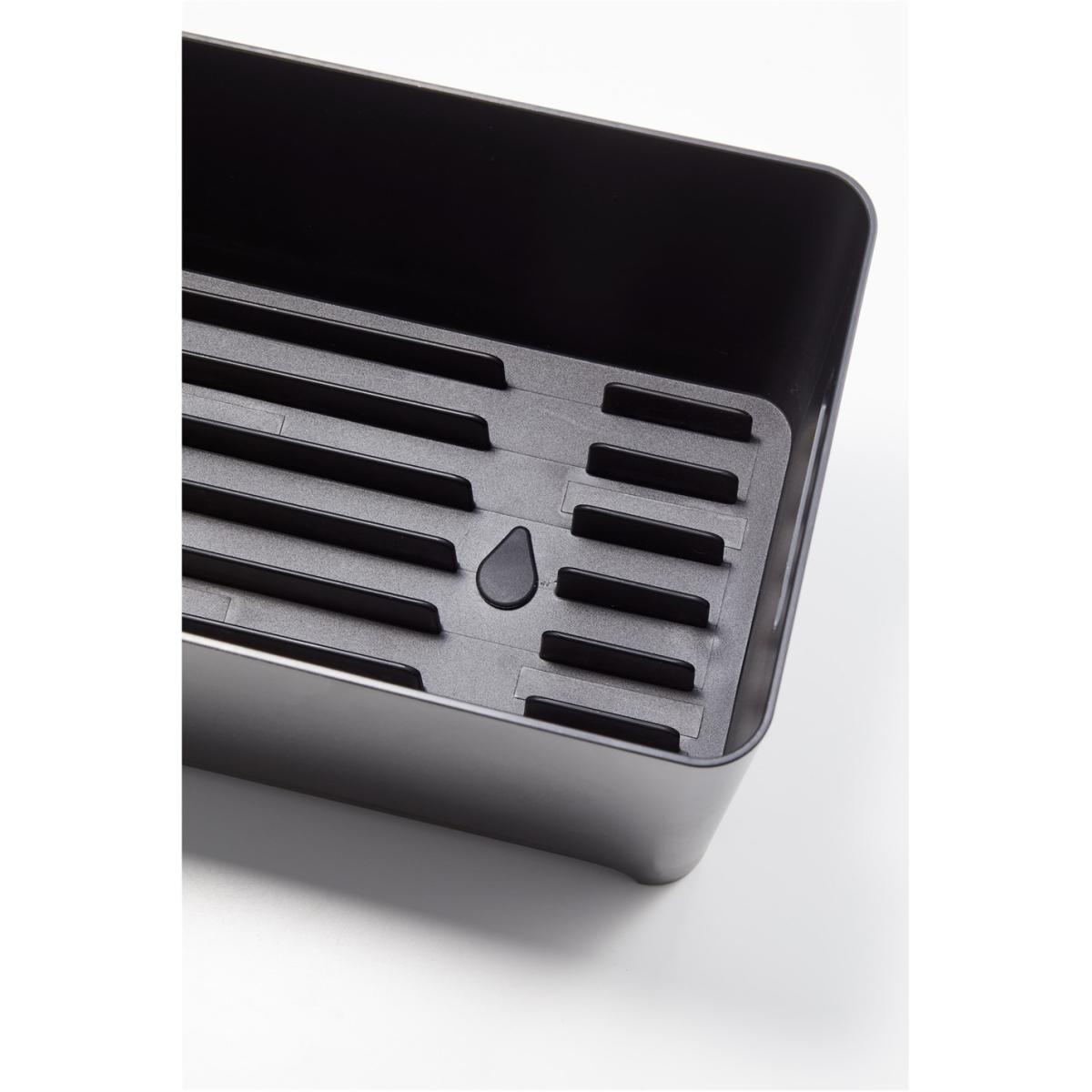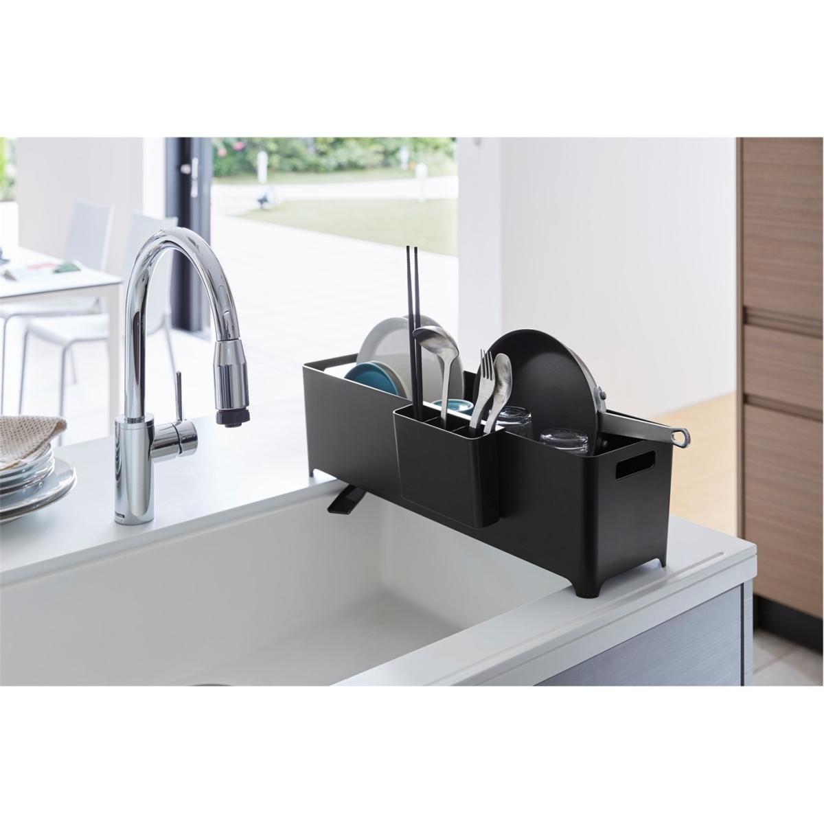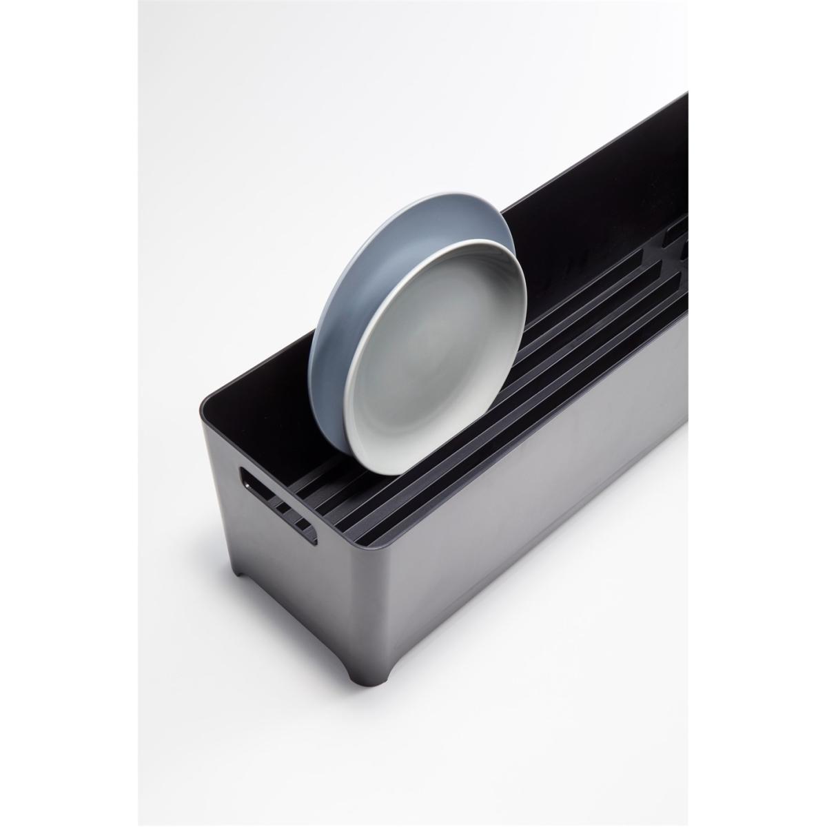 Save your kitchen work surface space thanks to this compact slim dish drainer from Yamazaki in black. It features a self-draining adjustable water spout, ensuring all the water drips to bottom and back into the sink. With space for cutlery, plates and glasses, its sleek design makes sure it fits effortlessly into your kitchen style too.