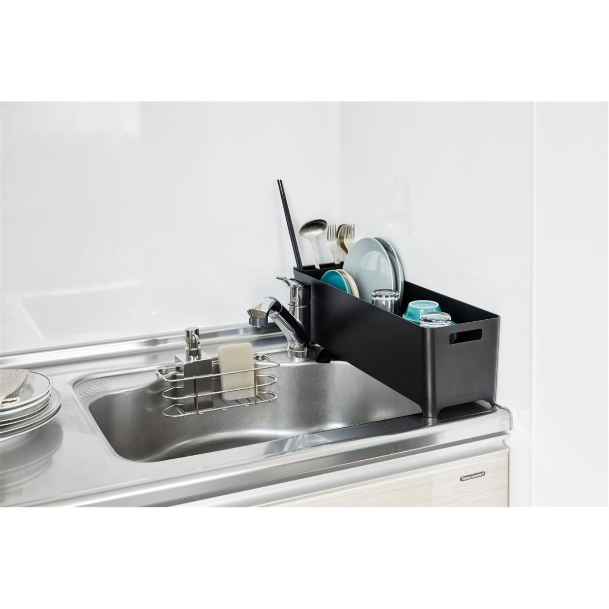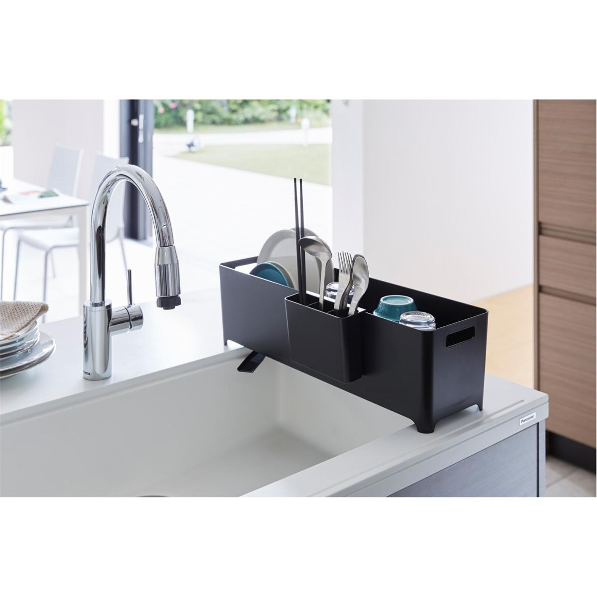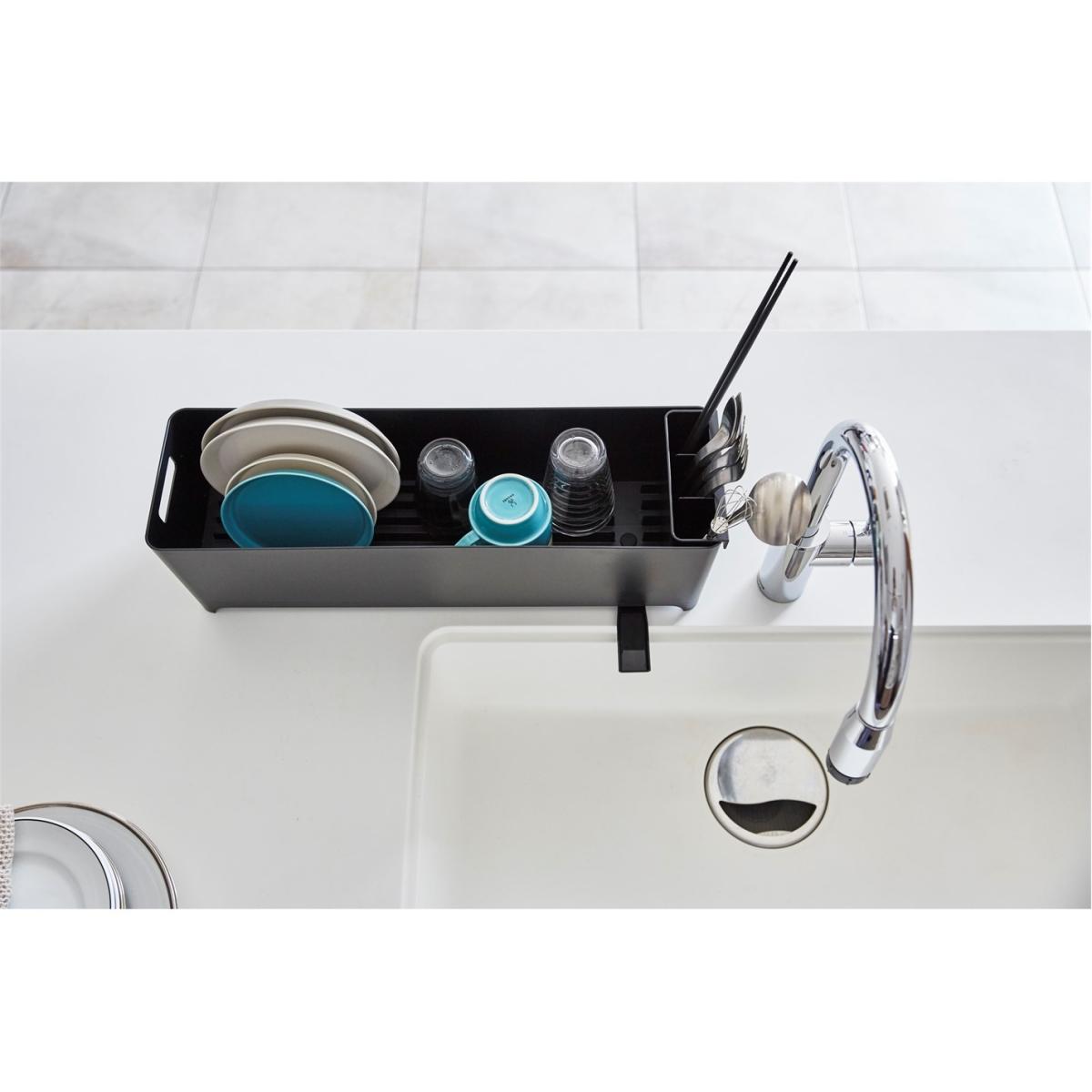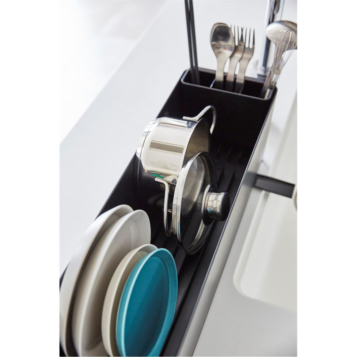 Save your kitchen work surface space thanks to this compact slim dish drainer from Yamazaki in black. It features a self-draining adjustable water spout, ensuring all the water drips to bottom and back into the sink. With space for cutlery, plates and glasses, its sleek design makes sure it fits effortlessly into your kitchen style too.