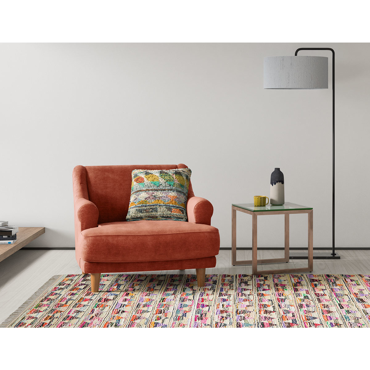 I love this armchair because of its rich dusty rose velvet, which adds warmth and a touch of luxury to any space. It works particularly well in eclectic or contemporary interiors, where the colour can serve as a statement piece or a complement to neutral palettes. Practical styling tips include pairing it with soft, textured cushions or placing it alongside contrasting or patterned fabrics for visual interest. Its compact size makes it versatile for smaller rooms or cosy corners, and the wooden legs give it a modern yet timeless feel. It’s a great choice for adding colour and comfort without overwhelming the space.