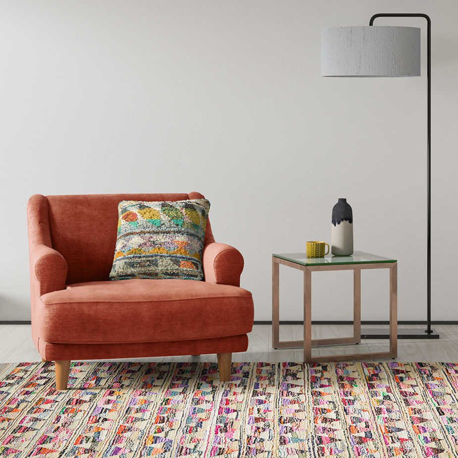 I love this velvet armchair for its bold colour and classic shape, which makes it a versatile statement piece. The rich purple hue works particularly well in both contemporary and traditional interiors, adding a splash of colour without overwhelming the space. It pairs beautifully with neutral tones for a sophisticated look or can be mixed with patterned cushions and throws for a more eclectic vibe. Practical styling tips include placing it near a cosy reading nook with a side table and lamp, or letting it stand out as a focal point in a living room. Its wooden legs add a touch of warmth and natural charm, making it suitable for everything from modern city apartments to more vintage-inspired decors.