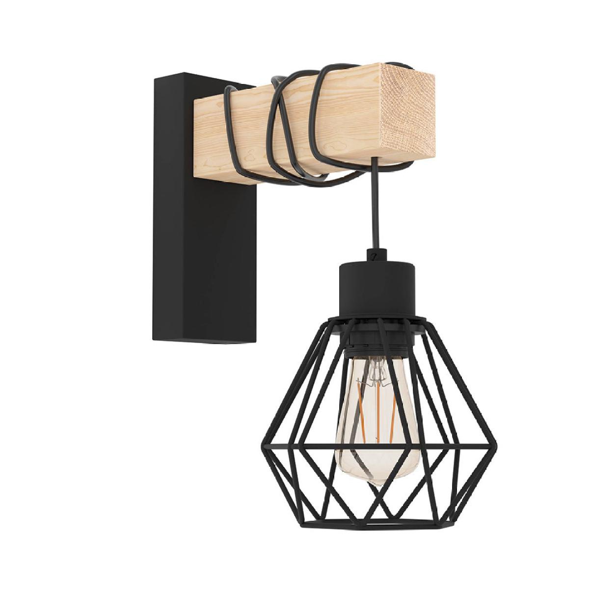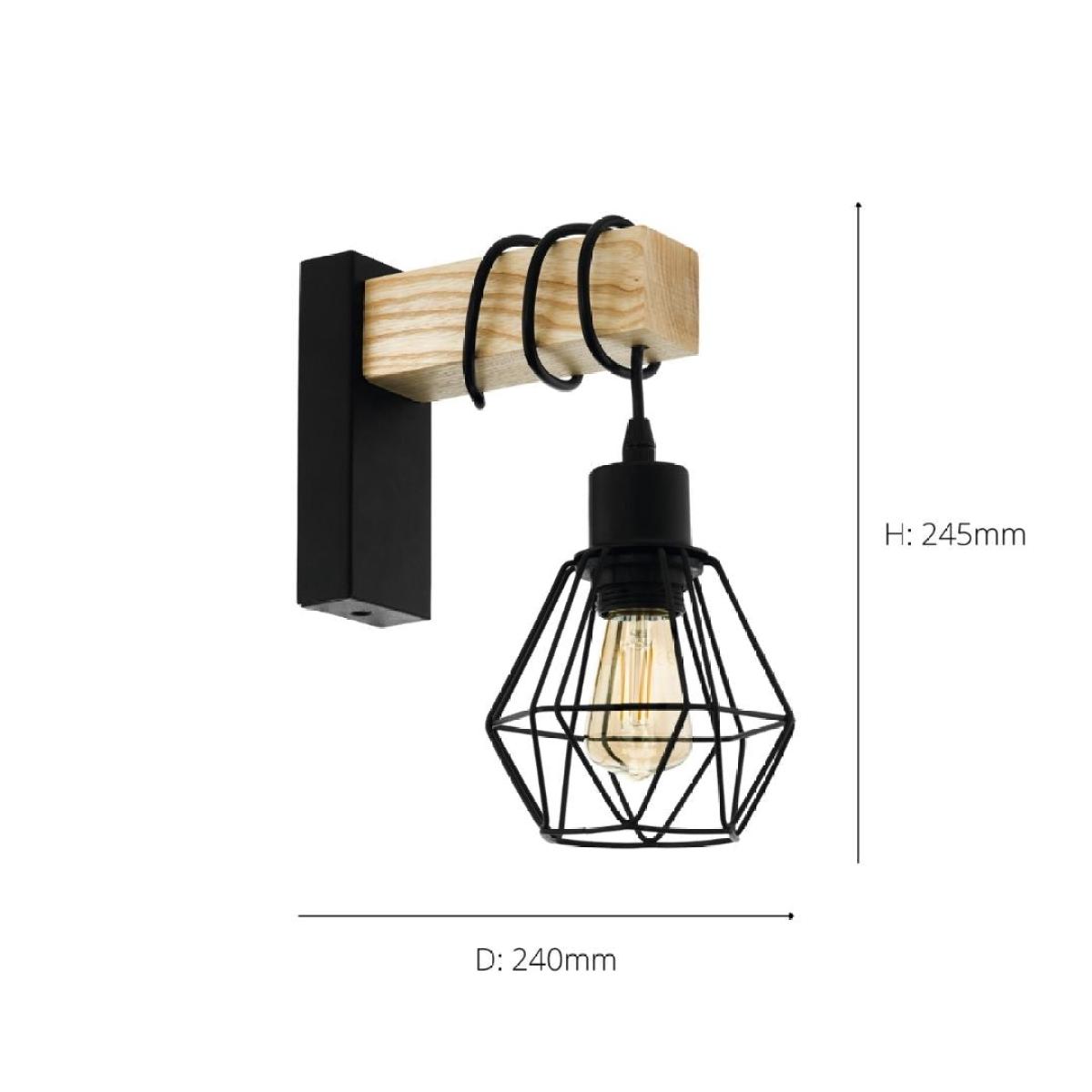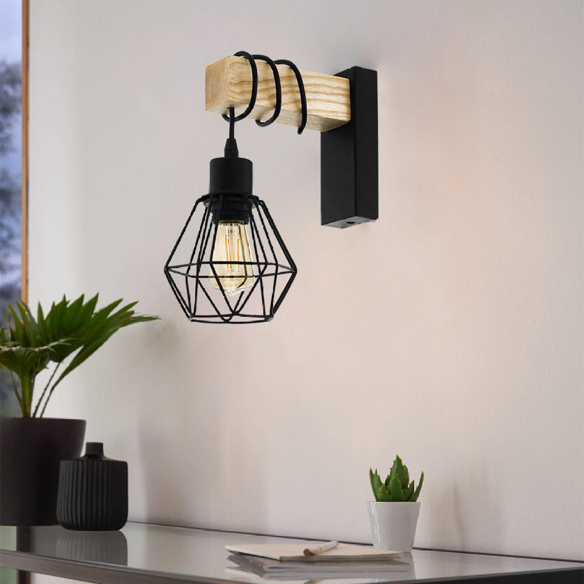 Rustic wooden wall light finished with a suspended black caged shade. This wooden wall light is part of the contemporary Townshend range by Lighting. Boasting a stylish black frame with a wooden feature which suspends a black caged shade, this stylish light will be complete when used with a vintage bulb. Feature this wall light in any modern living space to create a warm and vintage vibe. Pair this light with our 4w LED Vintage bulbs for a rustic and industrial glow to complement the exposed bulb styling. Rustic wooden wall light finished with a suspended black caged shade. This wooden wall light is part of the contemporary Townshend range by Lighting. Boasting a stylish black frame with a wooden feature which suspends a black caged shade, this stylish light will be complete when used with a vintage bulb. Feature this wall light in any modern living space to create a warm and vintage vibe. Pair this light with our 4w LED Vintage bulbs for a rustic and industrial glow to complement the exposed bulb styling.