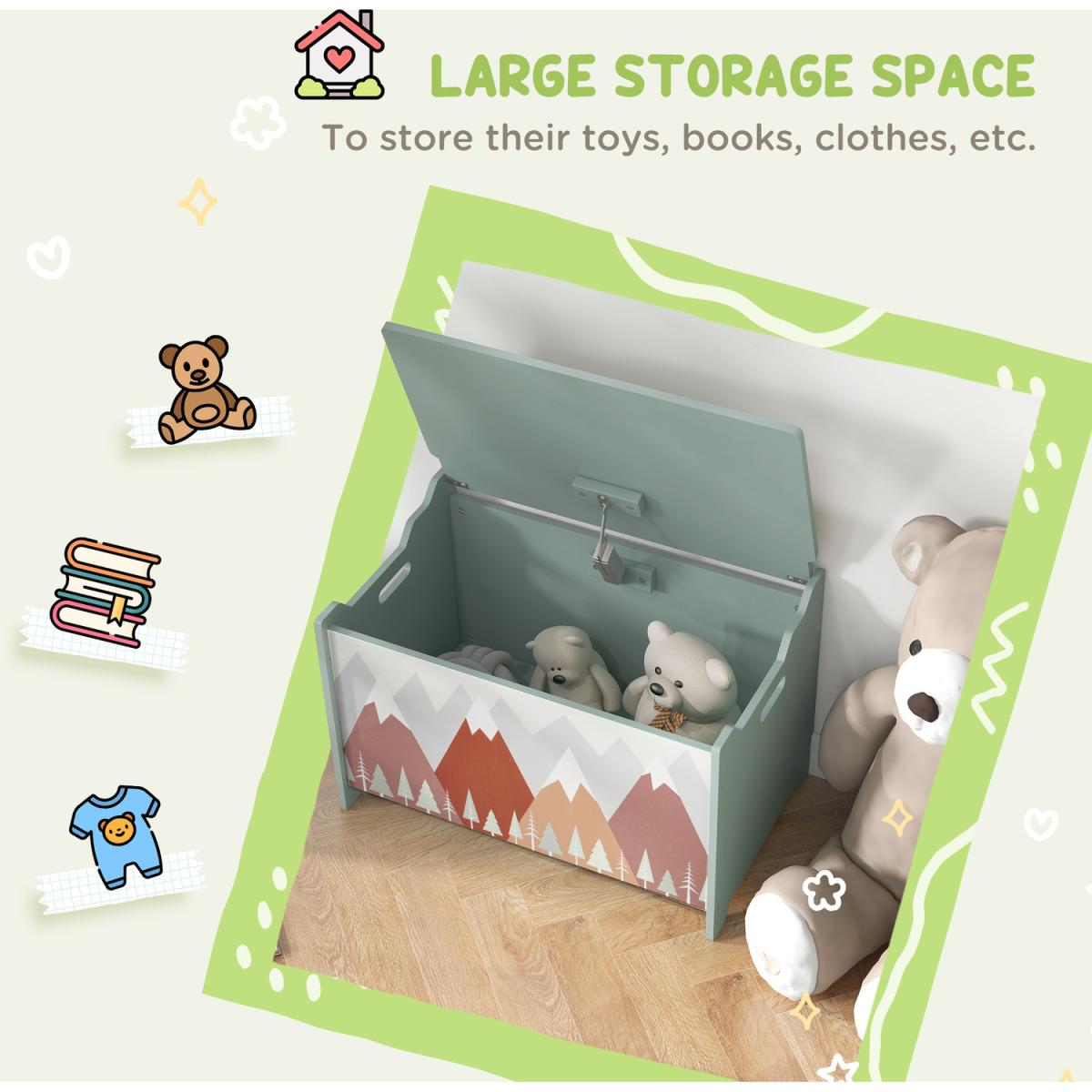 Enhance your child's room with ZONEKIZ kids storage chest! This charming chest offers generous storage space, keeping toys, games and treasures neatly organised. Its cute animal design adds a playful touch to any room. Safety is a priority with a hinged lid that prevents accidental slamming and keeps little fingers safe. Crafted with sturdy construction, it's built to last through years of use. This versatile chest doesn't just declutter it brings a whimsical flair to your child's space.