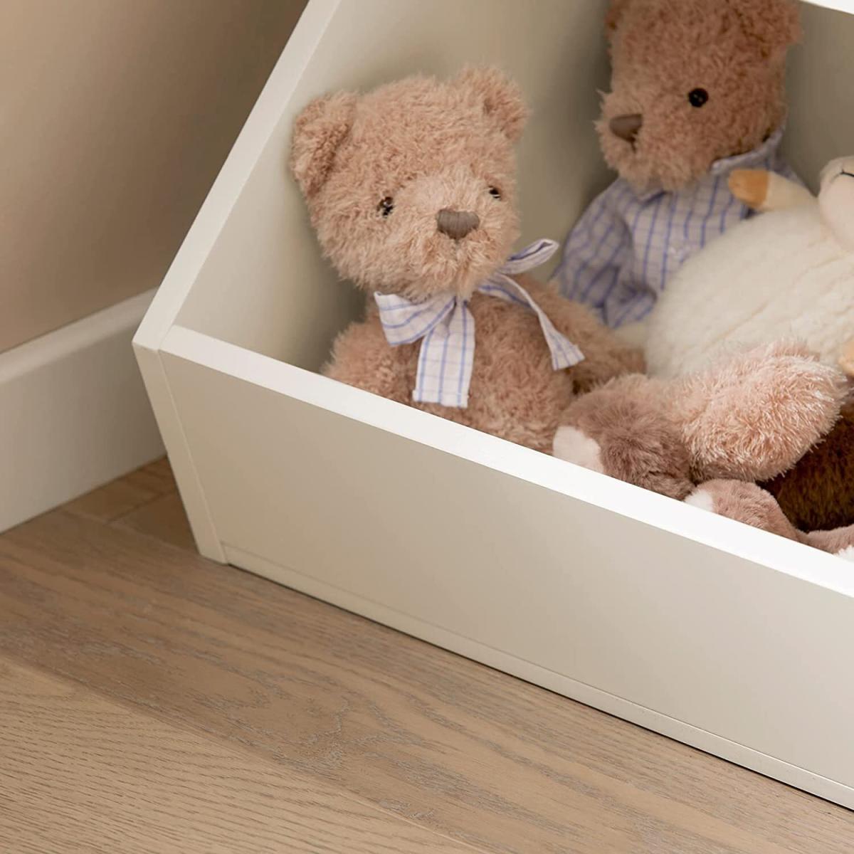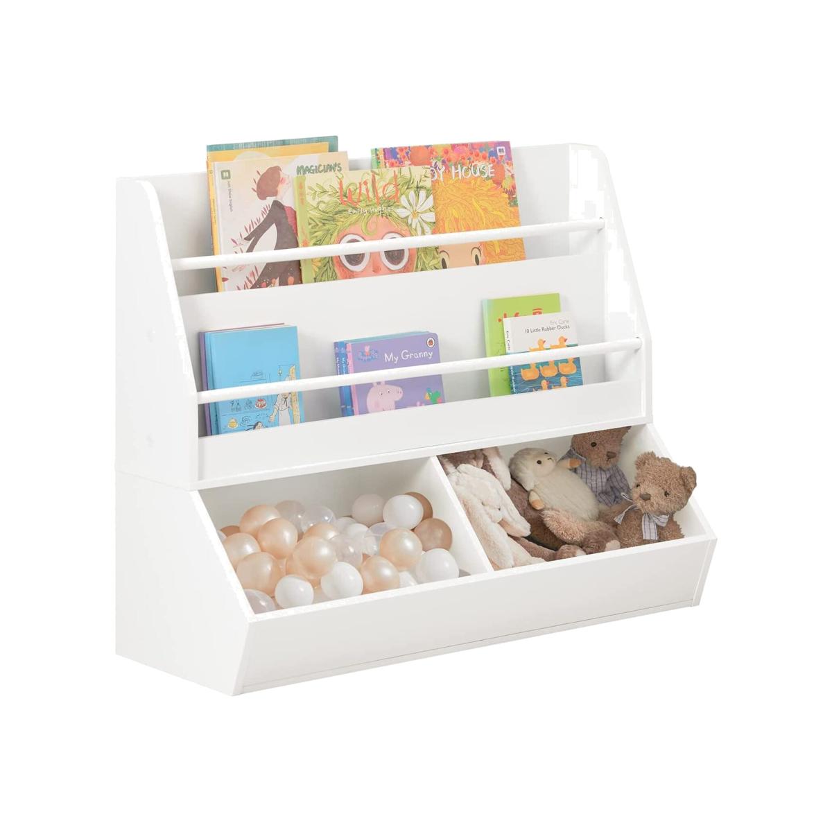 Modern design children storage shelf will blend perfectly with any decor. It will keep the room nicely organized.2 tiers shelf on the top are ideal for storing books, flexible for books of varying size and thickness.2 round cross bars prevent the books from falling off.2 open storage compartments provide plenty of storage and display space for the toys. Suitable for children ages 3 and up, promotes organization and reading skills. Sturdy wood with environmental protection finish and the anti-tipping device, ensure good stability and safety, an ideal choice for daycare, classroom and children's room.