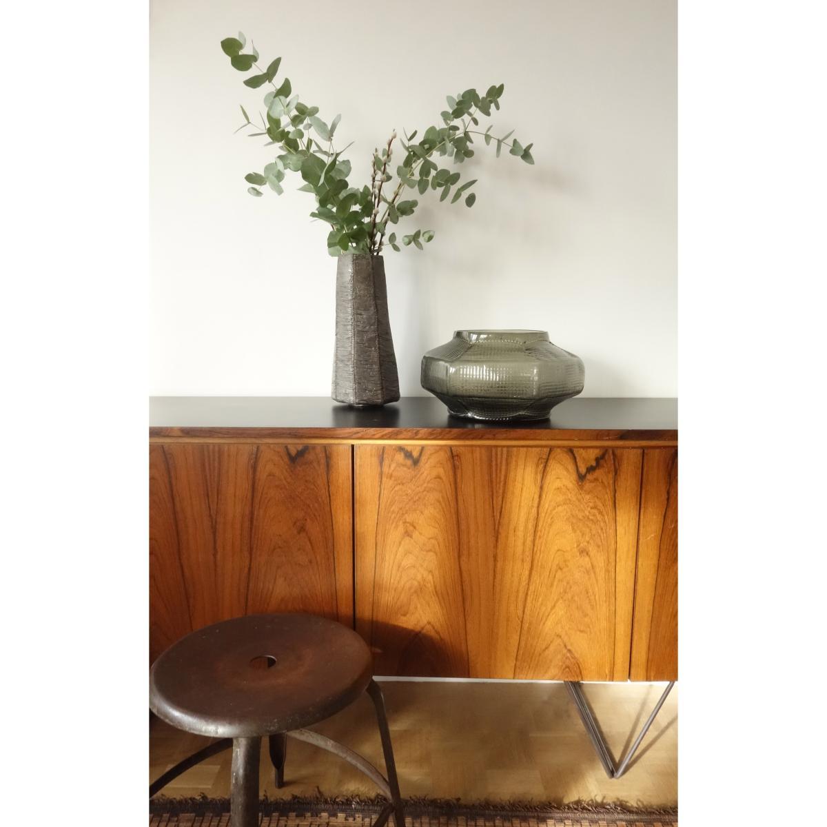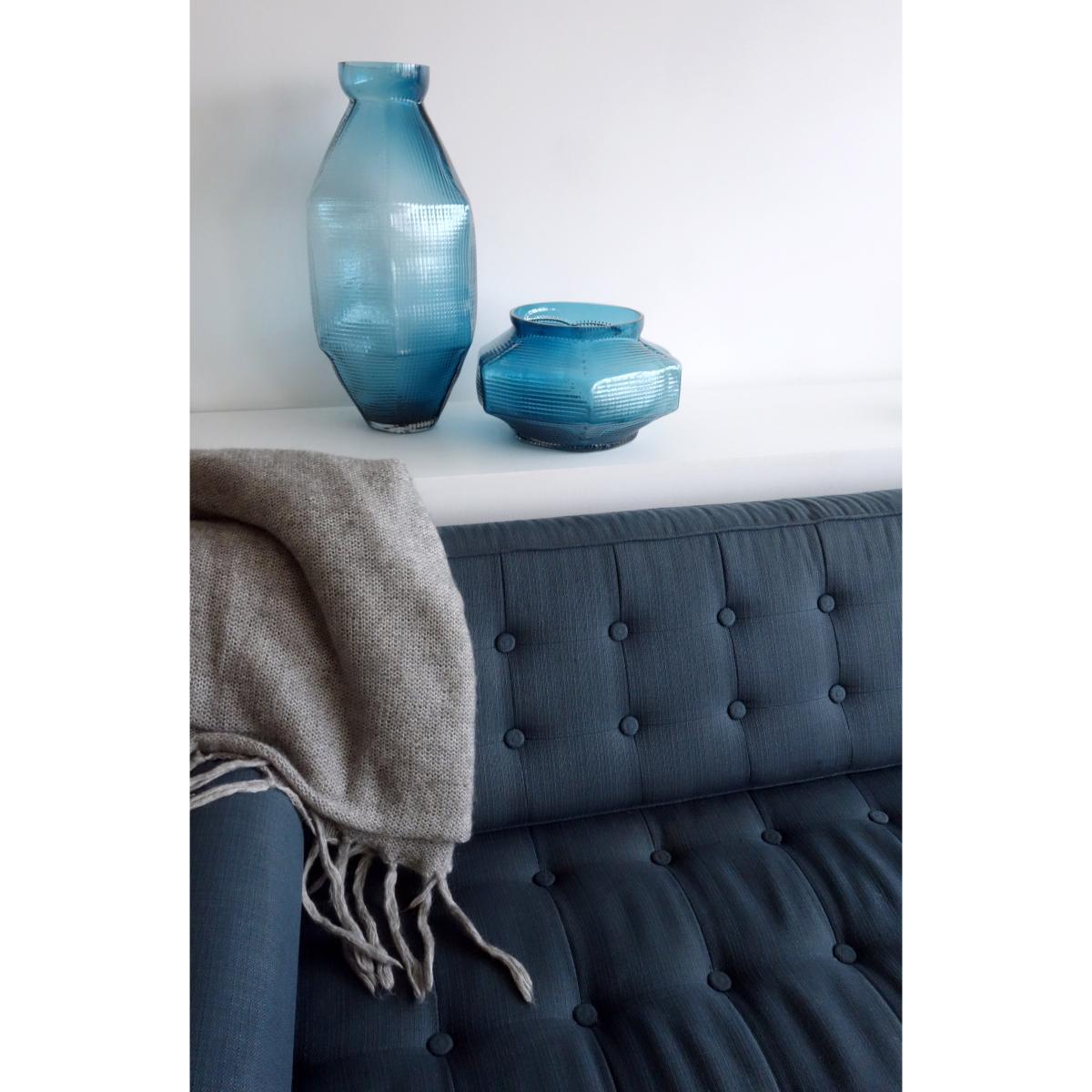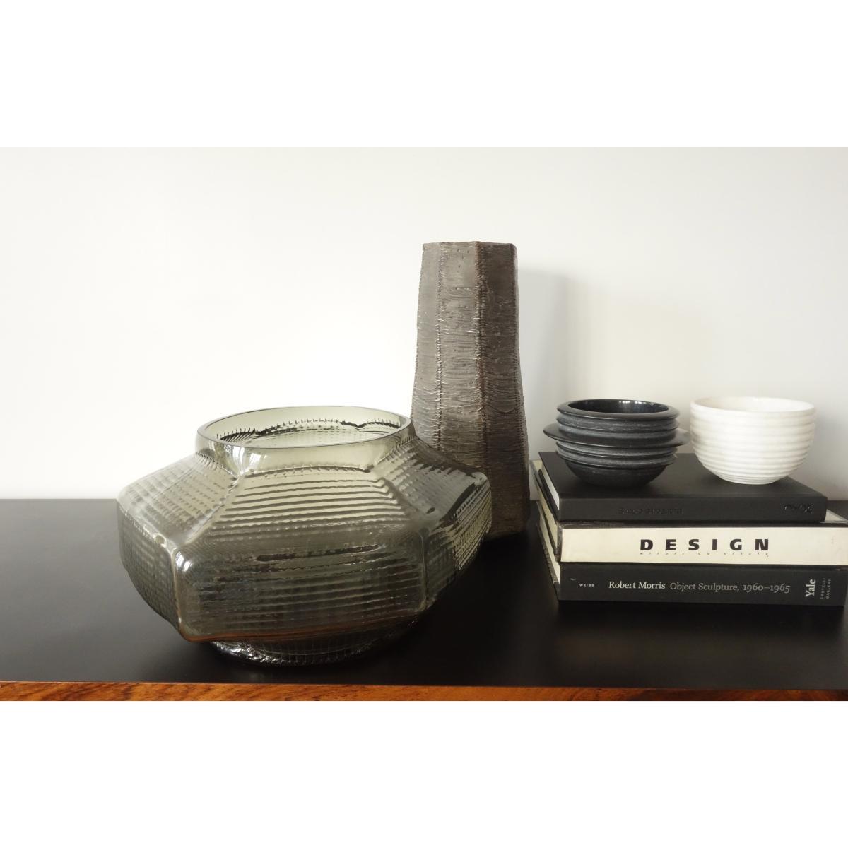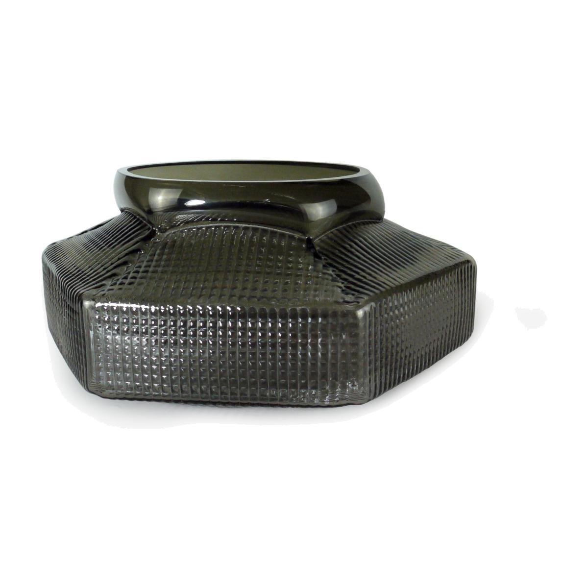 Since her first collection in 1998, Vanessa Mitrani is now a fully-fledged figure in the creative arts. An expert in glass, which she works in various forms, she has affirmed her status as designer by producing coherent collections where each piece is unique. The Trace vase collection is the result of delicate work on patterns and folds. This low vase boasts original, graphic lines which display multiple small dots printed in matching tones on the blown glass, which encircle it elegantly. These relief patterns and the folds of this vase subtly follow the design of Burmese and Japanese temples, which inspired the designer during her travels.