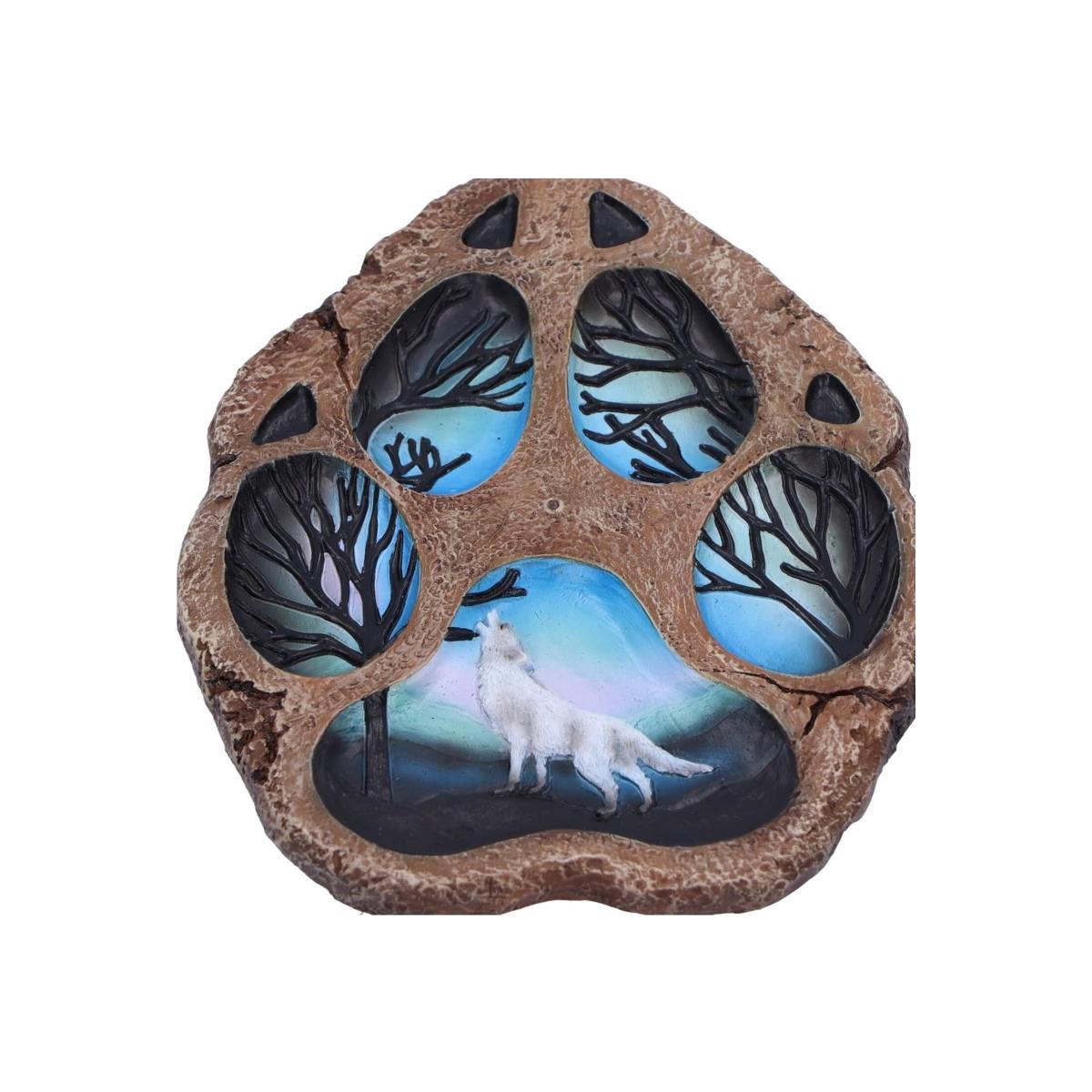 Experience the primal beauty of our Tracks of the Wild Incense Burner from Nemesis Now's value collection, a meticulously crafted incense holder shaped like a wolf's paw etched into the earth. Within the paw imprint, an artistic scene unfolds a lone wolf howling at dusk on a winter's evening, surrounded by the stark shadows of bare trees. Made from high-quality resin, this exquisite piece is hand-painted to capture the essence of the wild. The perfect addition to any space, this incense burner seamlessly combines functionality with captivating design. Explore our extensive range of Wolf-inspired giftware, where each piece embodies the untamed spirit of the wilderness.