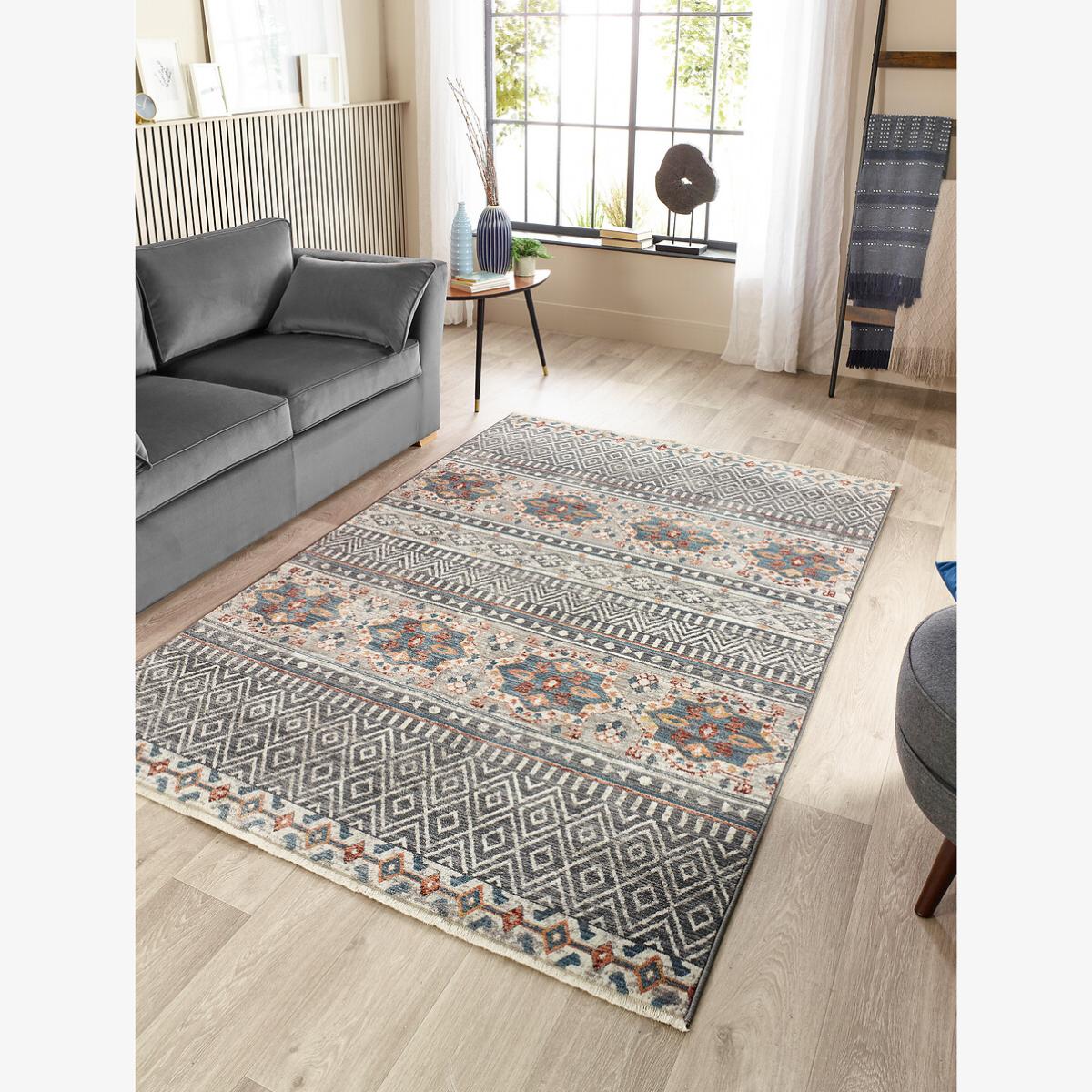 I love this traditional mandala style rug for its versatility and timeless appeal. It works particularly well in both classic and eclectic interiors, adding a touch of warmth and cultural interest to living rooms and bedrooms. Pair it with neutral furniture to let the pattern stand out, or mix with more vibrant textiles for a layered look. Practical styling tips include rolling up the edges slightly to create a more relaxed feel or layered over a larger neutral rug to define a space. Its antique stripe design makes it easy to incorporate into various colour schemes, making it a smart choice for injecting a bit of character without overwhelming the room.