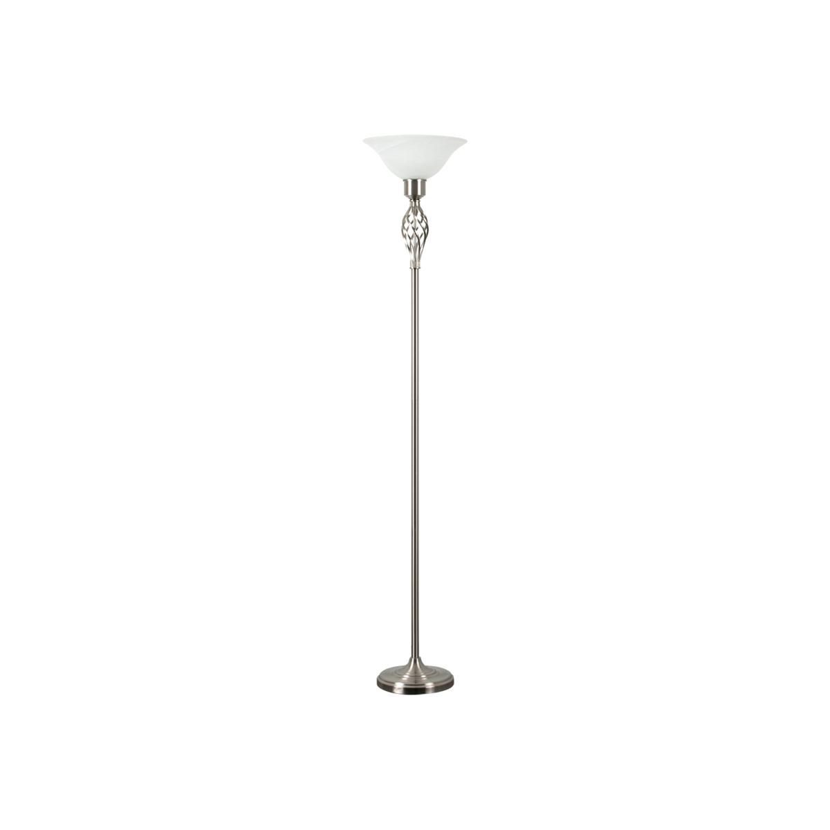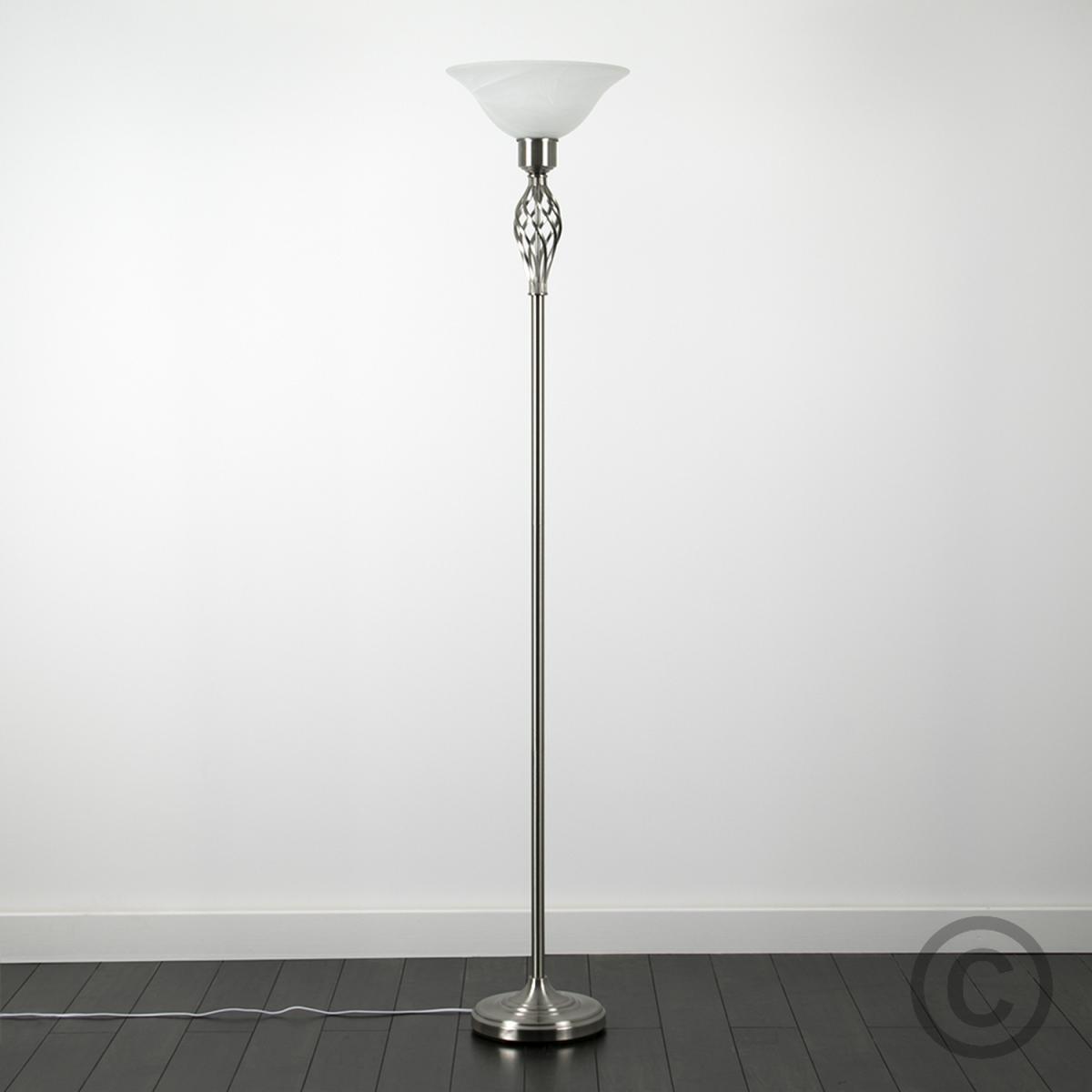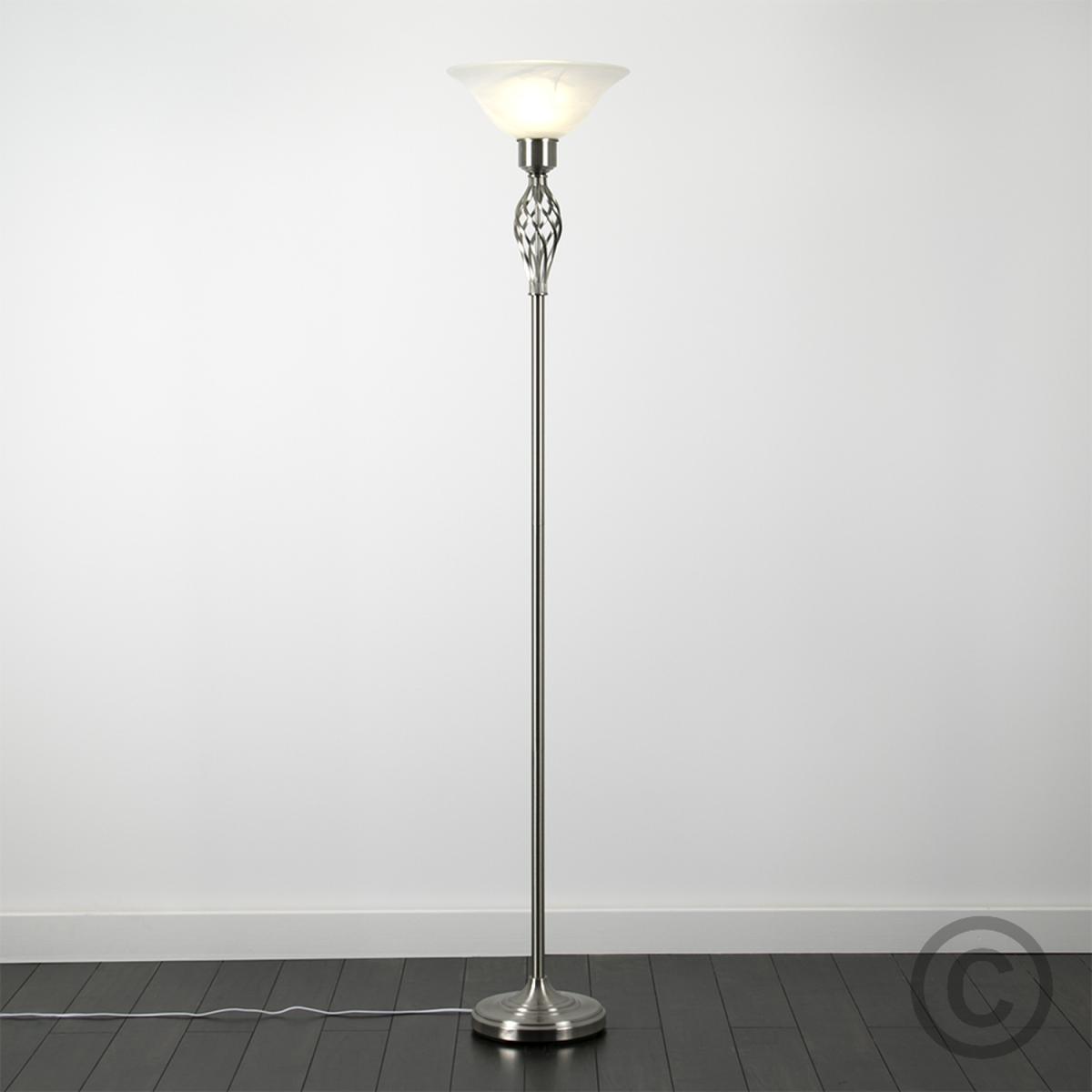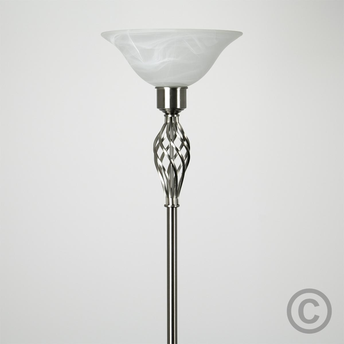 Traditional style barley twist uplighter floor lamp in a satin nickel metal finish with a frosted alabaster style shade. This contemporary floor lamp will make a great addition to any room in your home. Its beautiful twist design matches most interiors whether its modern or traditional. Floor lamps are a great way to bring additional lighting to a room and are particularly useful to illuminate a dull corner. An instant update, you can change your room style in seconds.