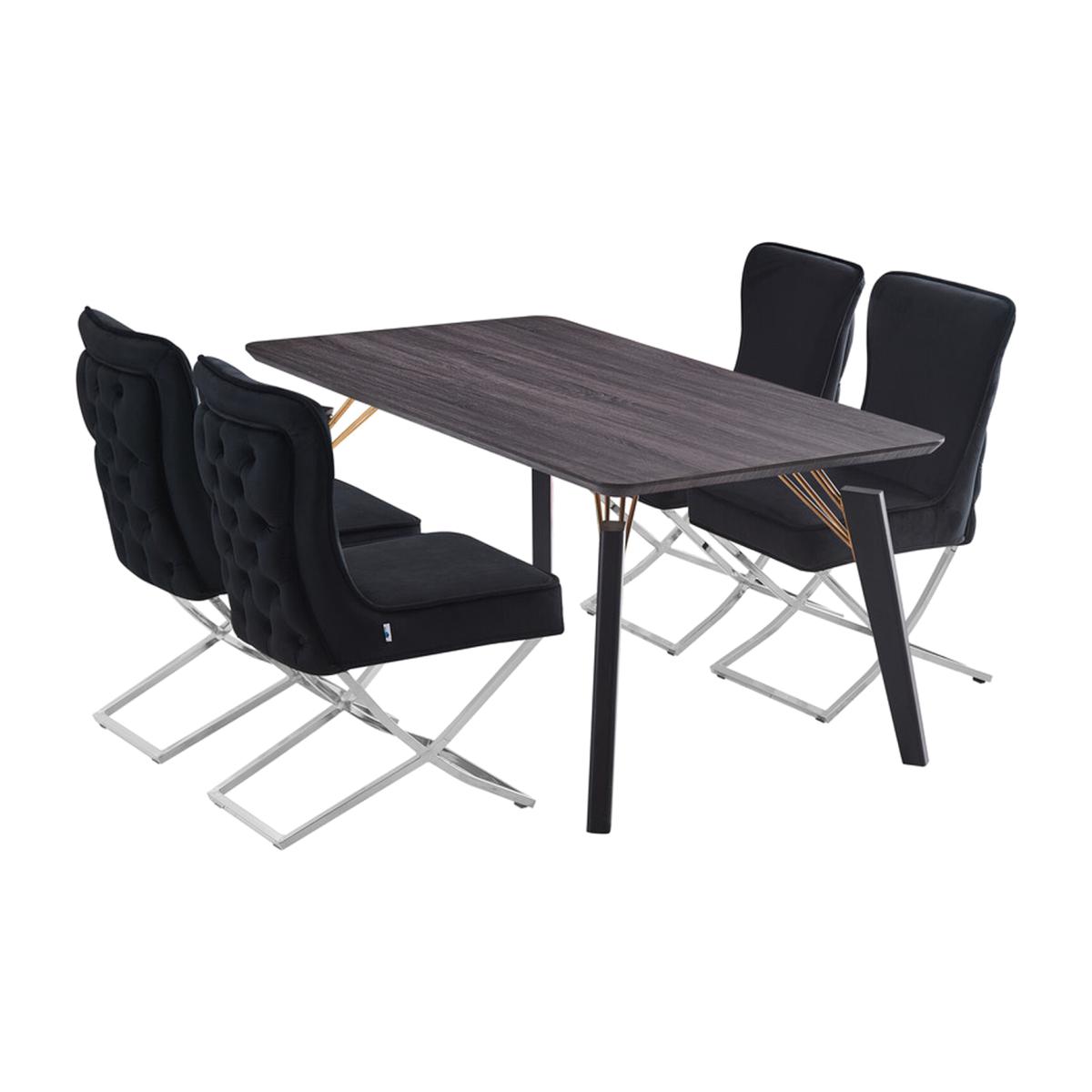 Bring a flexible gaze to your eye-catching kitchen with this gorgeous Trafalgar Cosmo LUX Dining Set. The kitchen dining set offers a LUX Rectangle Dining Table that has been designed with precision and a luxury finish to deliver an amazing dining experience. The sleek design of this table is giving it both functionality and a modern look with a touch of a rustic home feel. The wooden look of the top gives it a warm rustic feel while the black metal legs with a gold chrome frame bring the modern feel. Comes with the Trafalgar Lux Velvet Dining Chairs that have been carefully curated with attention to detail and utmost precision. Featuring a premium quality soft velvet, a deep buttoned back, and stainless steel chrome or gold legs. The Trafalgar is a true symbol of comfort and style. Focusing on ensuring the user is met with a supreme level of comfort, we have taken into consideration the overall quality of these pieces. Upholstered in a plush polyester velvet and a high-quality density foam, a button tufted back with a diamond shape pattern and fibre seat ensures comfort levels are premium.
