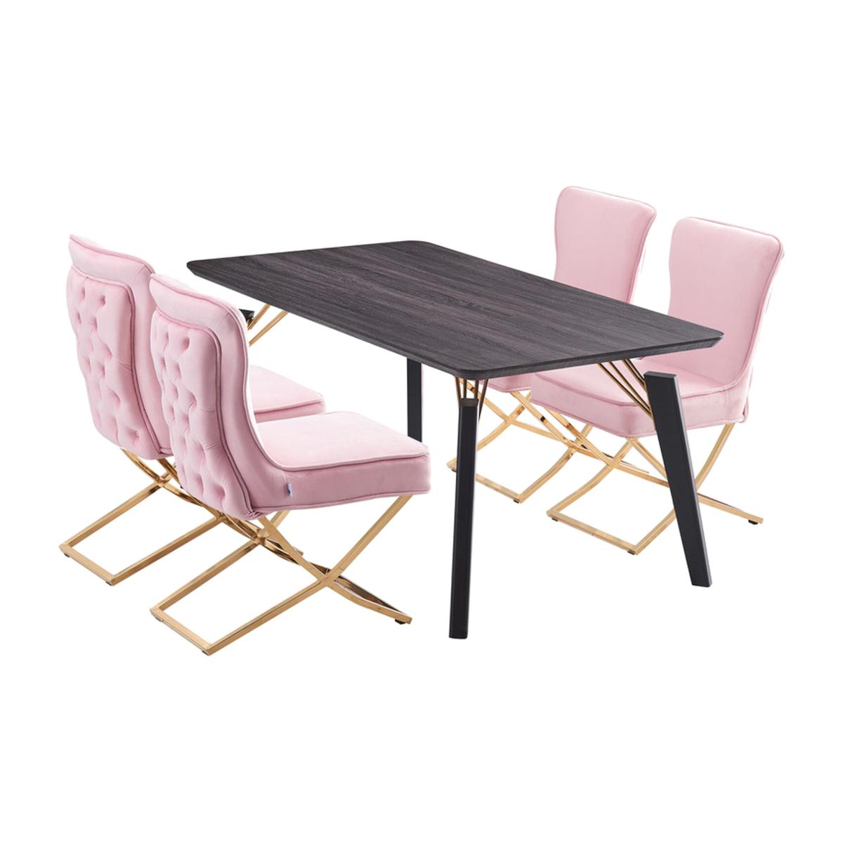 Bring a flexible gaze to your eye-catching kitchen with this gorgeous Trafalgar Cosmo LUX Dining Set. The kitchen dining set offers a LUX Rectangle Dining Table that has been designed with precision and a luxury finish to deliver an amazing dining experience. The sleek design of this table is giving it both functionality and a modern look with a touch of a rustic home feel. The wooden look of the top gives it a warm rustic feel while the black metal legs with a gold chrome frame bring the modern feel. Comes with the Trafalgar Lux Velvet Dining Chairs that have been carefully curated with attention to detail and utmost precision. Featuring a premium quality soft velvet, a deep buttoned back, and stainless steel chrome or gold legs. The Trafalgar is a true symbol of comfort and style. Focusing on ensuring the user is met with a supreme level of comfort, we have taken into consideration the overall quality of these pieces. Upholstered in a plush polyester velvet and a high-quality density foam, a button tufted back with a diamond shape pattern and fibre seat ensures comfort levels are premium.