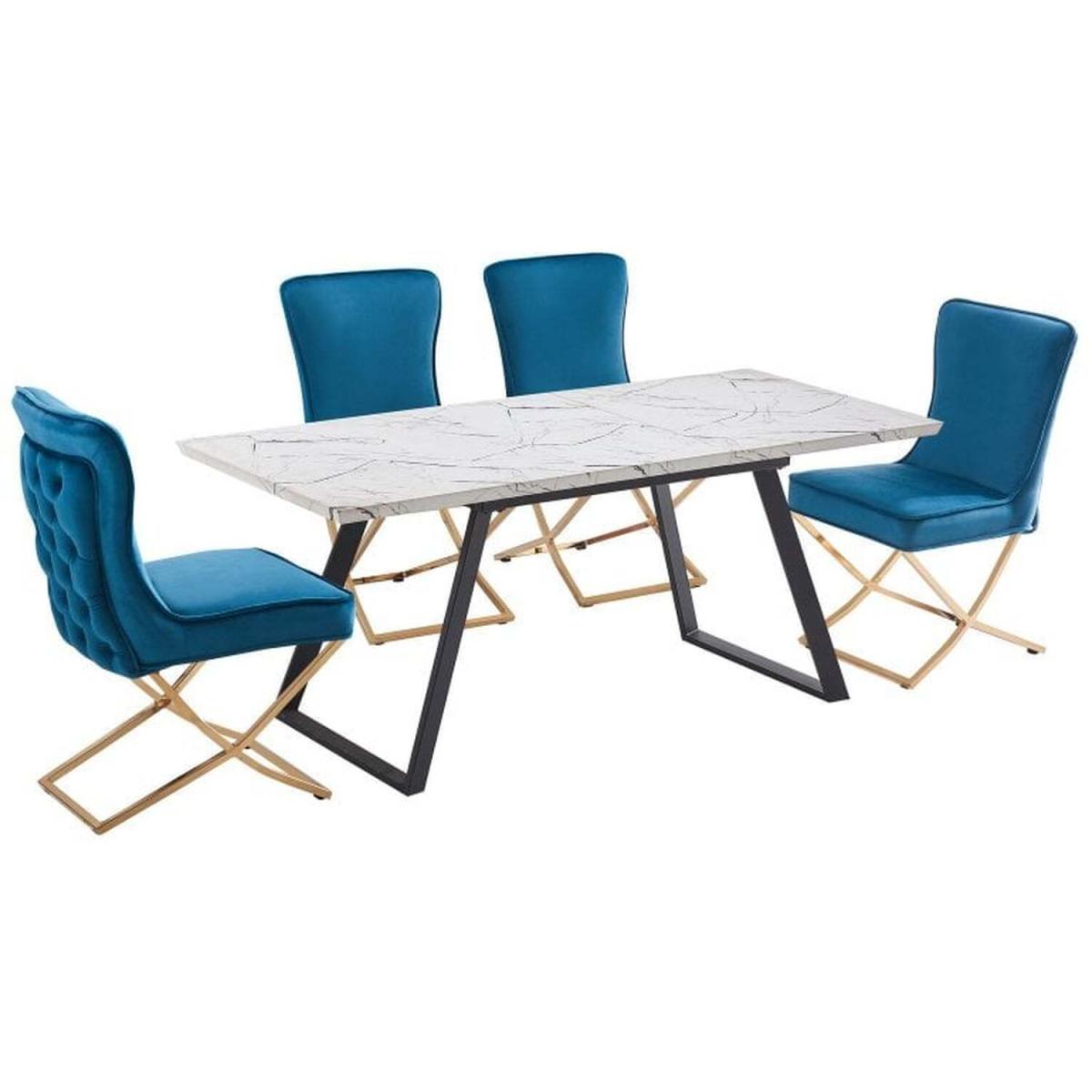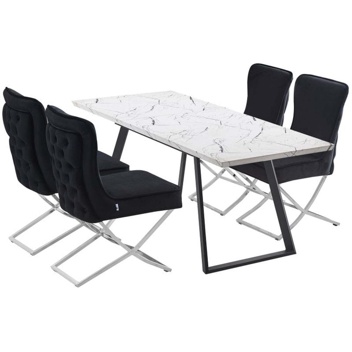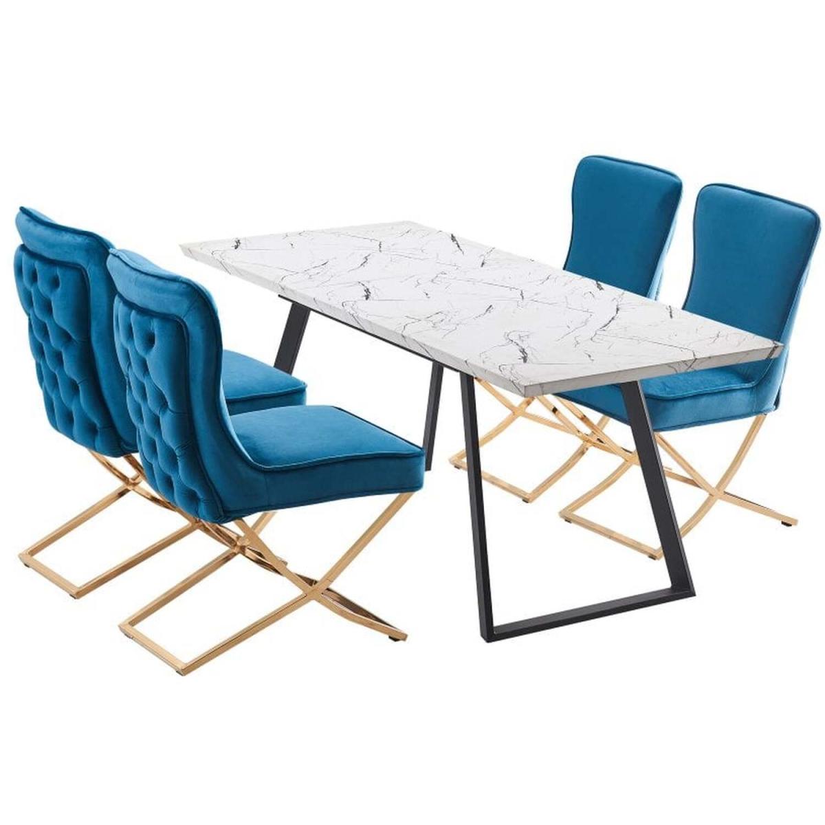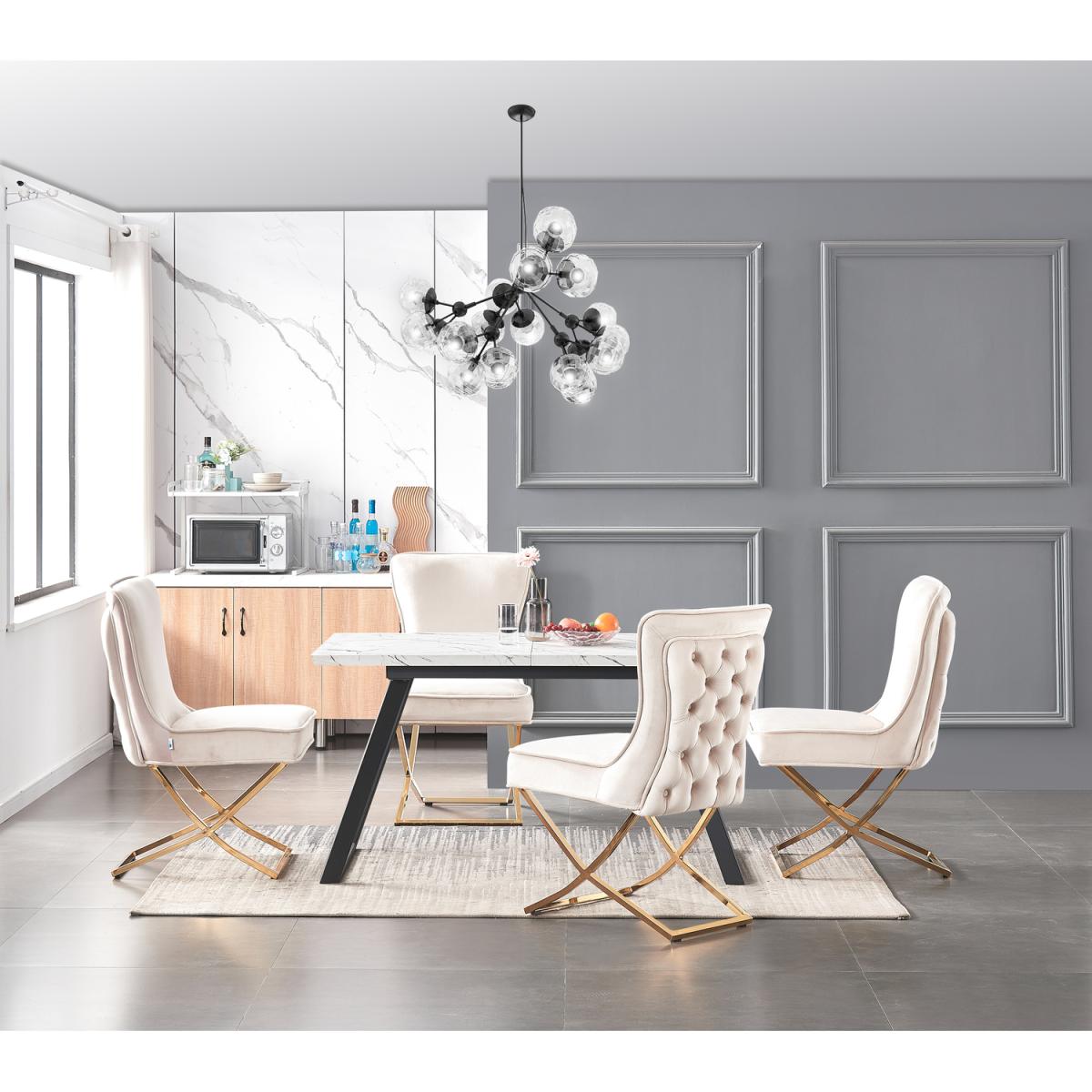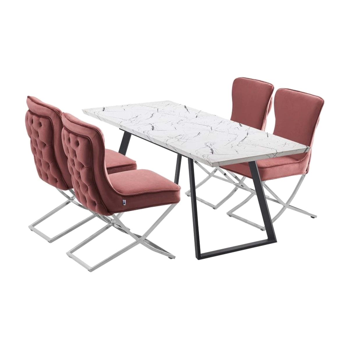 A space-saving innovative and highly recommended Trafalgar Toga LUX Dining Set combined with a Dining table that is extendable from 140cm long to 180cm long giving you that extra space when you need it. The metal legs provide, not just sturdy support but, a stunning and unique design feature that will get your guests talking. Its luxury yet simple design will elevate your dining space to a new level. A perfect table for everyday family mealtimes, as well as an excellent table for grownup dinner gatherings. Come with the Trafalgar Lux Velvet Dining Chairs that have been carefully curated with attention to detail and utmost precision. Featuring a premium quality soft velvet, a deep buttoned back, and stainless steel chrome or gold legs. Focusing on ensuring the user is met with a supreme level of comfort, we have taken into consideration the overall quality of these pieces. Upholstered in a plush polyester velvet and a high-quality density foam, a button tufted back with a diamond shape pattern and fiber seat ensures comfort levels are premium.