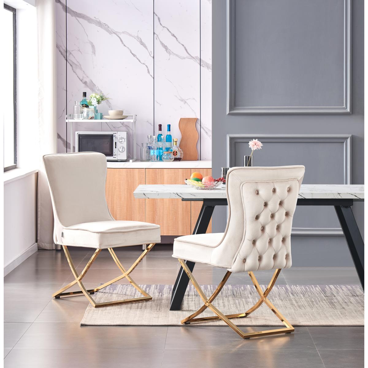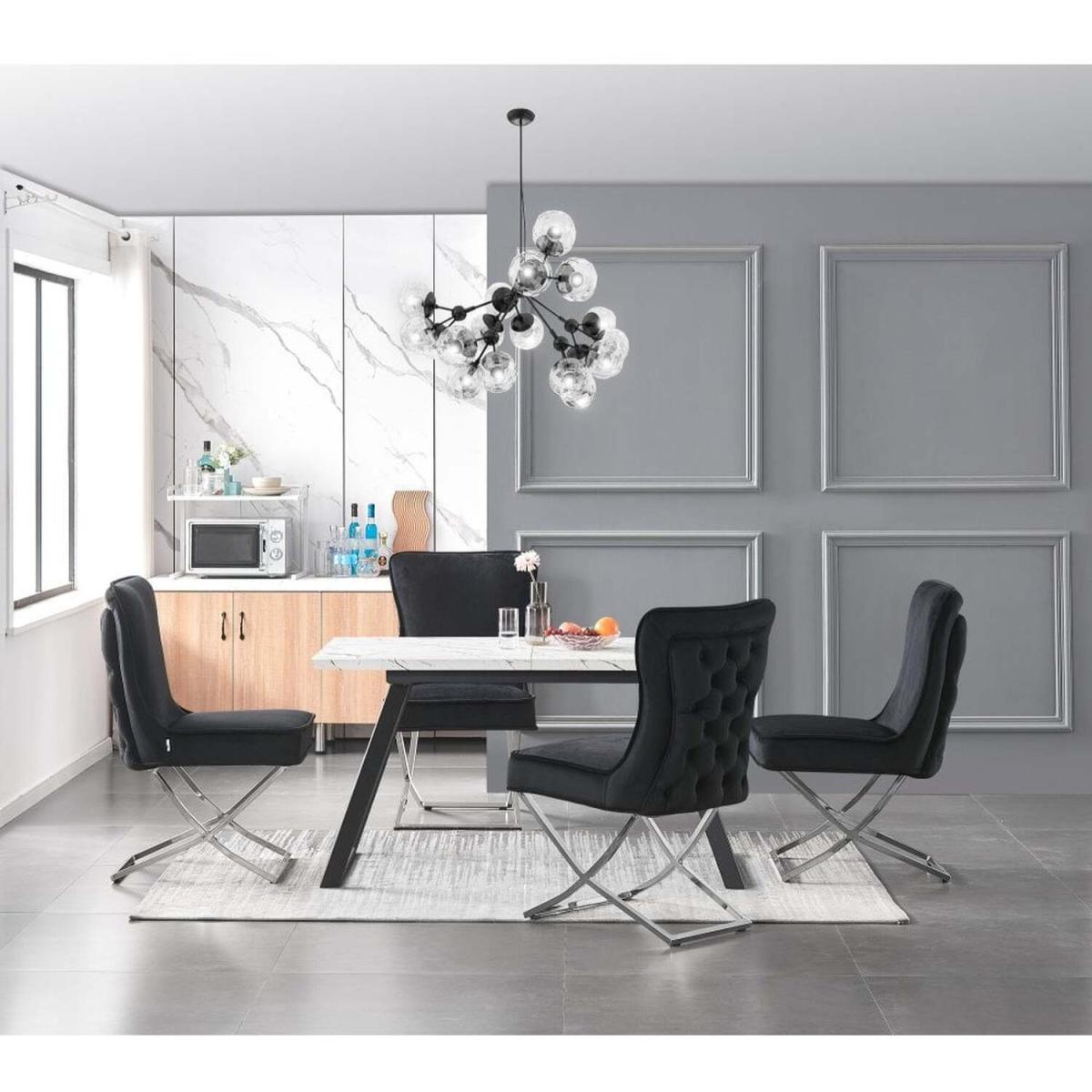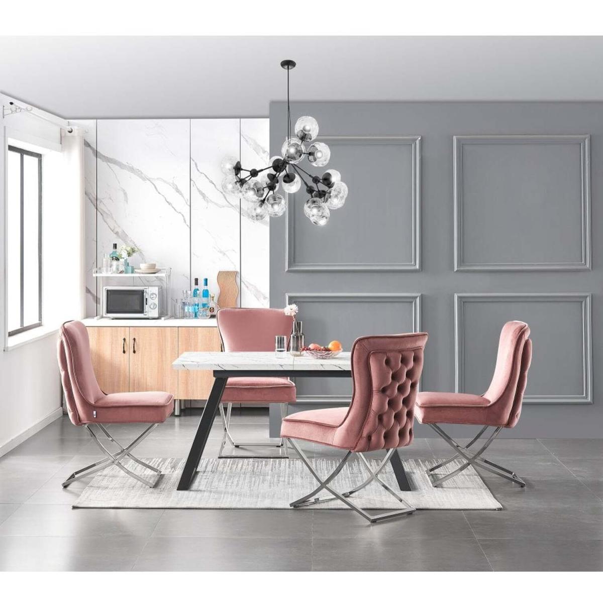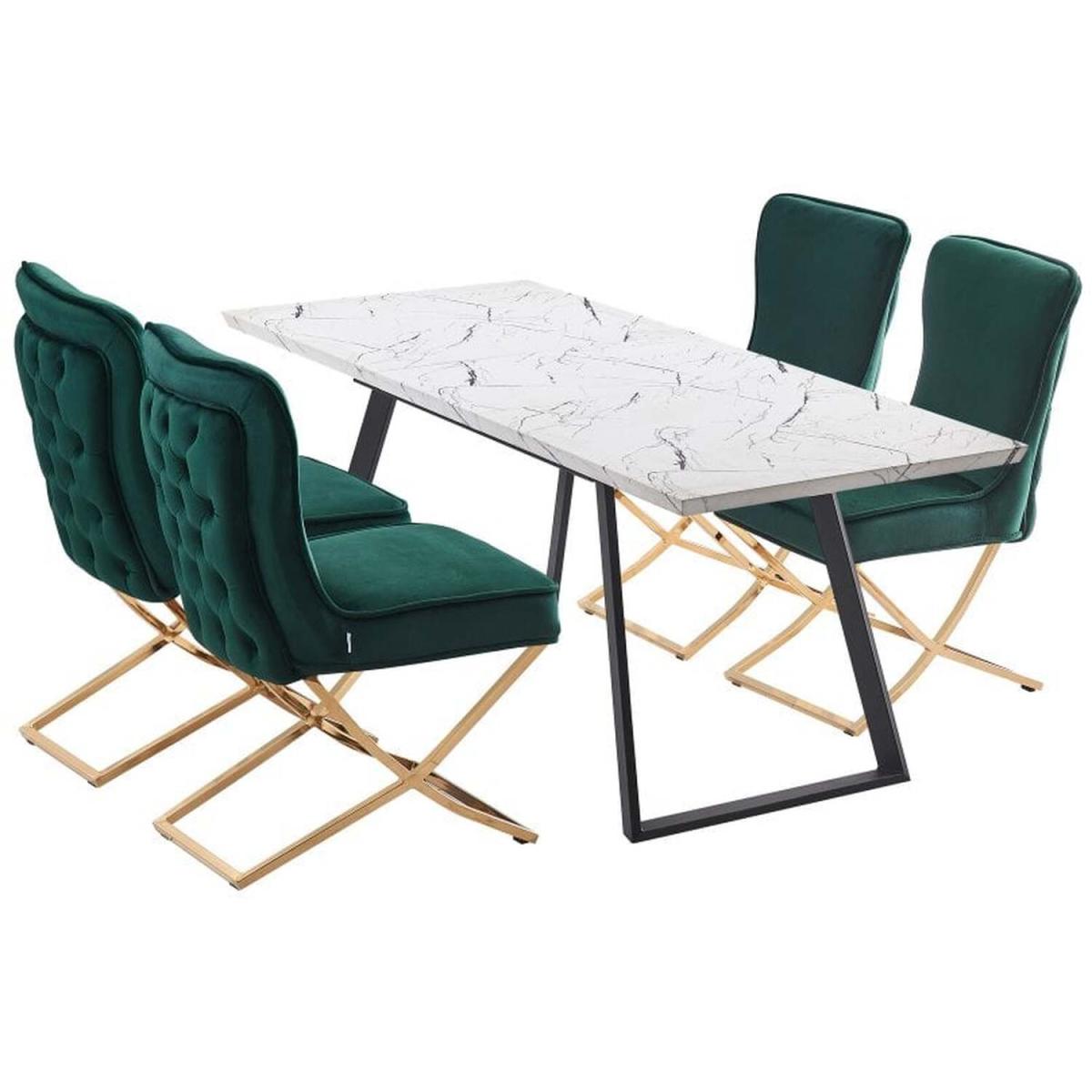 A space-saving innovative and highly recommended Trafalgar Toga LUX Dining Set combined with a Dining table that is extendable from 140cm long to 180cm long giving you that extra space when you need it. The metal legs provide, not just sturdy support but, a stunning and unique design feature that will get your guests talking. Its luxury yet simple design will elevate your dining space to a new level. A perfect table for everyday family mealtimes, as well as an excellent table for grownup dinner gatherings. Come with the Trafalgar Lux Velvet Dining Chairs that have been carefully curated with attention to detail and utmost precision. Featuring a premium quality soft velvet, a deep buttoned back, and stainless steel chrome or gold legs. Focusing on ensuring the user is met with a supreme level of comfort, we have taken into consideration the overall quality of these pieces. Upholstered in a plush polyester velvet and a high-quality density foam, a button tufted back with a diamond shape pattern and fiber seat ensures comfort levels are premium.