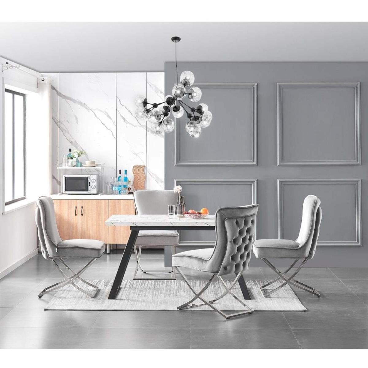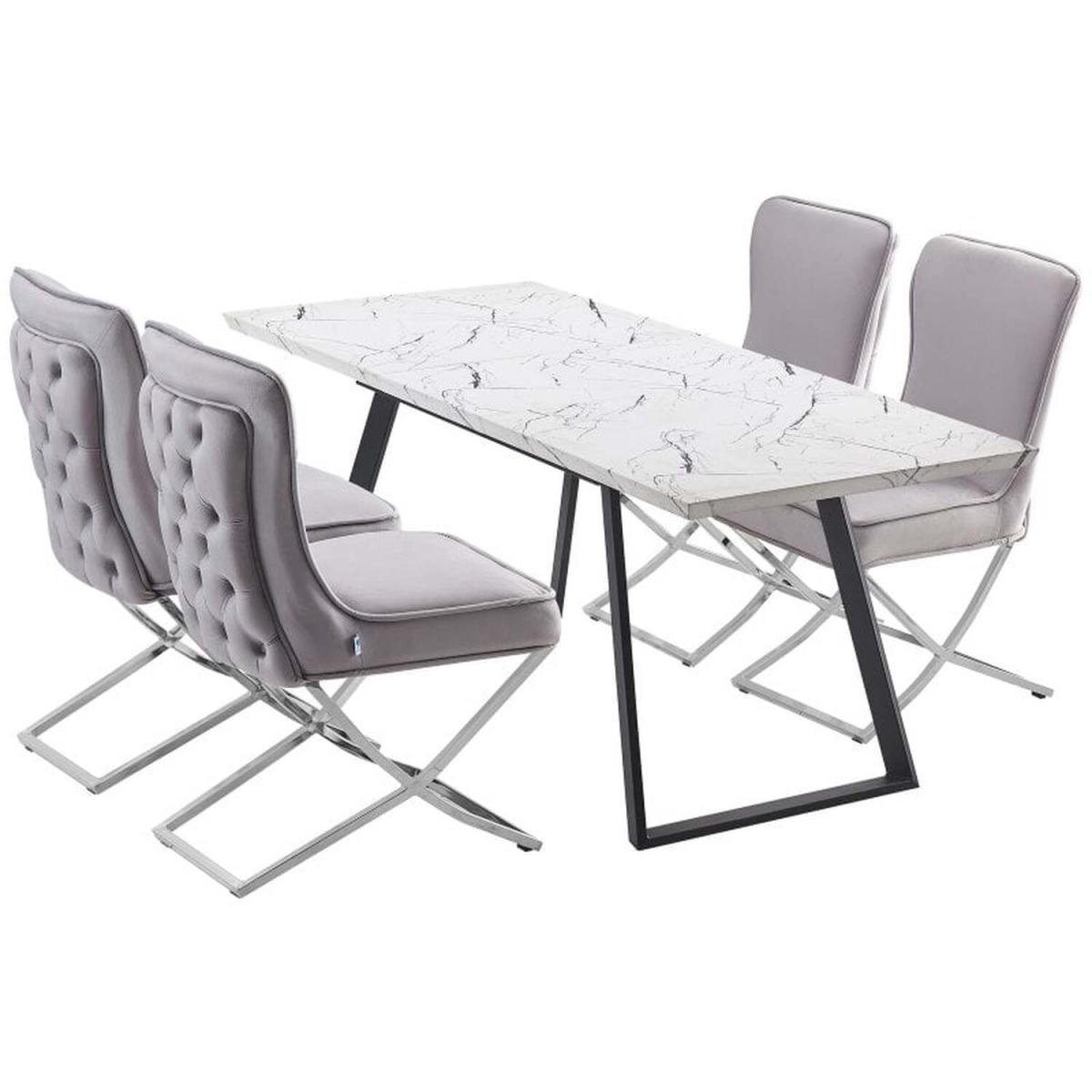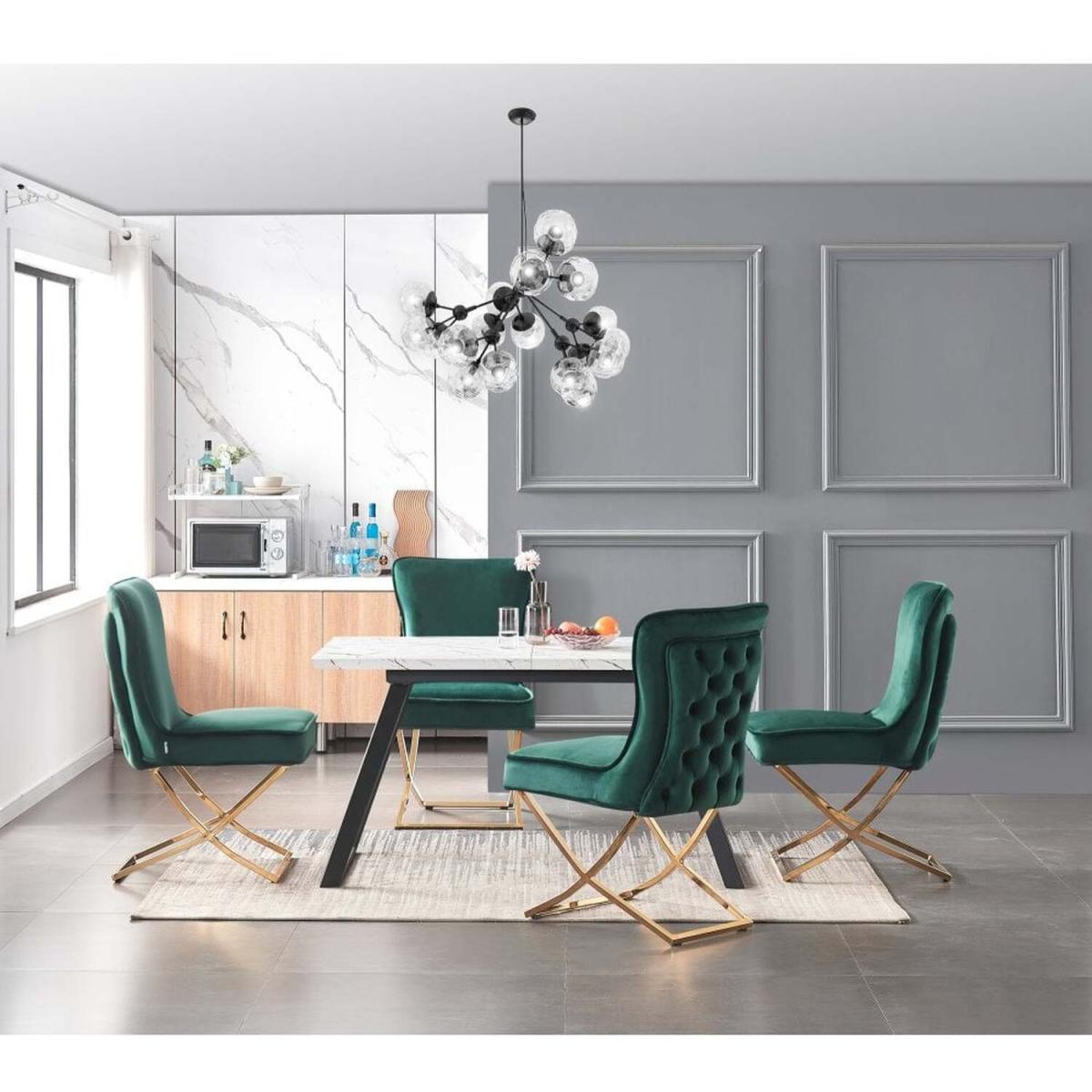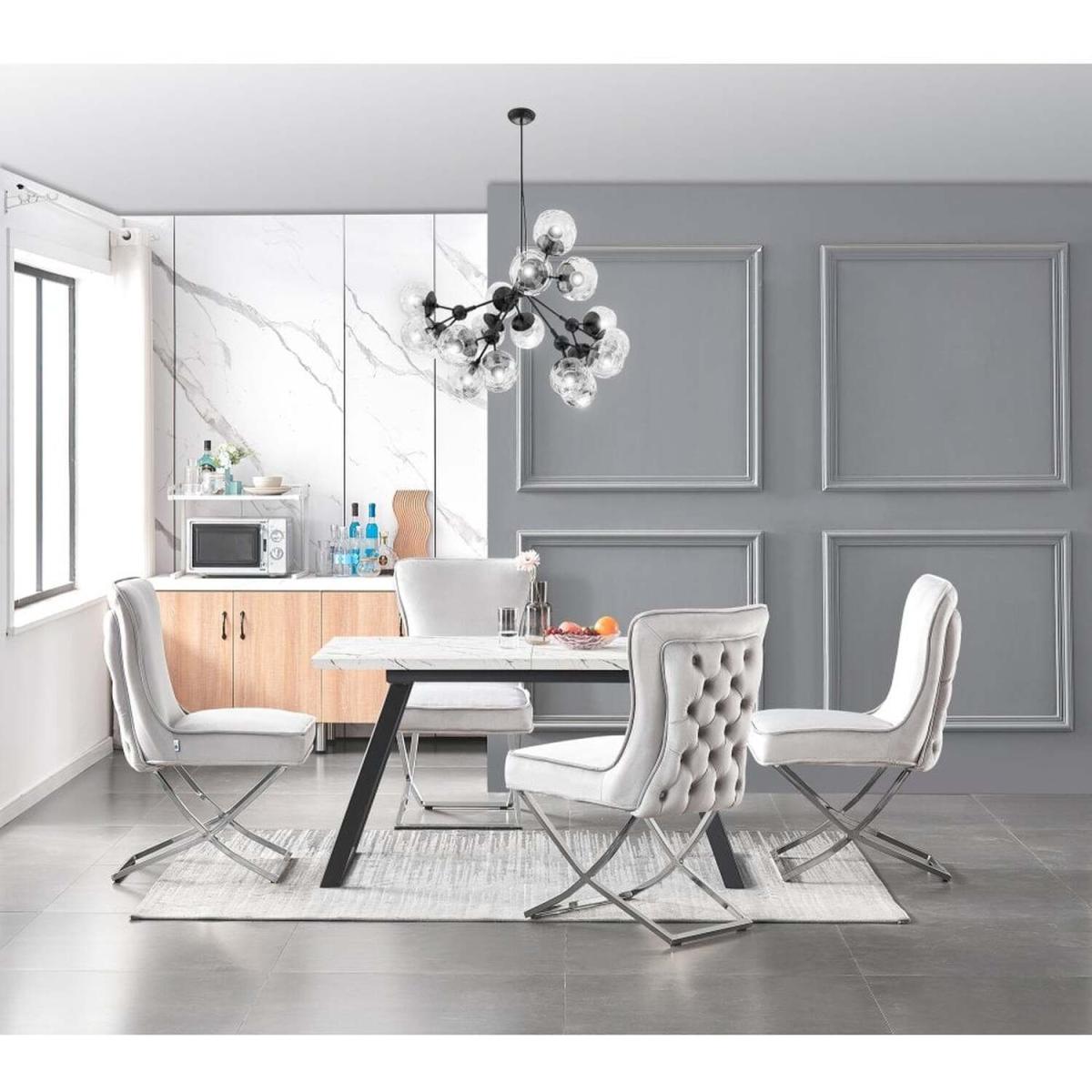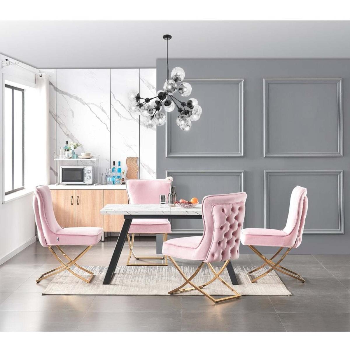 A space-saving innovative and highly recommended Trafalgar Toga LUX Dining Set combined with a Dining table that is extendable from 140cm long to 180cm long giving you that extra space when you need it. The metal legs provide, not just sturdy support but, a stunning and unique design feature that will get your guests talking. Its luxury yet simple design will elevate your dining space to a new level. A perfect table for everyday family mealtimes, as well as an excellent table for grownup dinner gatherings. Come with the Trafalgar Lux Velvet Dining Chairs that have been carefully curated with attention to detail and utmost precision. Featuring a premium quality soft velvet, a deep buttoned back, and stainless steel chrome or gold legs. Focusing on ensuring the user is met with a supreme level of comfort, we have taken into consideration the overall quality of these pieces. Upholstered in a plush polyester velvet and a high-quality density foam, a button tufted back with a diamond shape pattern and fiber seat ensures comfort levels are premium.
