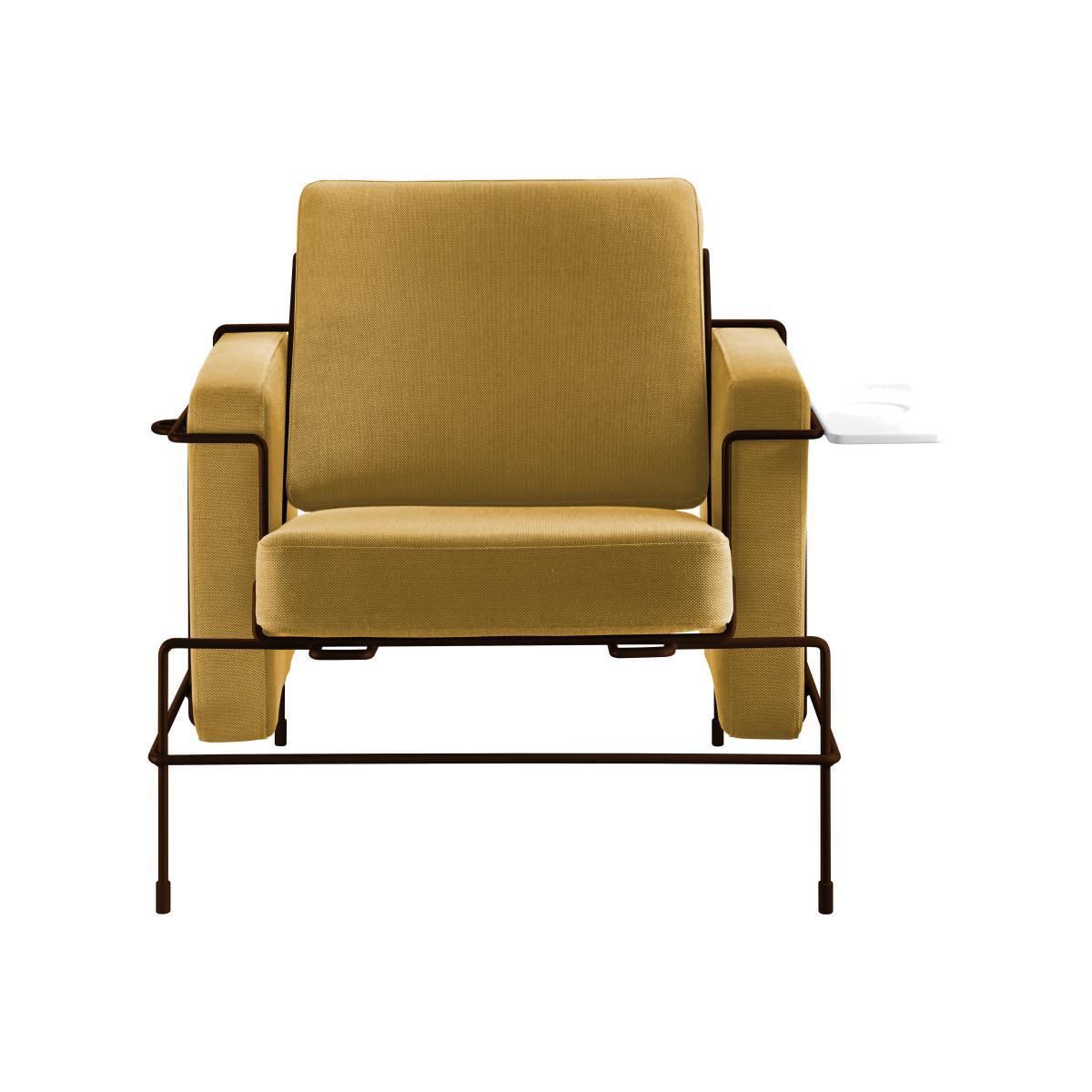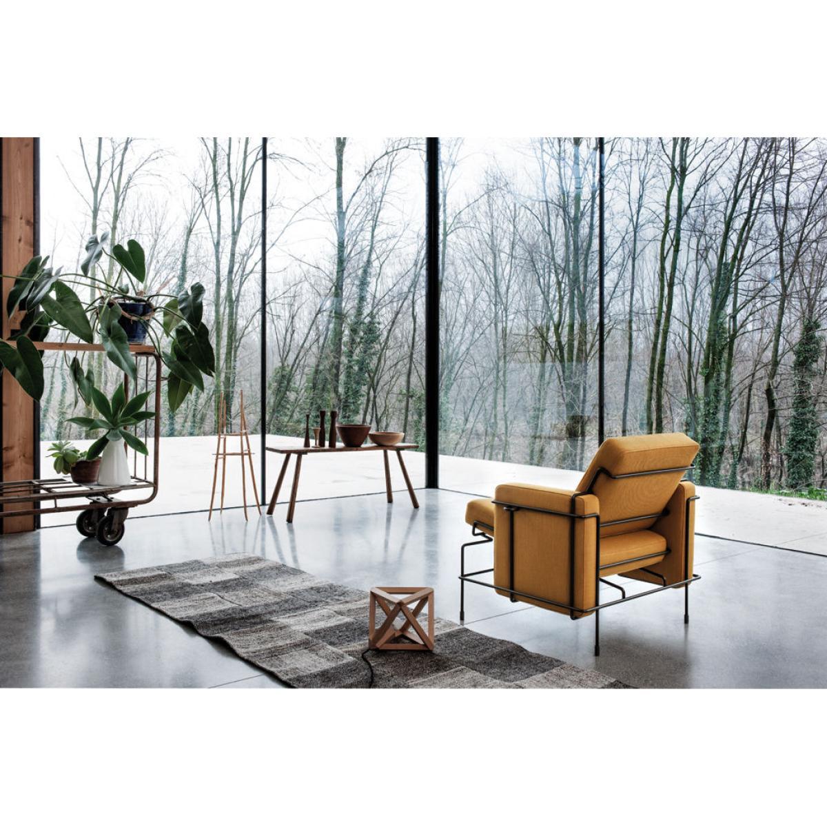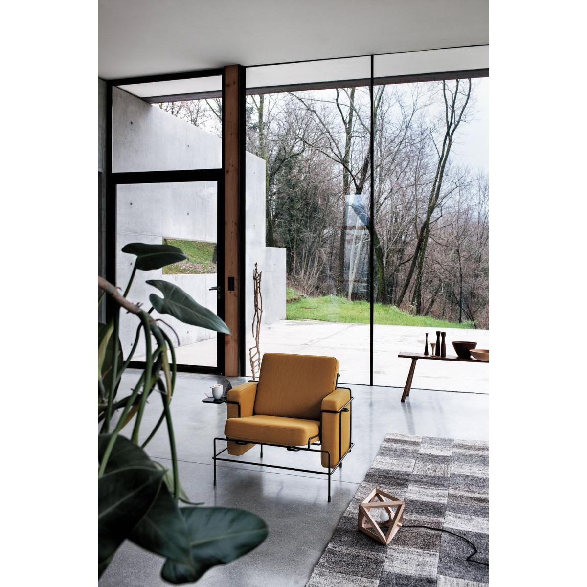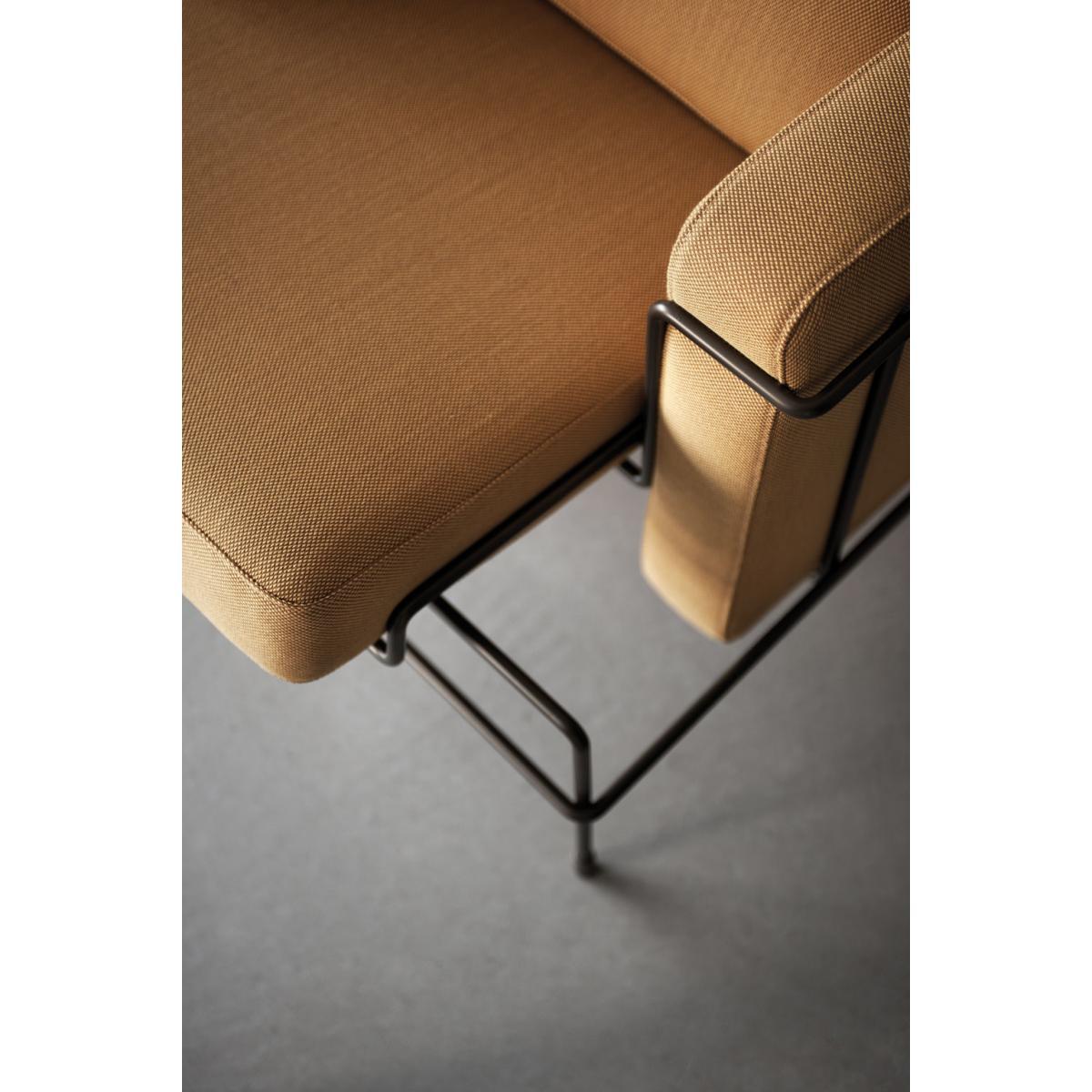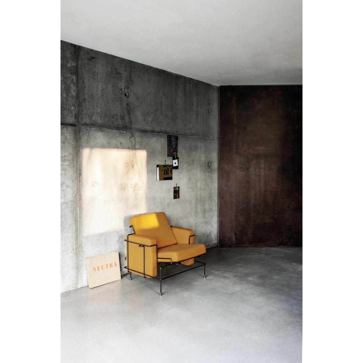 TRAFFIC is a collection of furniture using wire and upholstery. The correlation between the three-dimensional line drawing of the metal rod and the geometric volumes of the cushions marks a significant shift from the common connotation of wire furniture. The unassuming simplicity of its conception impart a pleasant casualness. The refinement of detailing and carefully tailored proportions stimulate a resounding elegance. The inherent logic of construction creates a formal grammar which allows for a number of functional declinations to form the TRAFFIC collection: an armchair, a two seater sofa, a small bench (which also serves as ottoman), a chaise longue. All pieces are available with upholstery in fabric or leather. The metal structure is either powder coated (in high gloss colours) or chrome plated.