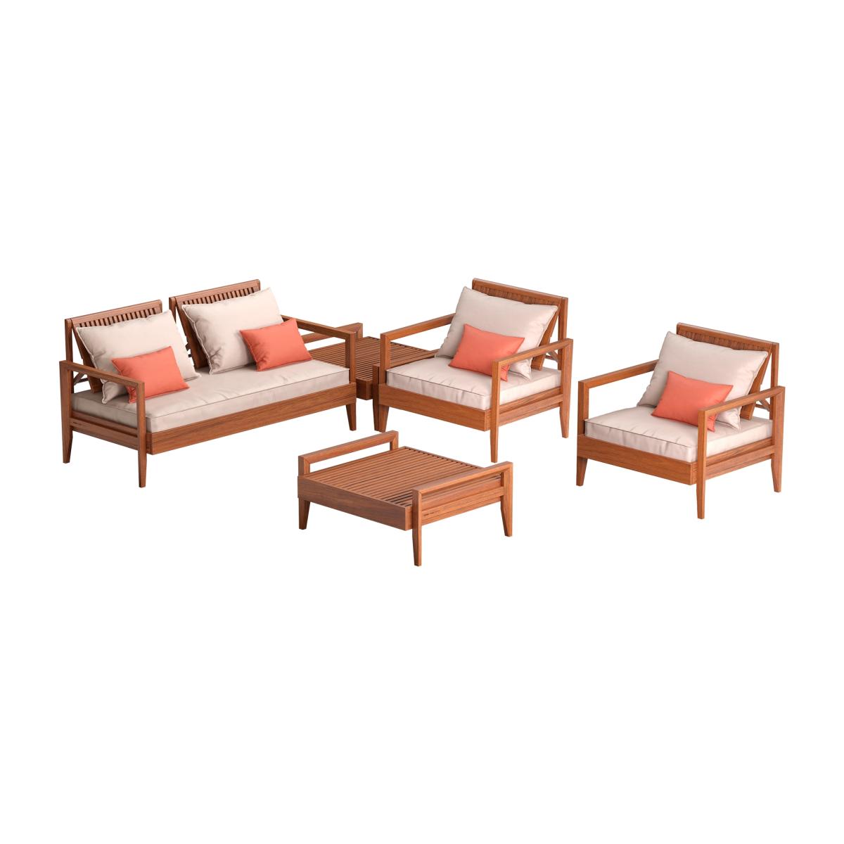 Get your garden summer ready with this Tramontina Mood 5 Piece Lounge Set, comprising of 2 lounge chairs, 1 2 seater lounge chair and 2 coffee tables. The lounge chairs and 2 seater lounge chair features a reclining backrest that can easily be adjusted to four different angles for ultimate comfort for you and your guests. Crafted from long lasting Jatoba wood which ensure a greater outdoor performance throughout all seasons of the year. The cushions which come with this set have been made with waterproof fabrics, offering resistant to weather such as rain and sun-proof and designed with a mix of neutral cream and orange tones for that summer fix. Care and Use: This set is suitable for both indoor and outdoor use, however we do recommend that you cover or store it undercover during adverse weather.