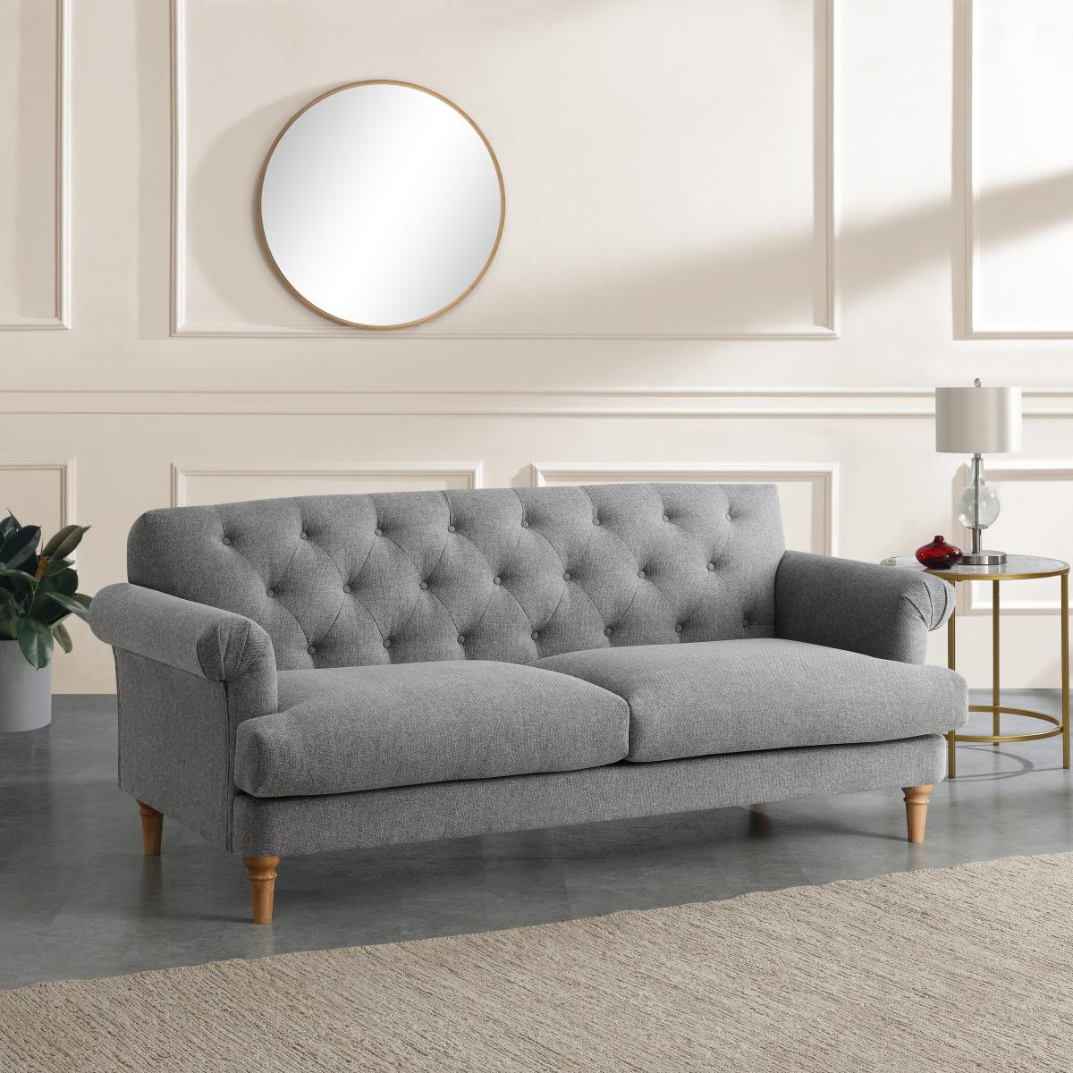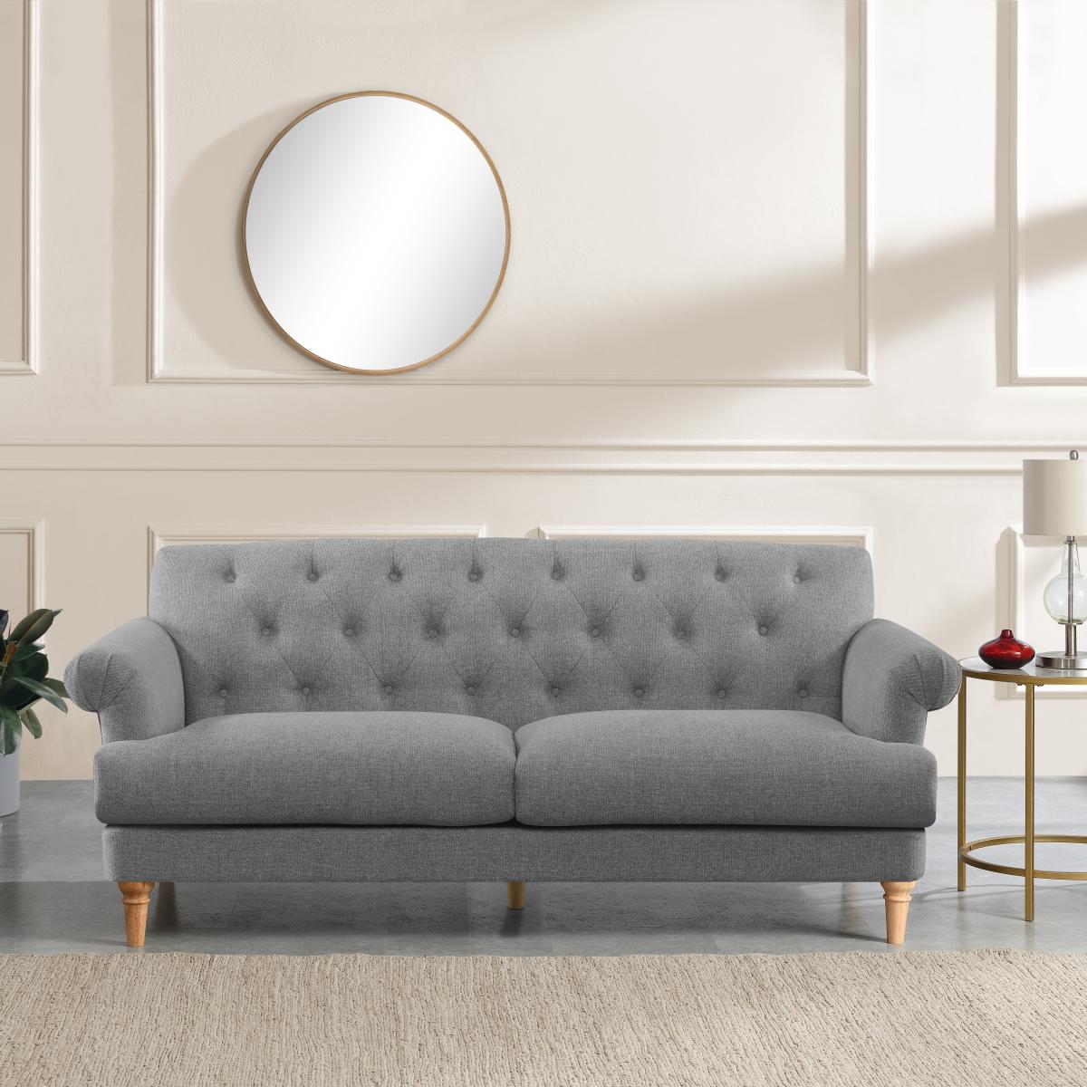 I really like the Trance fabric three-seater sofa in grey because of its versatile and timeless design. It works particularly well in both contemporary and classic interiors, providing a neutral base that can be dressed up with colourful cushions or kept sleek and understated. The soft grey tone is ideal for creating a calm, sophisticated lounge or living space. Styling tips include pairing it with textured throws or patterned cushions for added interest or layering with a colourful rug to add warmth. Its clean lines make it adaptable, ensuring it fits seamlessly into various colour schemes and interior styles, whether modern minimalist or a more traditional setting.