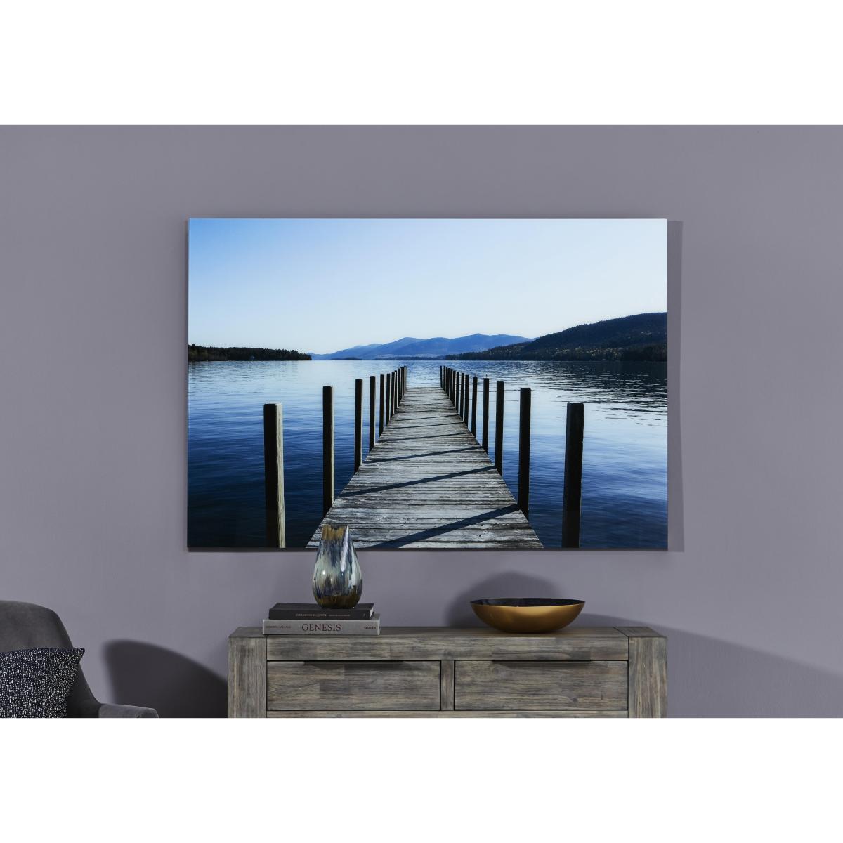 A study in light, colour and perspective, Tranquility Bay leads the eye into a calm and relaxing place where not even a breeze disturbs the still waters of this beautiful bay. This stunning photograph has been reproduced and captured under glass in an advanced technological process that serves to enhance the impact of this large scale piece. A stunning waterscape view with rustic wooden pier. Amazing photographic image. Photograph has been reproduced onto 6mm toughened glass. Unique hanging mounts ensures it hangs perfectly flat. Large scale – a full 160cm wide. An impressive piece for any feature wall. Designed to evoke feelings of calmness and relaxation. Dimensions. Width: 160cm (63 inches). Depth: 2cm (0.5 inch). Height: 110cm (43inches).