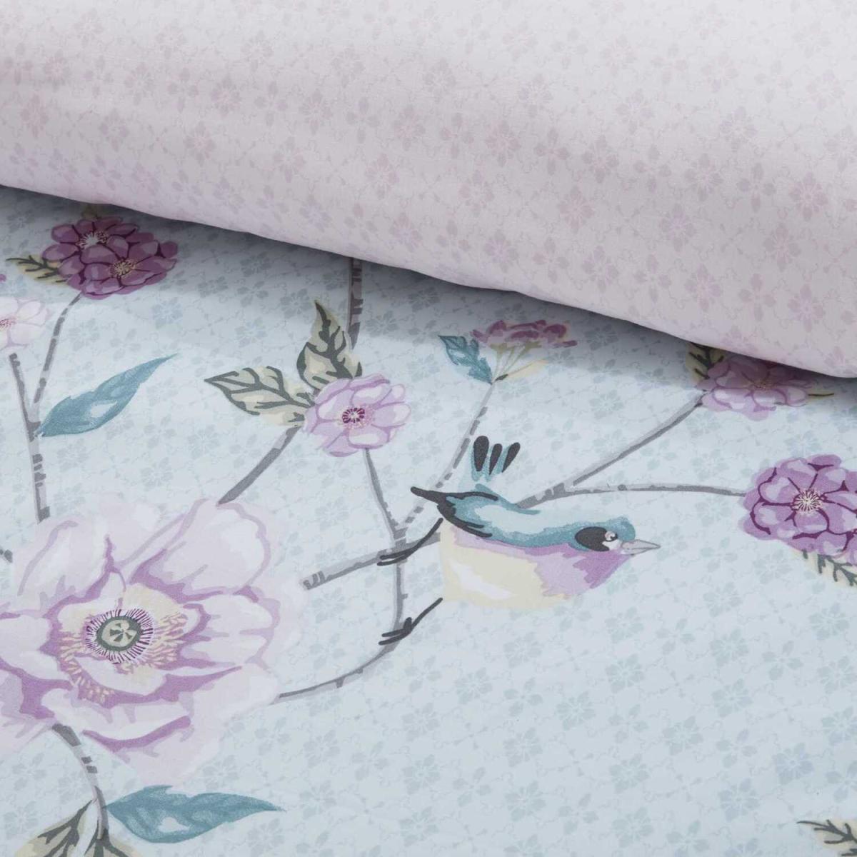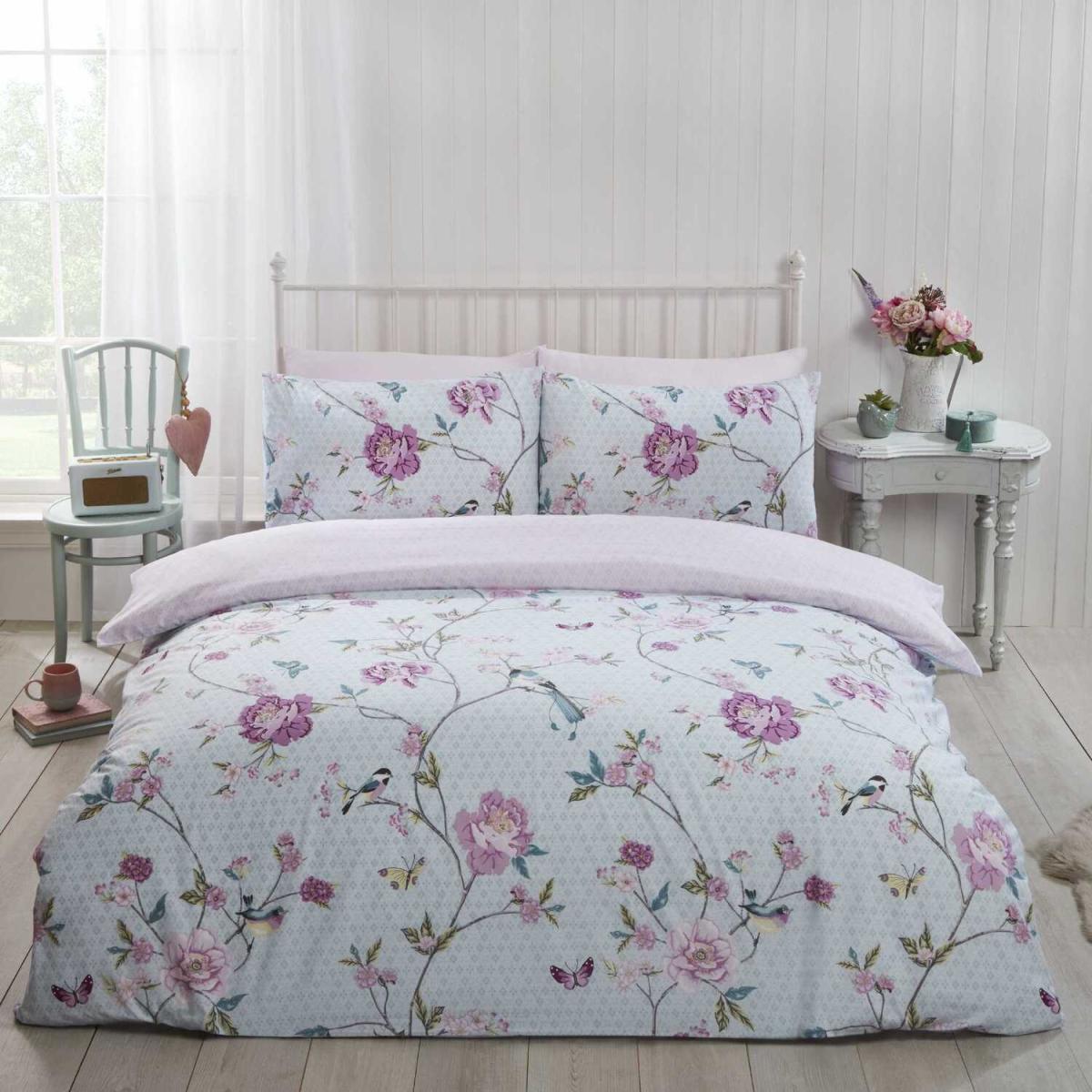 This stunning tranquillity duvet cover features a vintage style bird and trailing flower design. Featuring shades of pink and purple on a soft duck egg background, it will bring a fresh approach to any bedroom. Also available in pink.