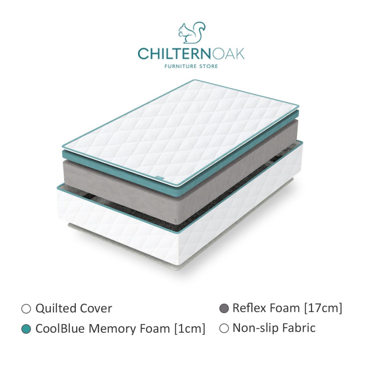 Our highly-affordable Tranquility Standard Plus is proof that a memory foam mattress and ultimately a good night’s sleep doesn’t need to cost the earth. A large layer of responsive reflex foam, often found in orthopaedic mattresses, is overlayed with Cool Blue memory foam, specifically designed to prevent excessive moulding around the sleeper, eliminating excessive warmth in the process. The luxurious look and feel of memory foam is no longer out of reach, thanks to Chiltern Oak.