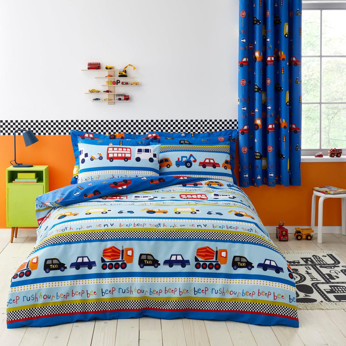 Crafted from soft and durable polycotton and available in a choice of sizes, our novelty duvet cover set features a reversible design with a vehicle pattern and comes with a coordinating pillowcase included.