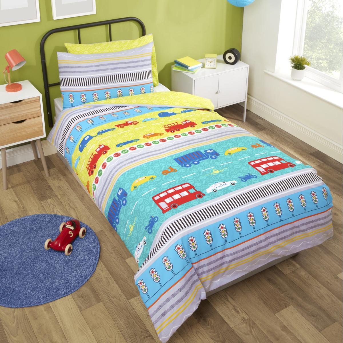 Add a touch of fun to your childs bedroom with this transport themed duvet cover set. Featuring an array of different transports ranging from motorbikes, to lorries, even including aeroplanes as well as both traffic lights and stop and go signs, this duvet cover set will be perfect for any transport mad child.