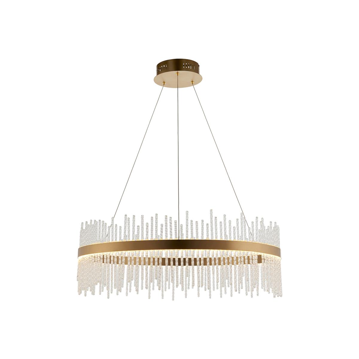 Create a contemporary focal point in any room with the Trapani Brushed Gold Plate and Clear Glass Pendant Ceiling Light. Crafted with sparkling clear glass rods and a gleaming finish, this elegant fixture would be perfect for a formal dining room or inviting entryway.