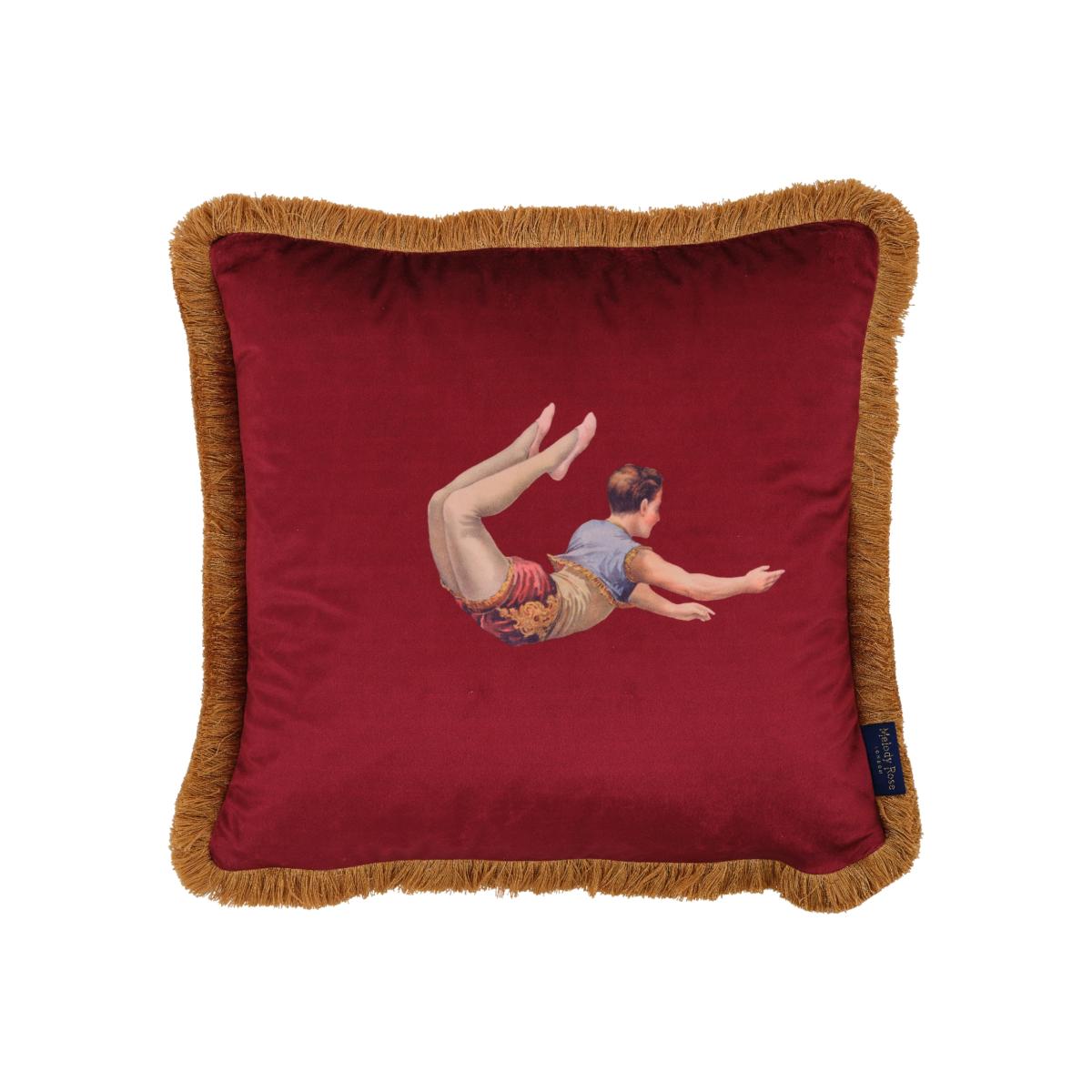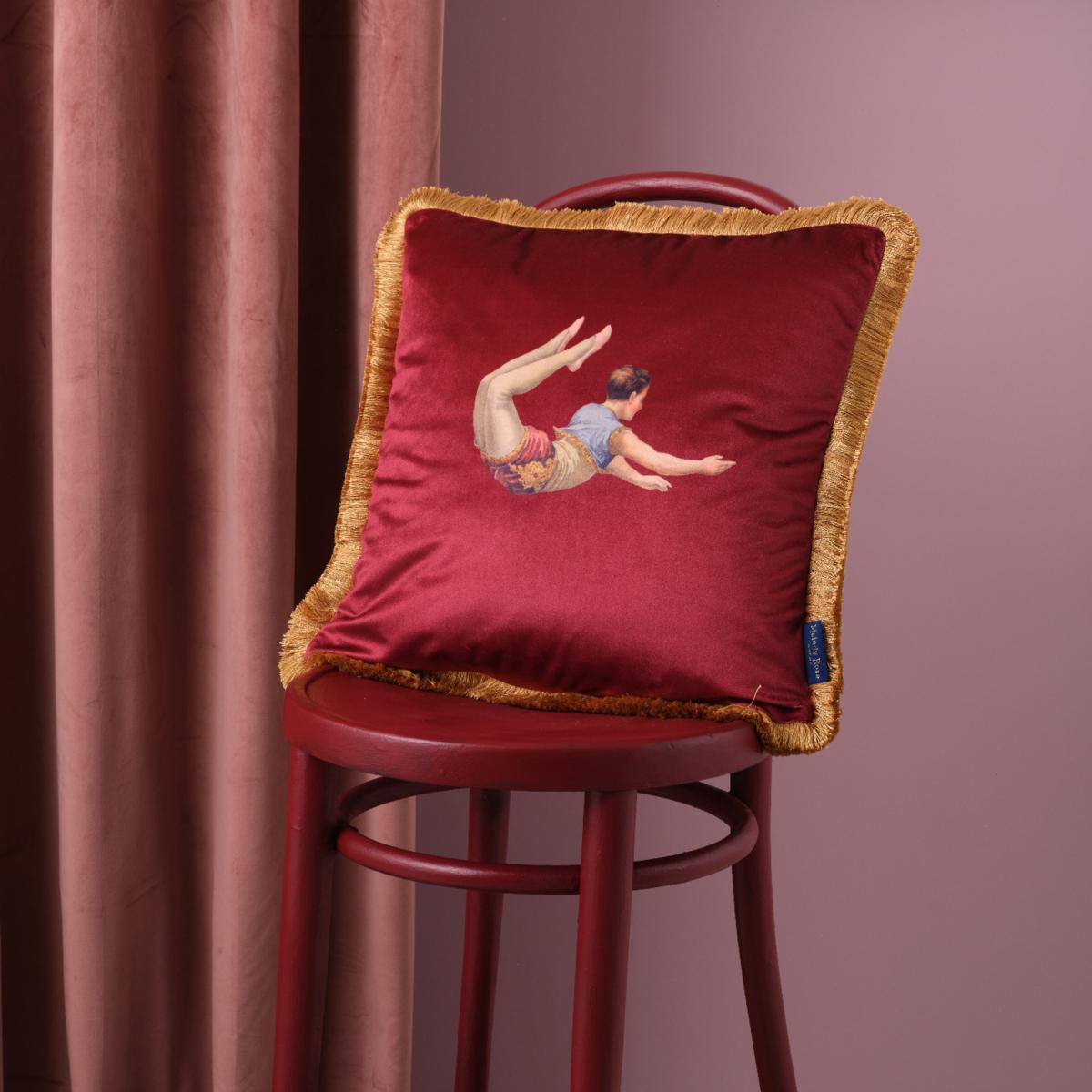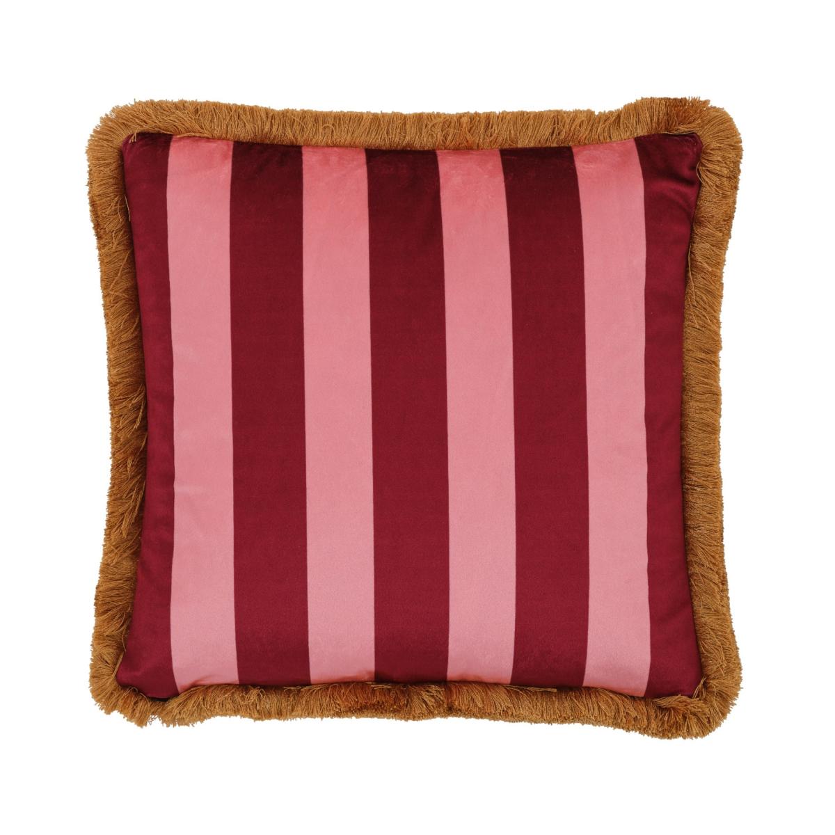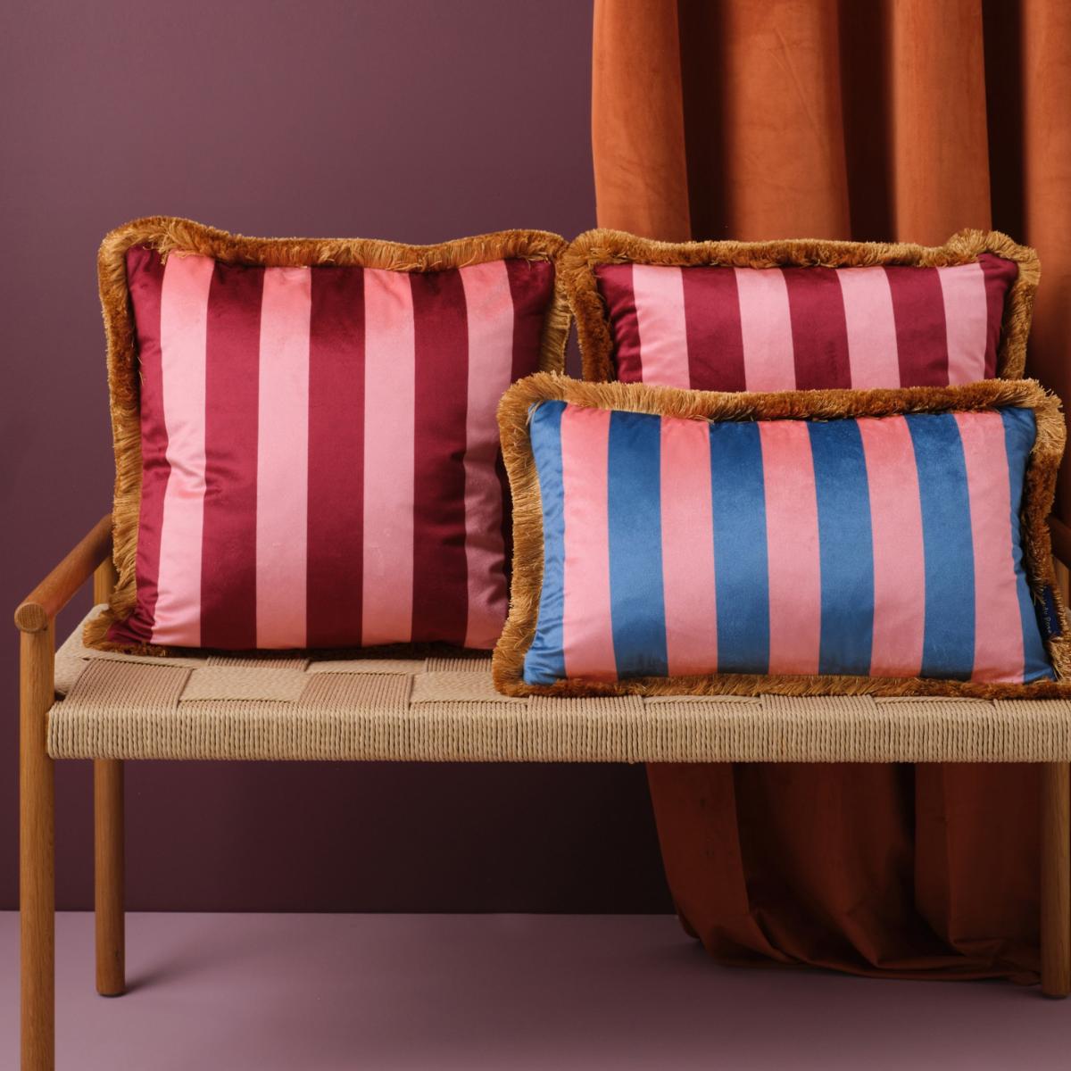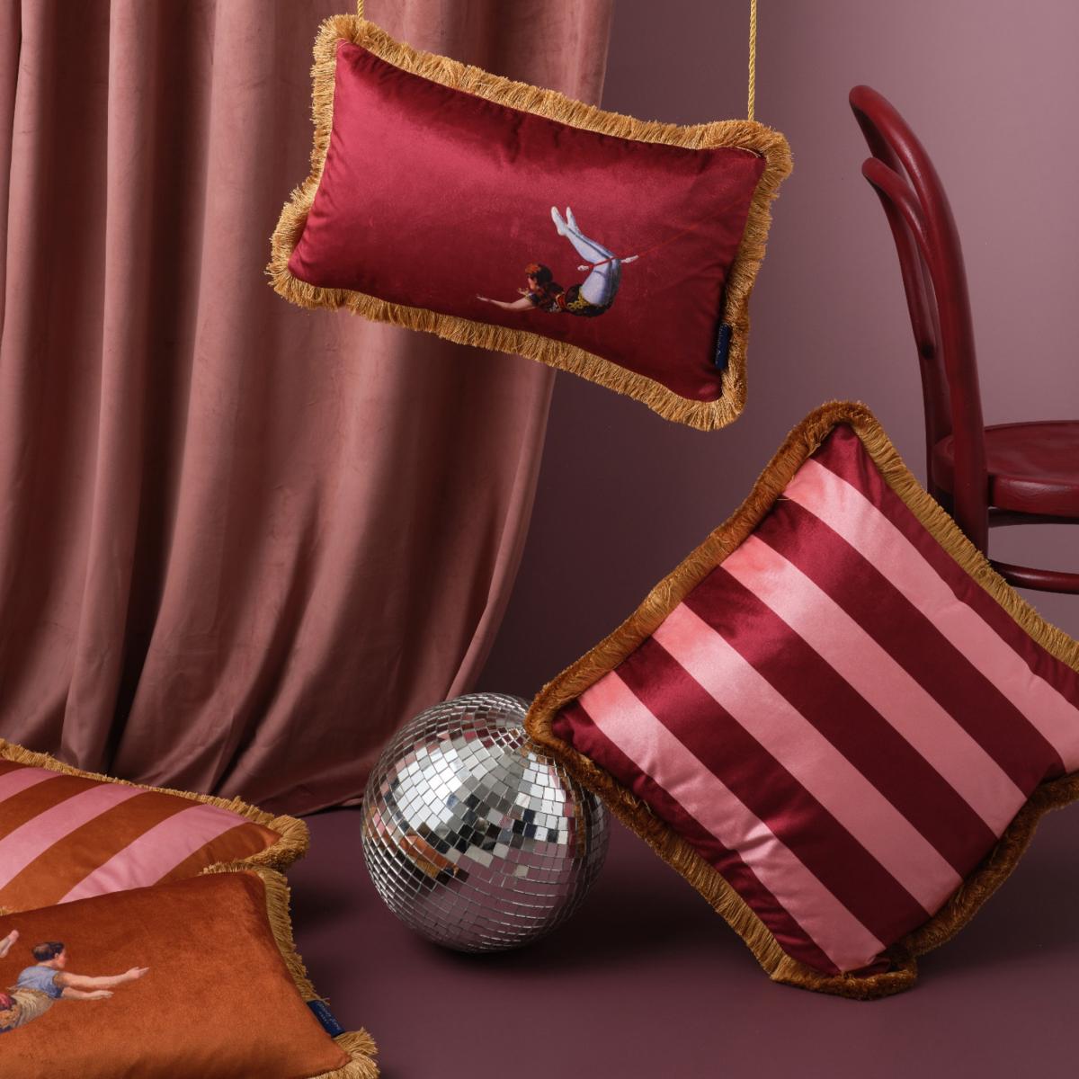 New Stripes sumptuous velvet cushion with a new double-sided design in rich contrasting shades. Featuring colourful wide candy stripes in pink and deep berry red orange on one side and the Trapeze Boy design on the other side for two eye-catching, inter-changeable design choices. Finished with handmade gold fringe ruche for a luxurious finish that perfectly frames the design on both sides of the cushion. Perfect on it’s own, paired with Trapeze Girl design or mix and pile up cushion designs and colours to create your own unique look.