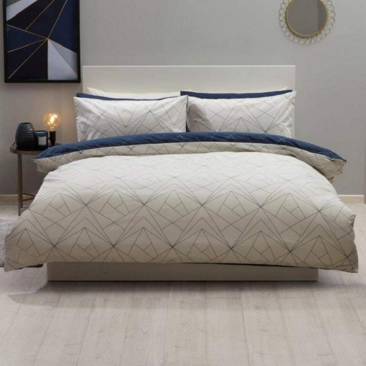 50 cotton 50 Polyester. Thread Count 150. Includes 1 Duvet Cover and 2 Pillowcases (single size includes only 1 pillowcase). Reversible design that features fine lines that intersect at random, on smart background colors, gives this design its modern appeal.