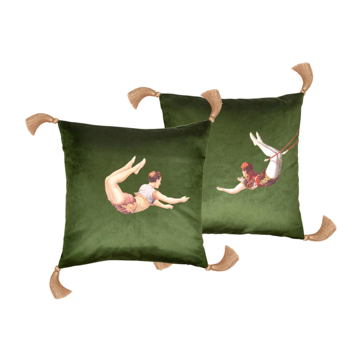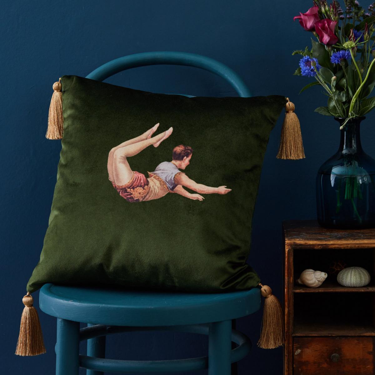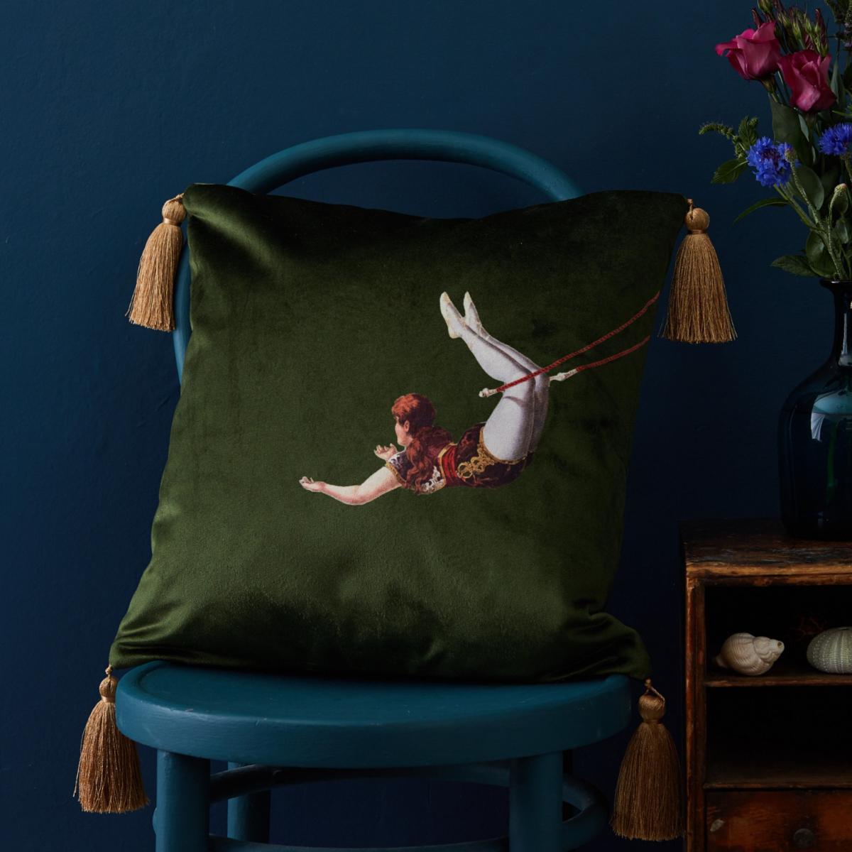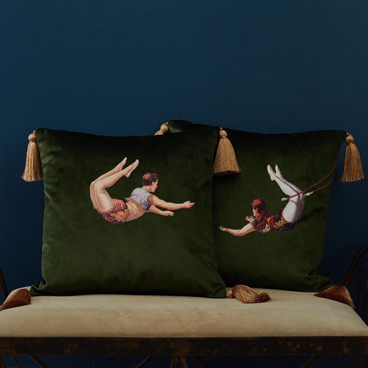 Bring instant colour and texture to you home with a set of two sumptuous velvet cushions in lush meadow green featuring Melody Rose's Trapeze Girl and Boy designs. From the Act of Daring collection, the circus inspired designs celebrate the glamour, colourful costumes and thrill of life under the big top. The pair of cushions will lend a decadent and eclectic touch to any home interior, breathing life into love-worn sofas and chairs. Feature hidden zip and luxurious, handmade golden tassels, the Trapeze Girl and Boy designs are also available in sharkskin grey, deep berry red and burnt orange. Comes wrapped in recyclable bespoke tissue and makes a delightful gift.