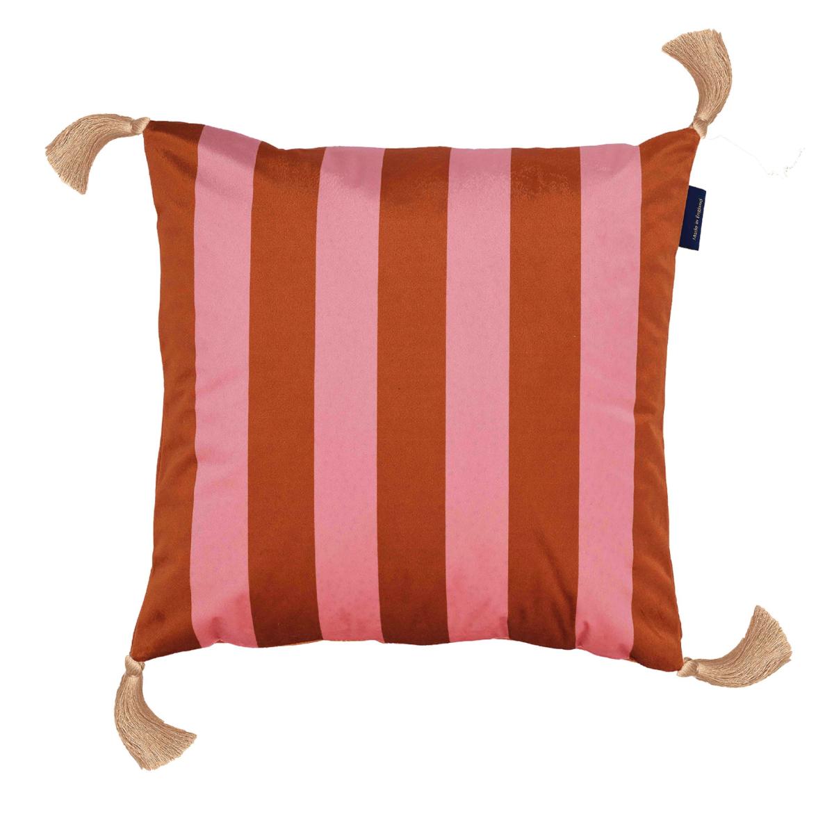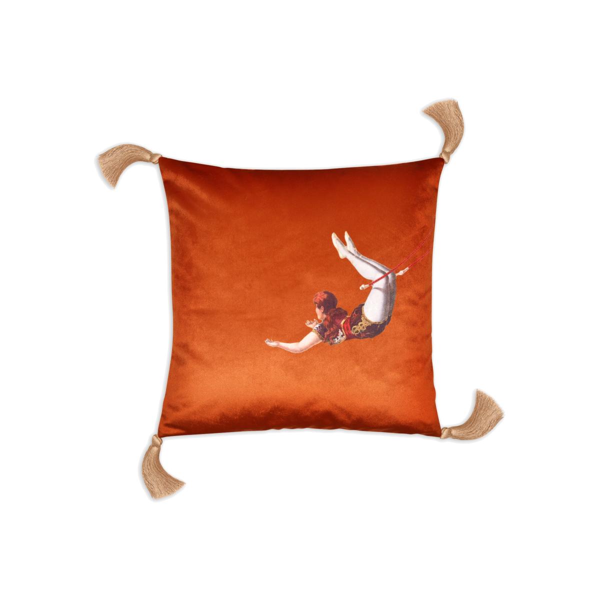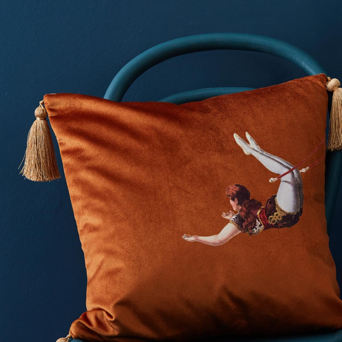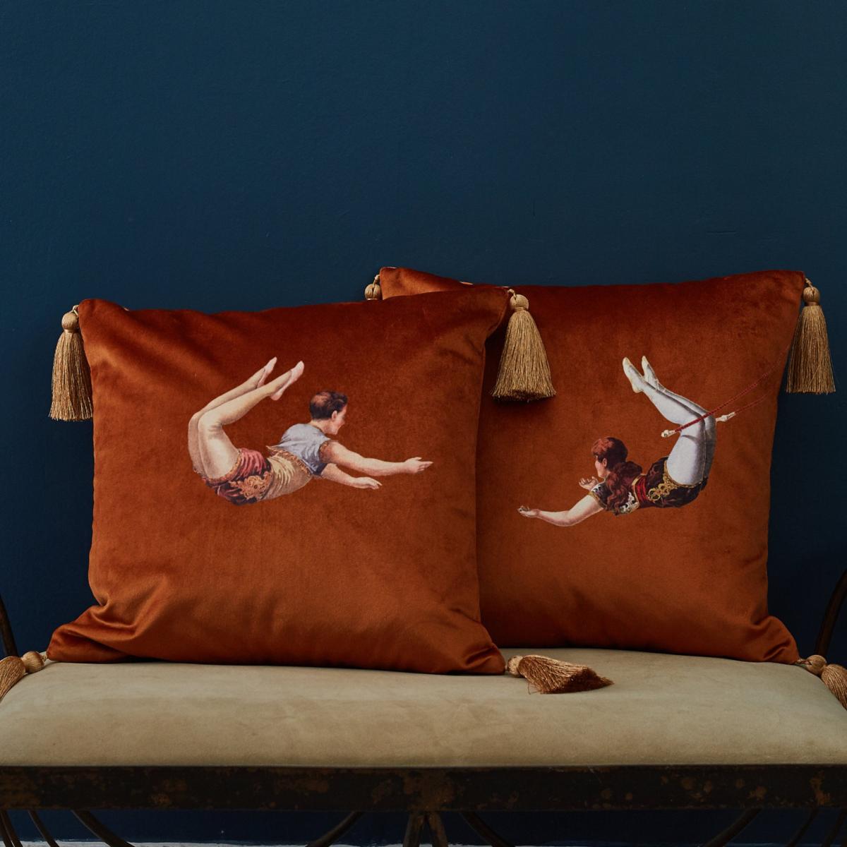 Roll up, Roll up! New double-sided design circus inspired velvet cushion from the Melody Rose Acts of Daring collection. Featuring the Trapeze Girl design in Burnt Orange on one side and new Burnt Orange and Pink wide striped design on the other giving two options for displaying. Perfect on it’s own, paired with Trapeze Boy design or mix and pile up cushion designs and colours to create your own unique look. Made entirely in England, each cushion is finished by hand with elegant burnished gold tassels and features a hidden zip. Trapeze cushions also available in deep berry red, sharkskin grey and lush meadow green. Plump feather inner cushion pad included.