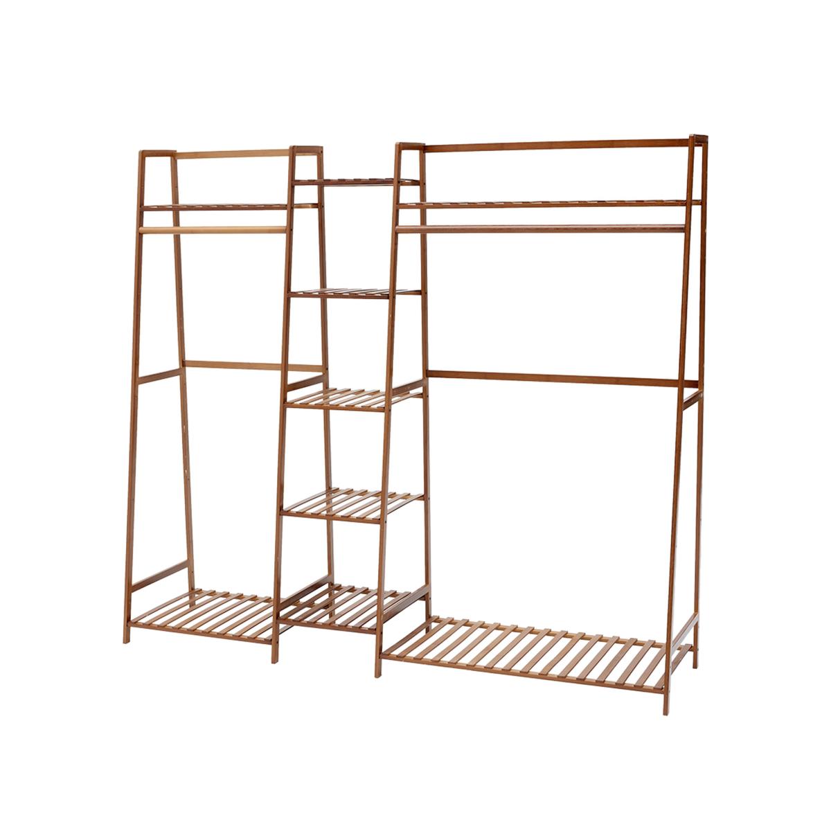This open clothes rack is an excellent way to organise and showcase your wardrobe with style. Designed with two hanging rails joined by a five tier storage shelf in the centre, it offers generous space for garments of all kinds, keeping them neat and ready to wear. Perfect for bedrooms, it adds a touch of elegance while reflecting your personal taste. Crafted from natural bamboo, it provides strength, stability and a rustic charm to any room.